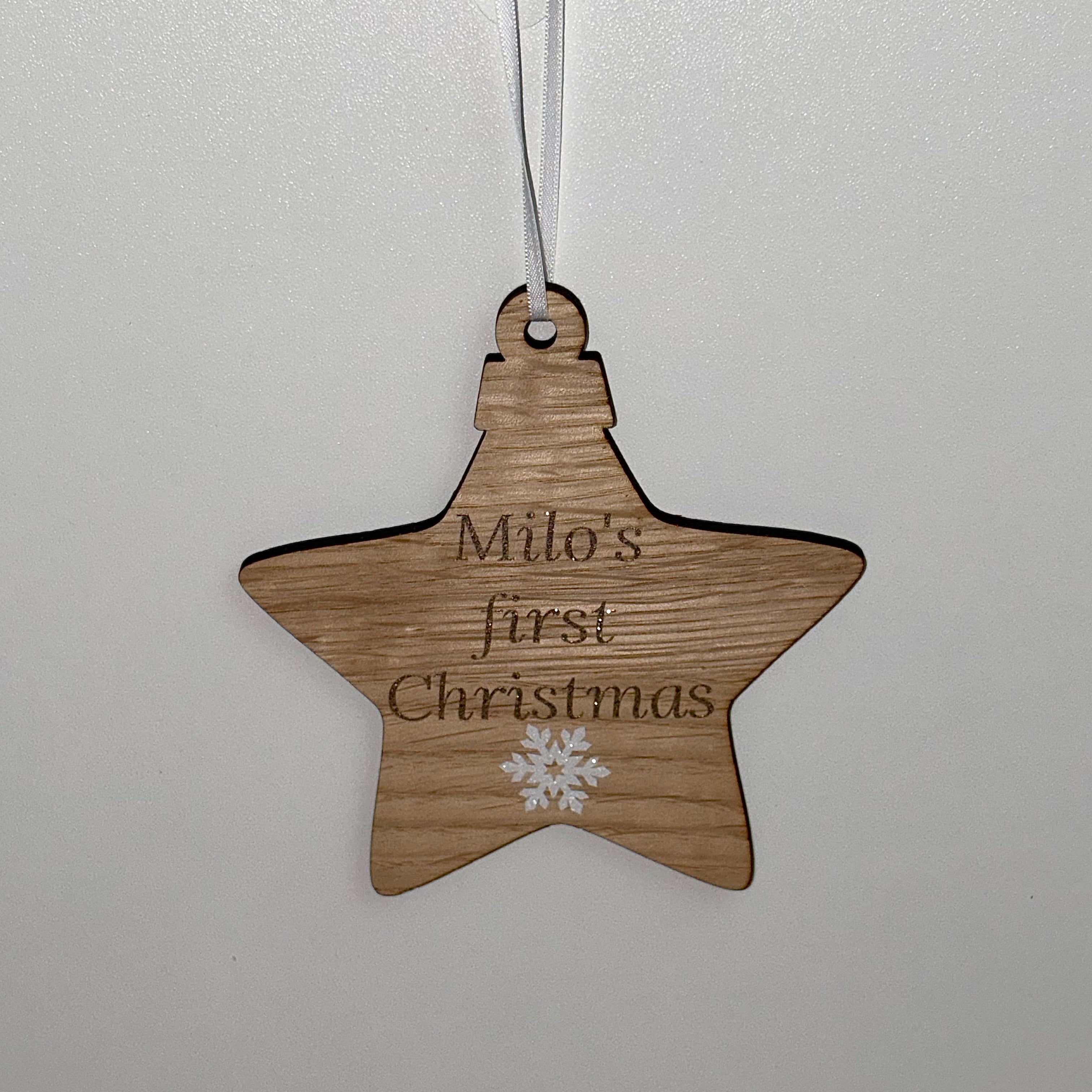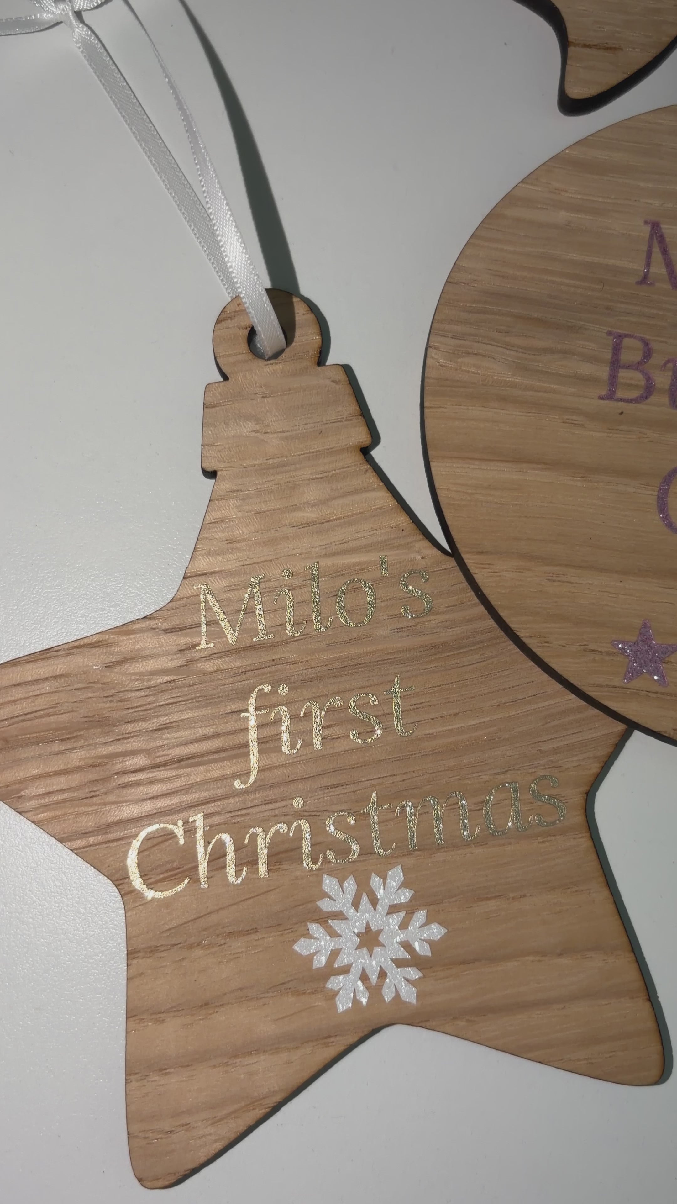 Each bauble is finished with glittery vinyl and includes an option star or snowflake.