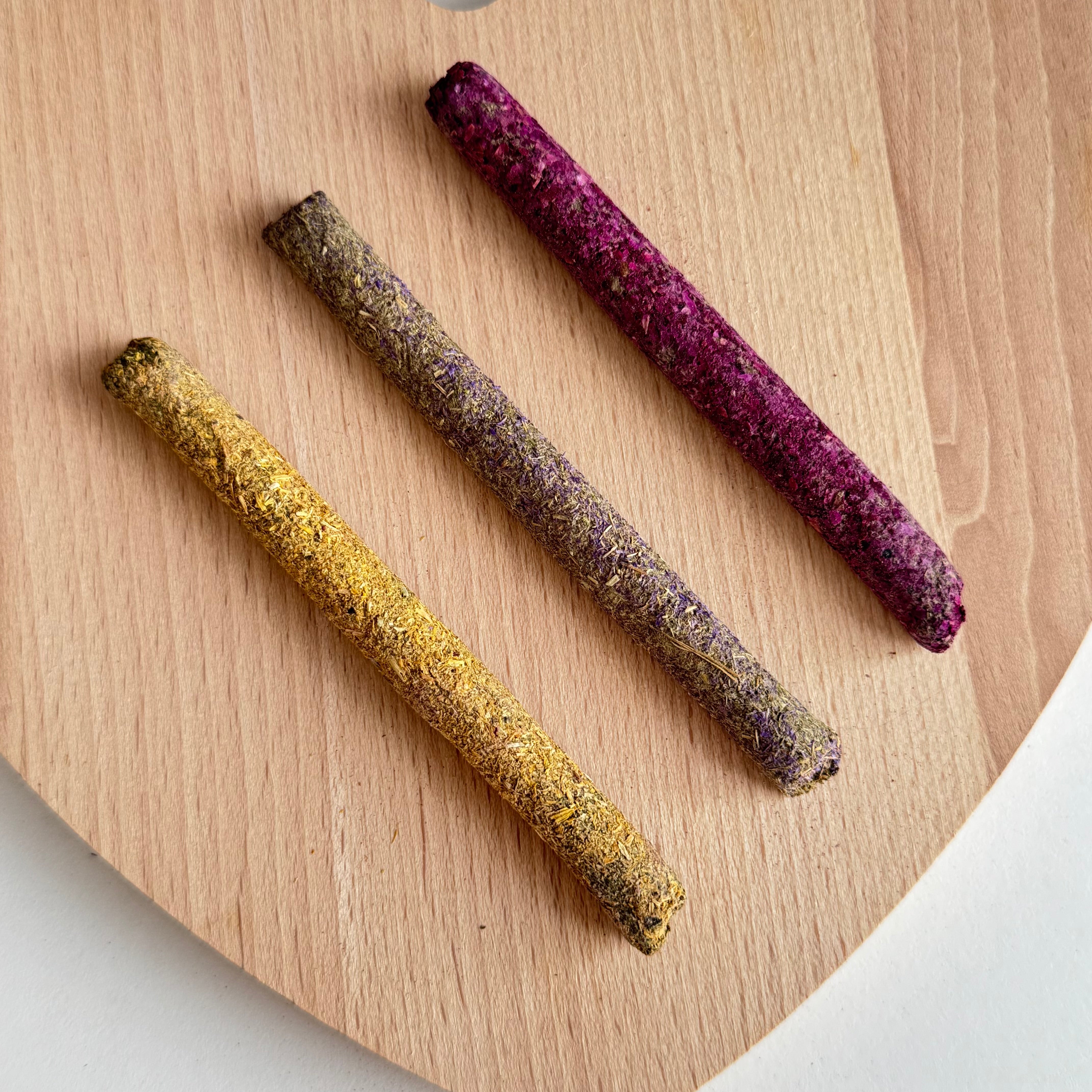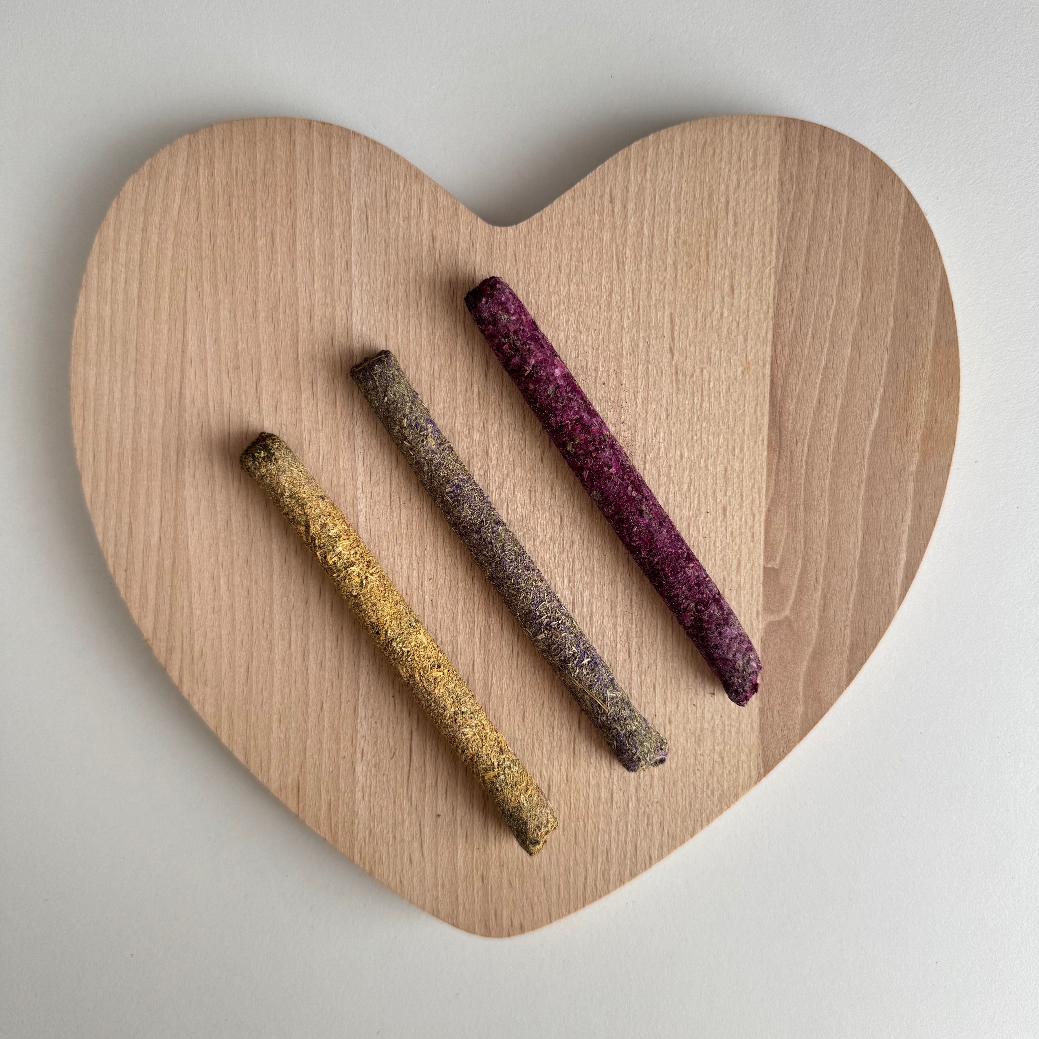 Tasty, high-fibre chews made from 100% natural timothy grass, coated with rose flowers, blue mallow flowers and marigold flowers.