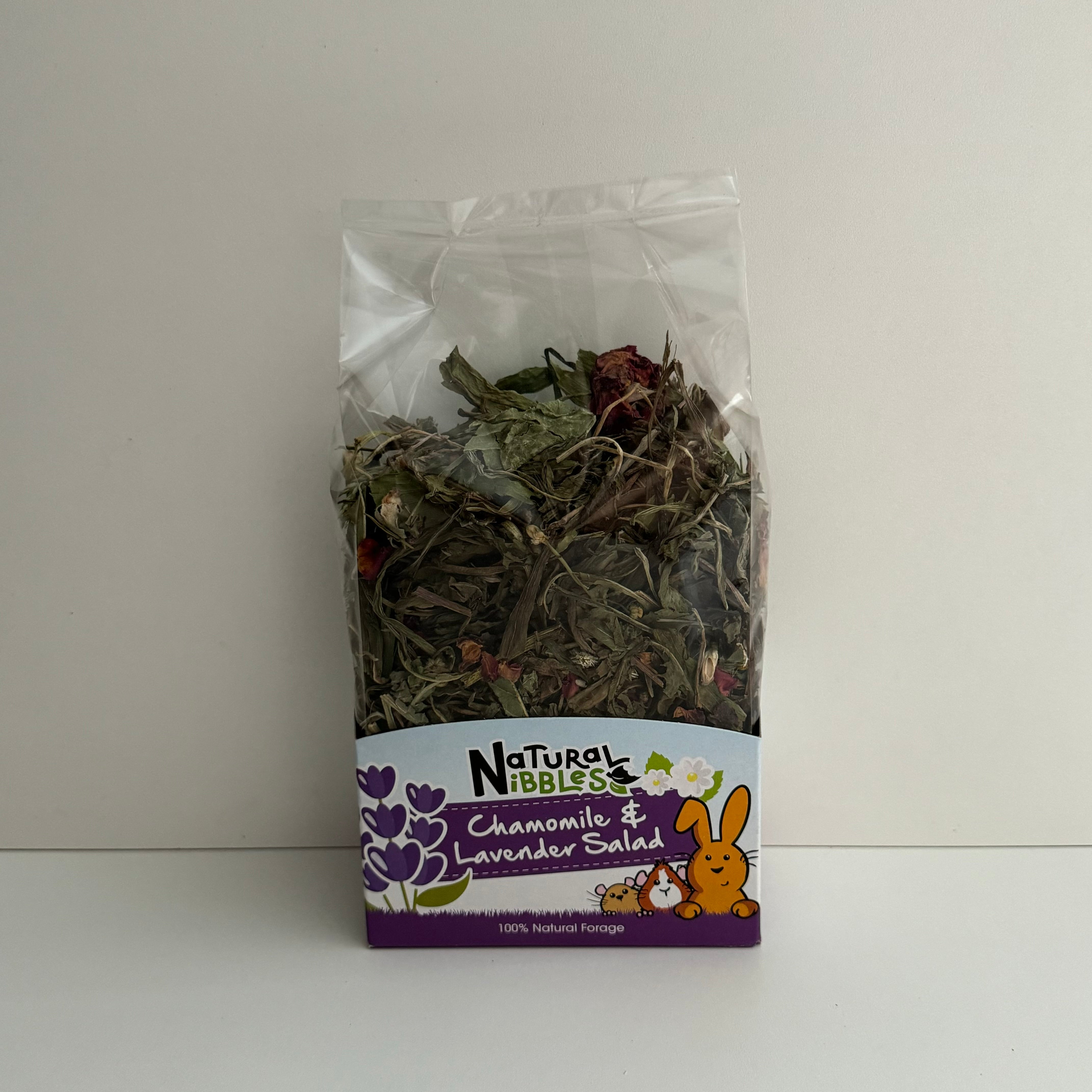 Natural Nibbles Chamomile & Lavender Salad is a high quality, health boosting forage mix, perfect for most small animals. A blend of calming herbs, flowers, and leaves, it is great for using at times of stress to relax and calm. It can be used when introduced to new enclosures or environmental changes. This blend is loved by rabbits & guinea pigs! You can simply mix these in with hay to encourage your pet's natural foraging instinct.