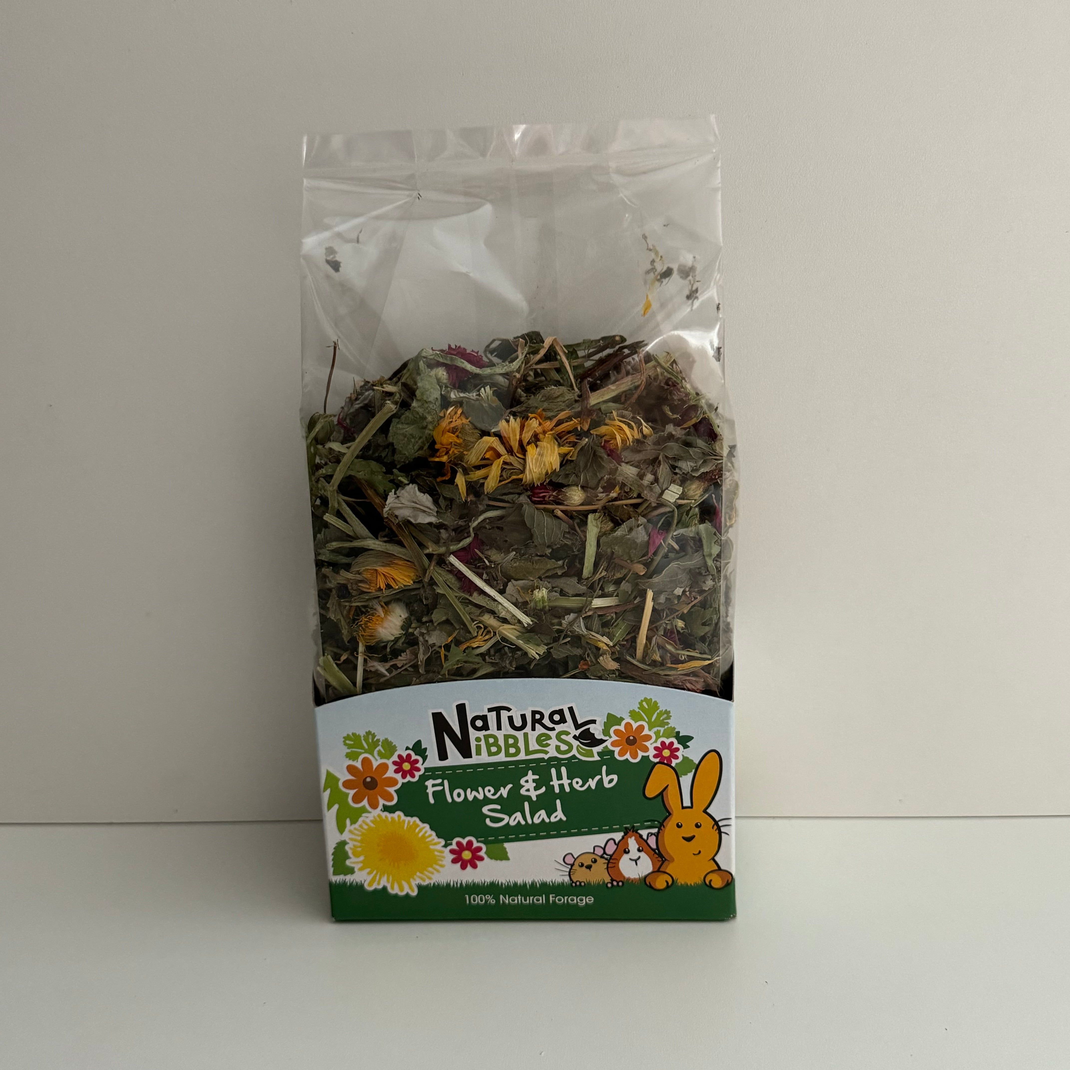 Natural Nibbles Flower & Herb Salad is a tasty, health boosting addition to the diet of small animals. It's packed full of natural vitamins that can help keep your pets active for longer. This well-balanced blend contains ingredients that are loved by rabbits & guinea pigs! You can simply mix these in with hay to encourage your pet's natural foraging instinct.