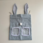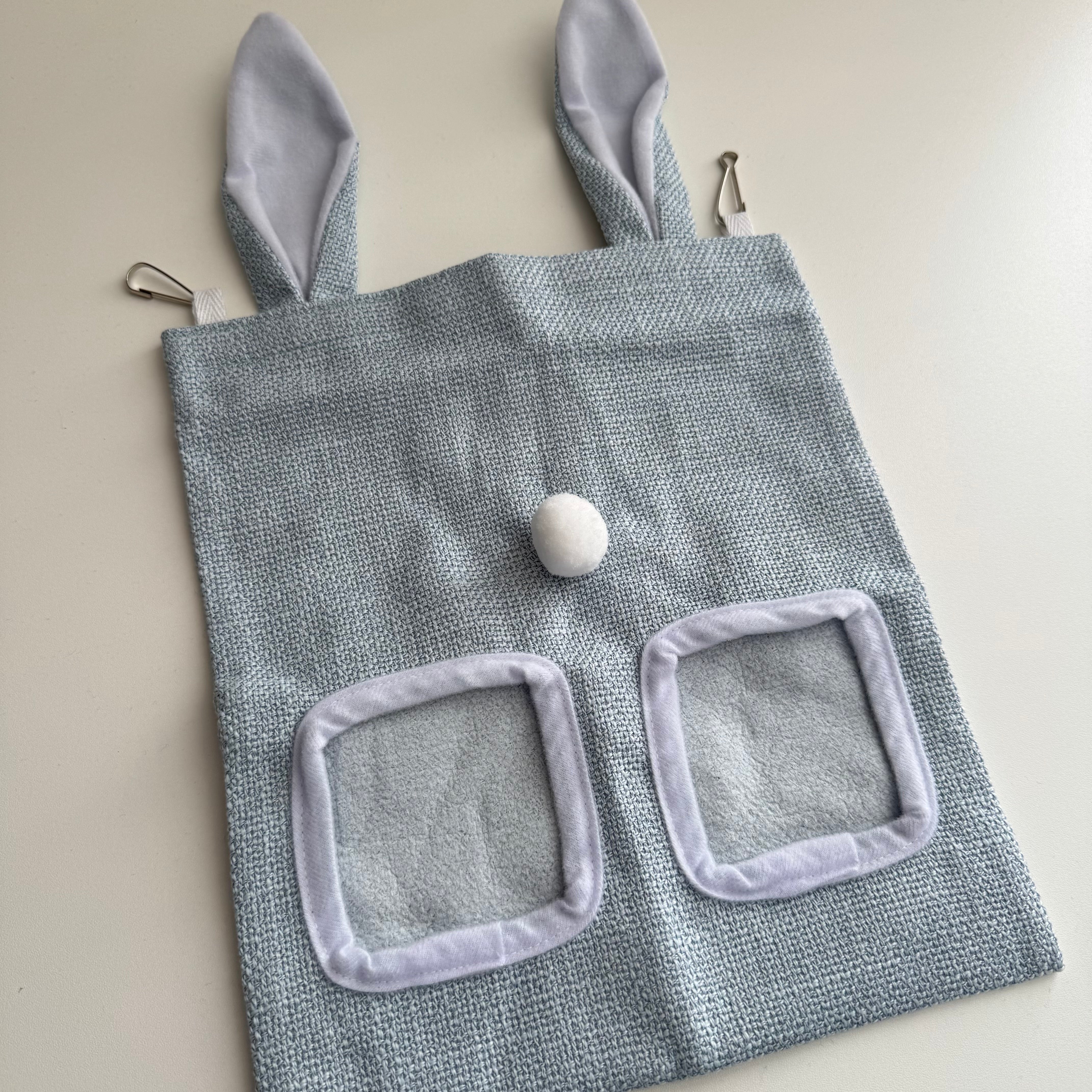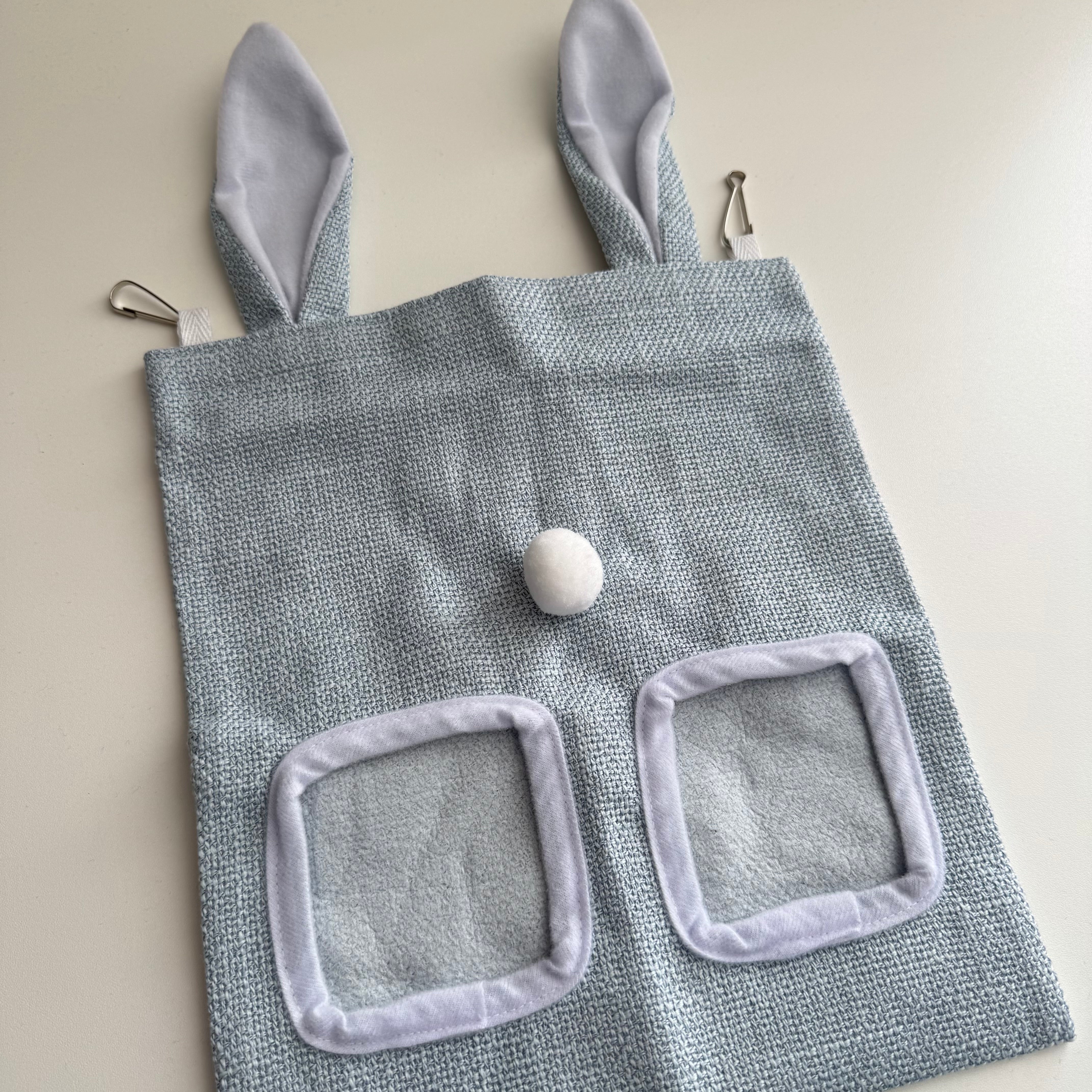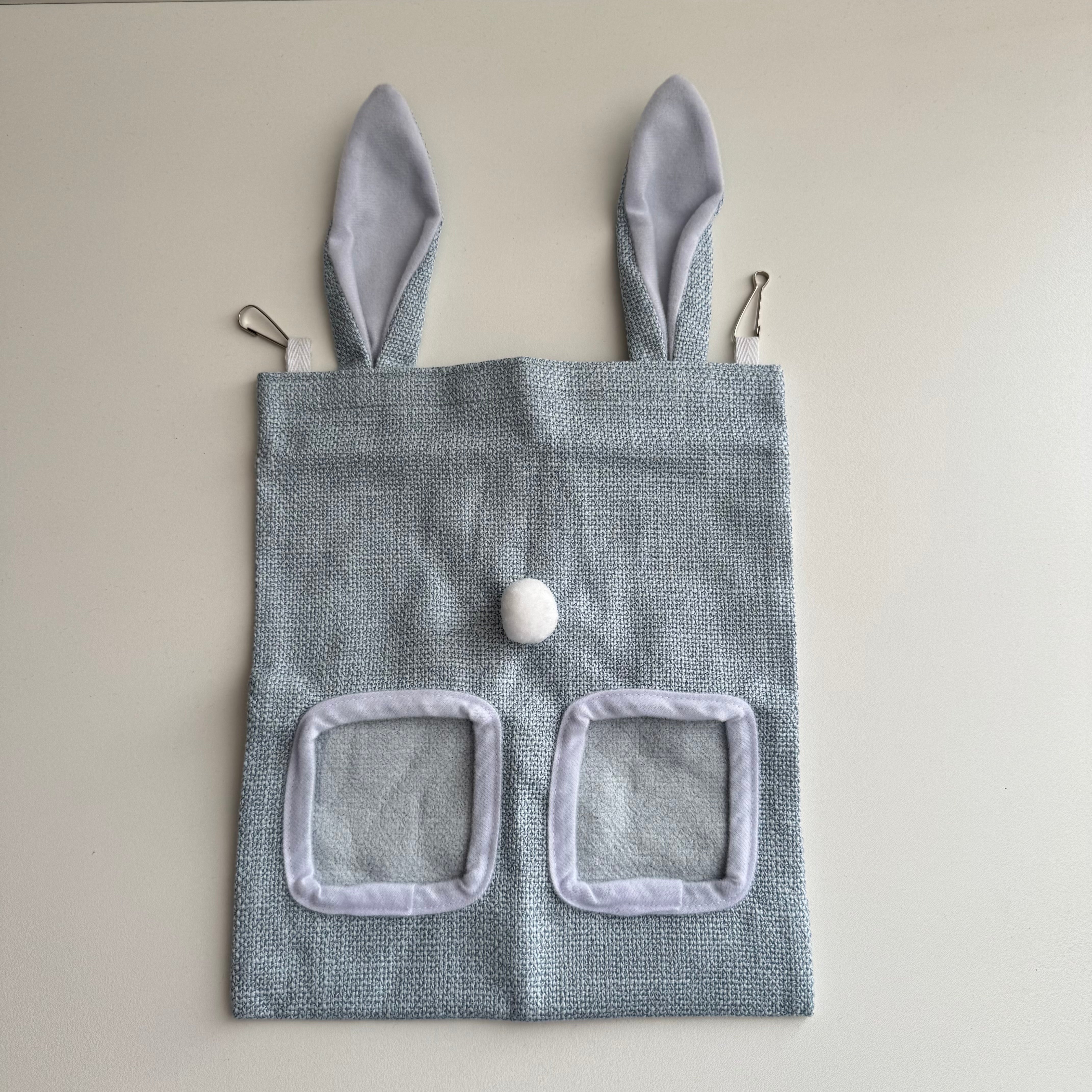 This hay bag is made from 100% cotton in a lovely greyish blue colour. Fill the bag with hay from the top and then hang it from either pen grids or command hooks. Don't forget hay should make up at least 80% of a rabbits diet so providing multiple options of feeding hay is important to encourage intake.