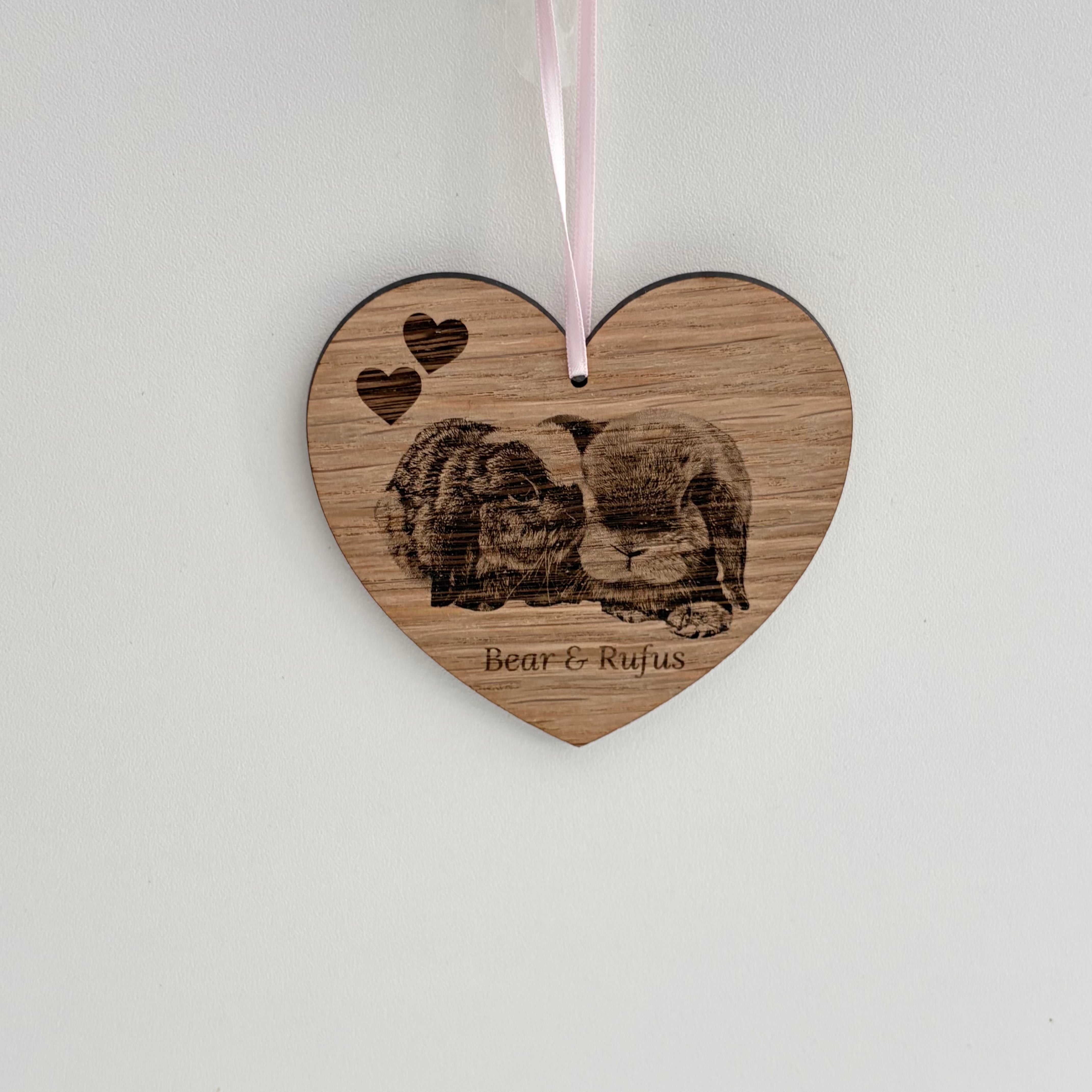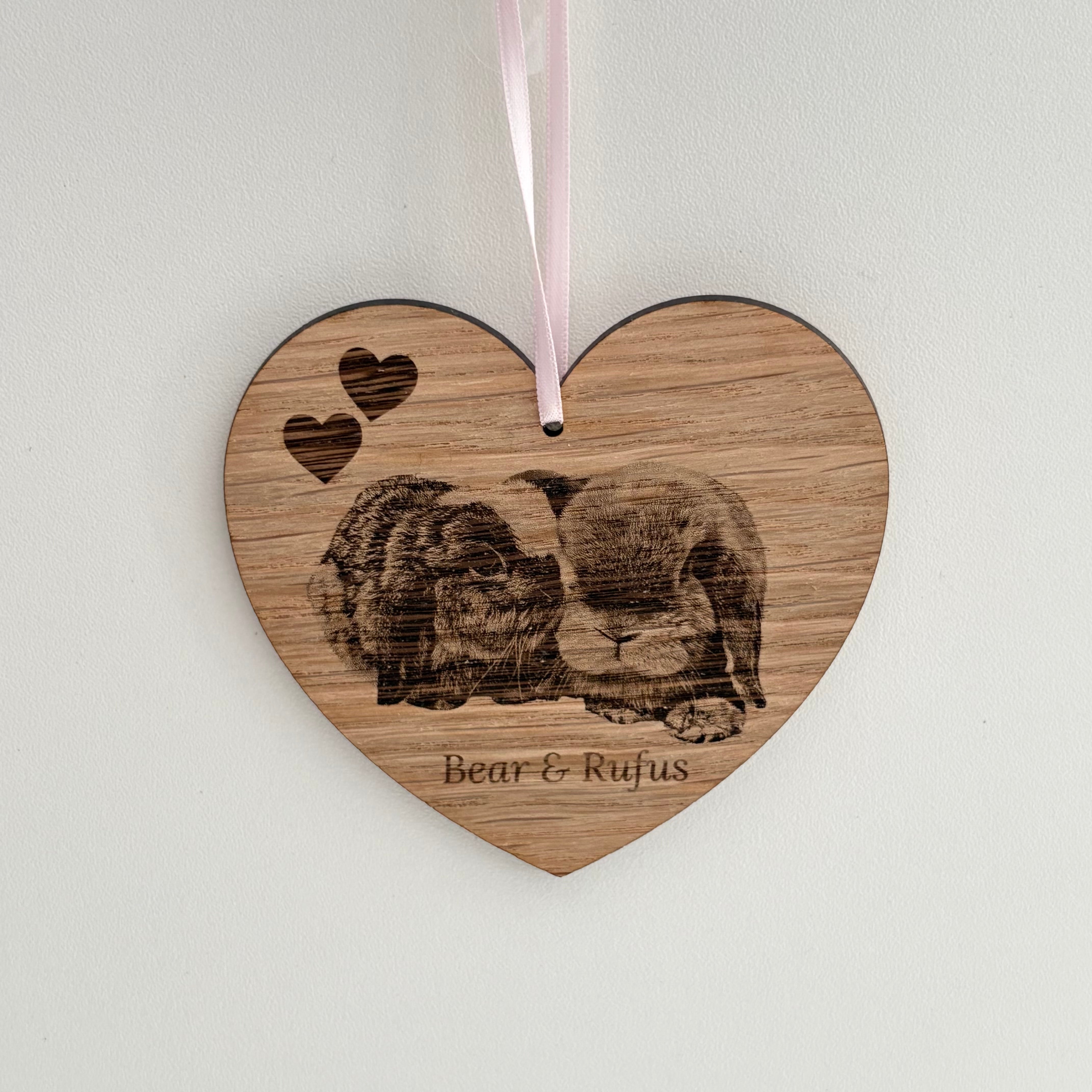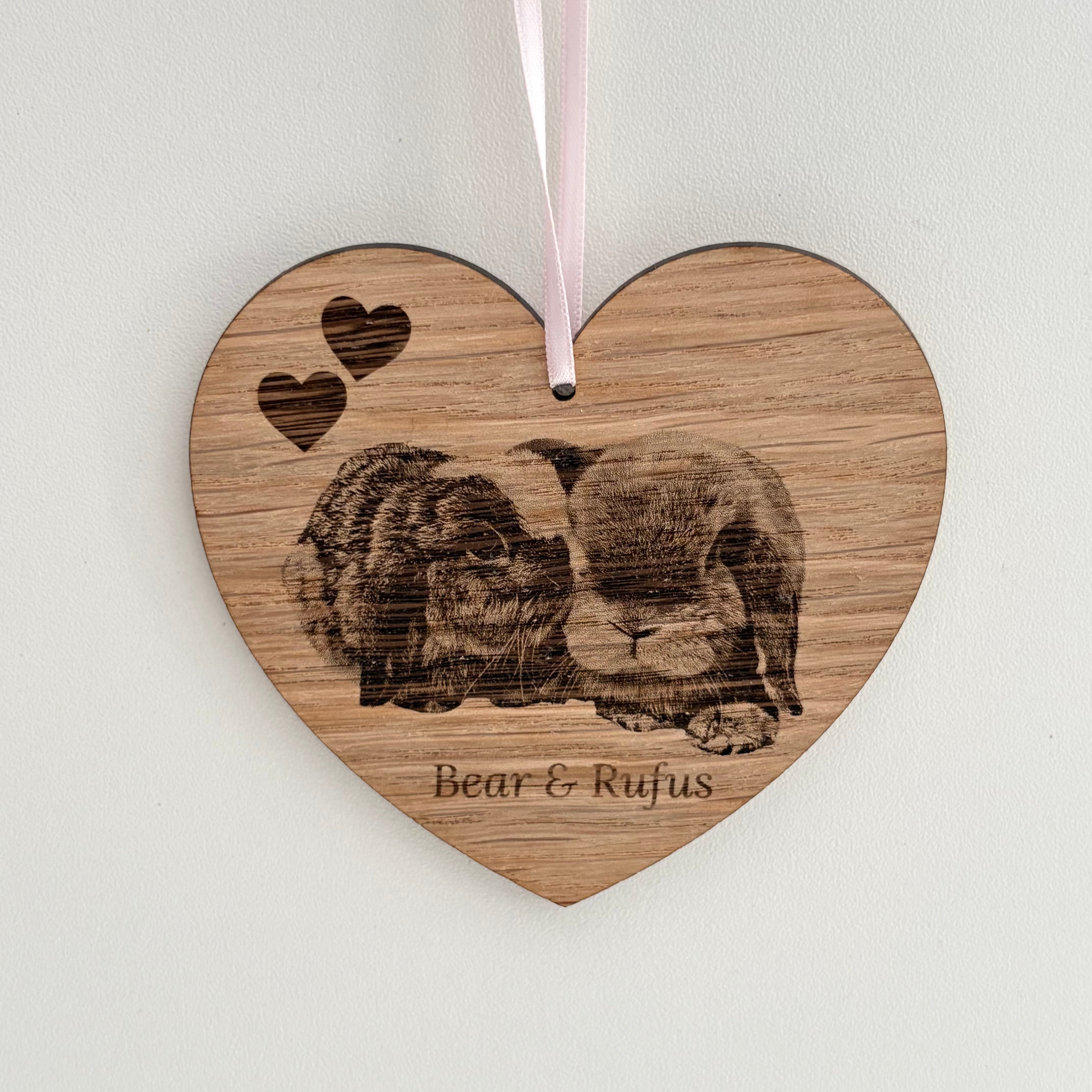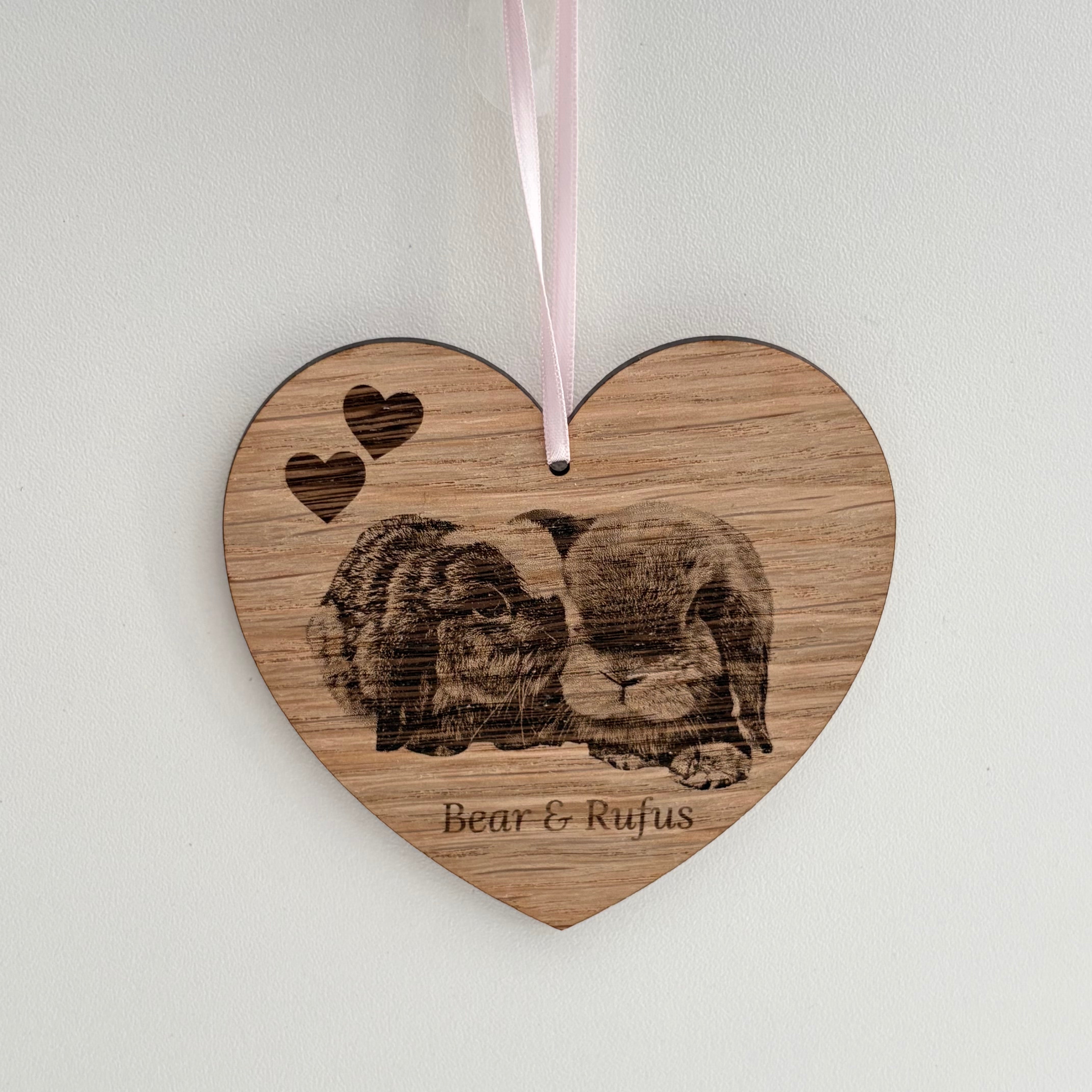 Keep the ones you love most close to your heart with this beautiful Wooden Heart Ornament. Your rabbits' photo is engraved into natural wood, surrounded by delicate hearts and personalised with your buns' names to create a special keepsake.