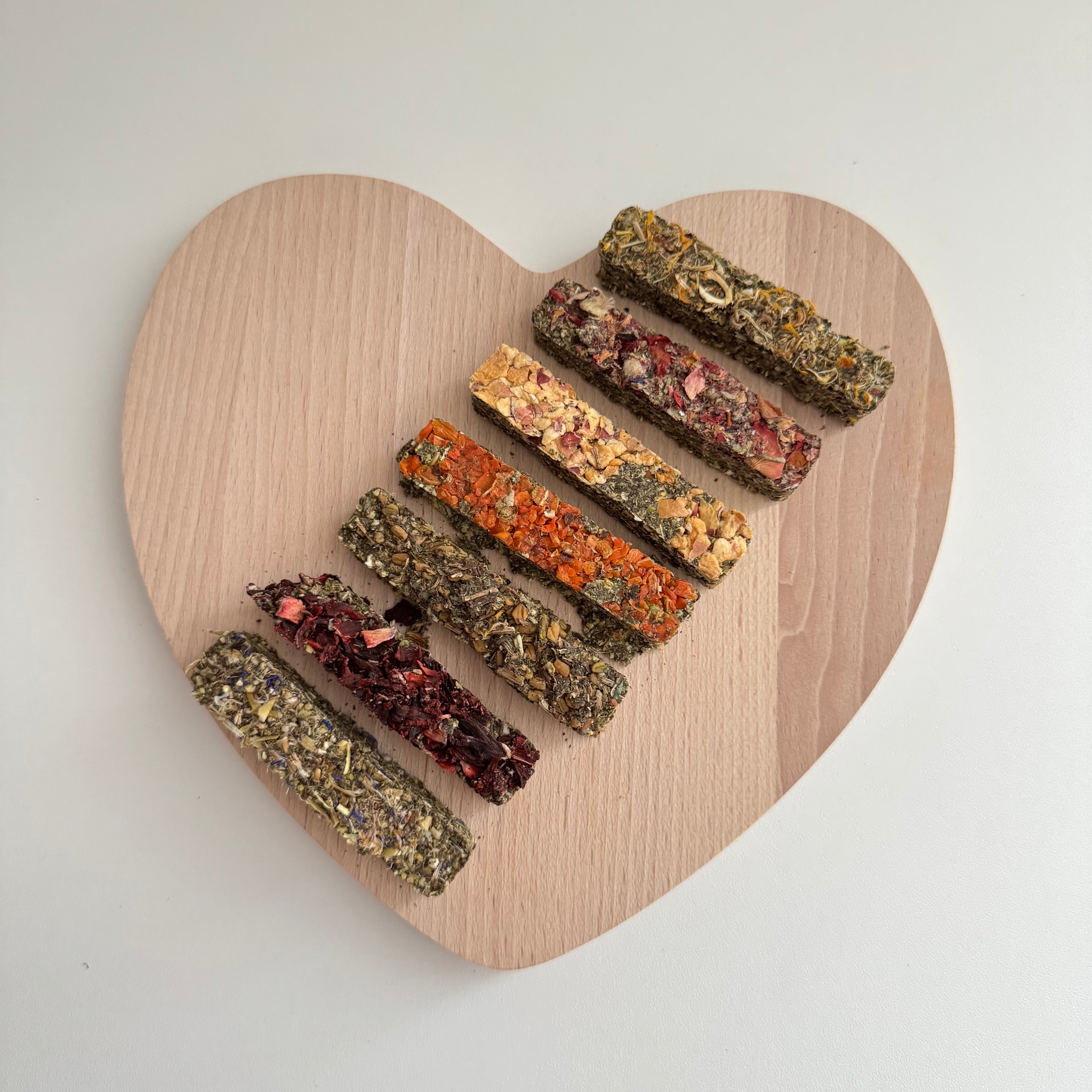 These flower, fruit and veg, oat-based mini bars are perfectly sized for a daily treat. Made with only 100% natural ingredients. Topped with 7 different toppings with beneficial nutrients. Suitable for rabbits, guinea pigs, and other small animals.
