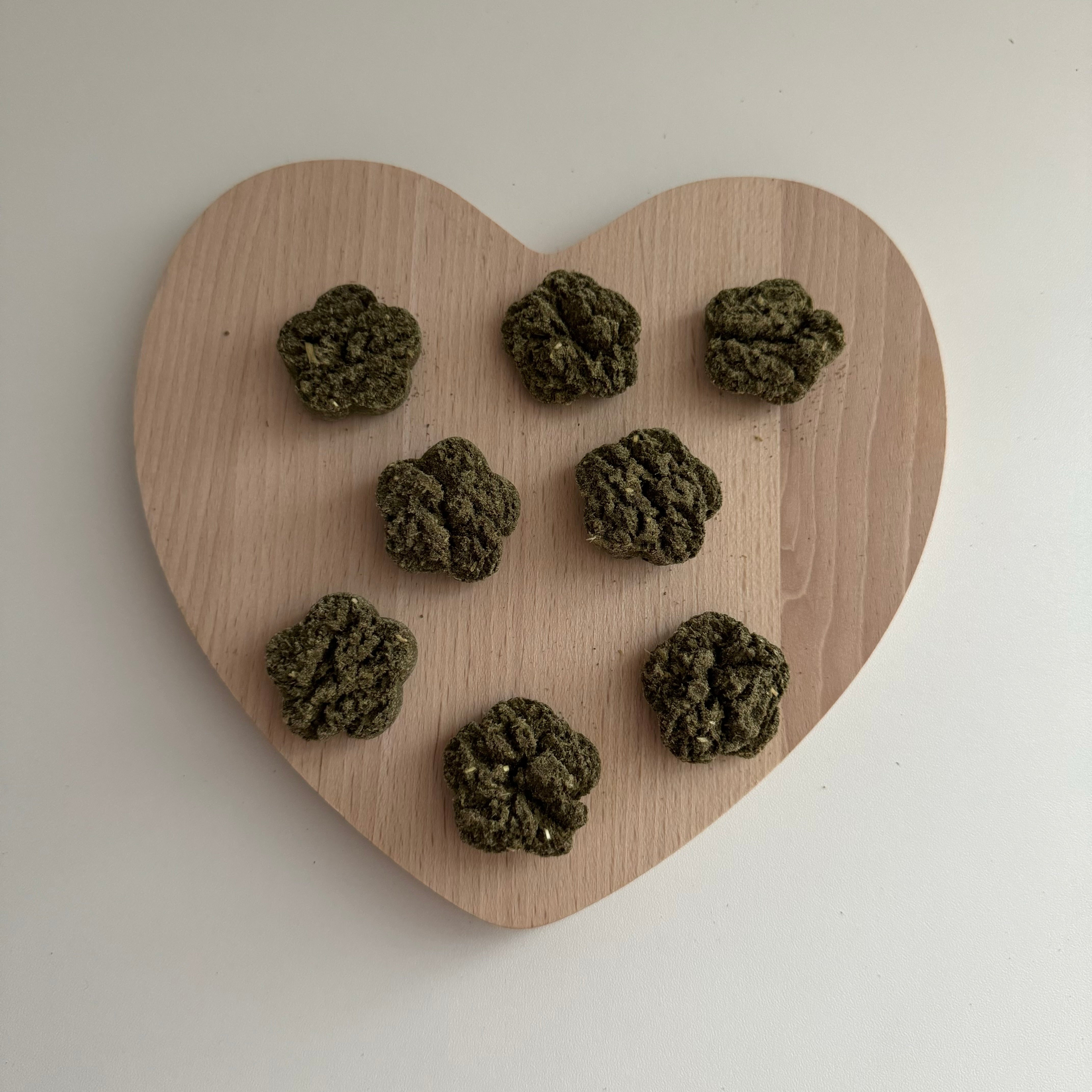 These timothy hay-based treats are a perfect addition to your small pet's diet. Made exclusively with bunny-safe ingredients, they contain no added sugar, artificial flavours, or colours. These crunchy snack bites are bursting with tasty flowers, making them a wholesome and delicious treat for your furry friend.