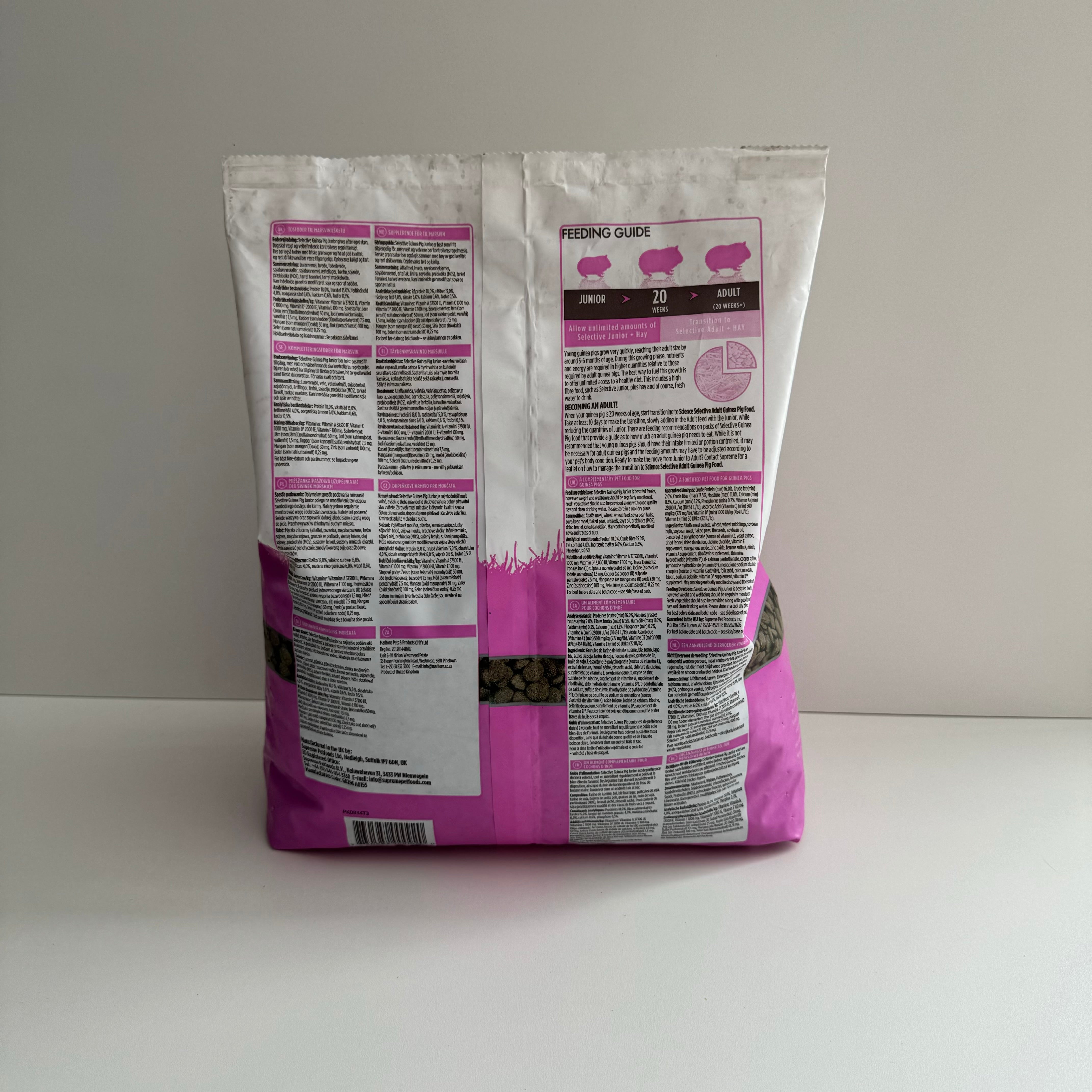 Recommended by vets, Science Selective Junior Guinea Pig provides a tasty balanced diet for guinea pigs up to 20 weeks of age. The single component extruded nuggets are high in fibre to promote healthy teeth and tummies and full of delicious natural ingredients including dandelion and fennel. Extra protein supports growth and added vitamin C helps keep young guinea pigs healthy for the best start in life. Selective also contains linseed, a particularly good source of omega 3, which helps to promote healthy skin and coat. Science Selective Junior Guinea Pig is also suitable for pregnant and lactating guinea pigs.