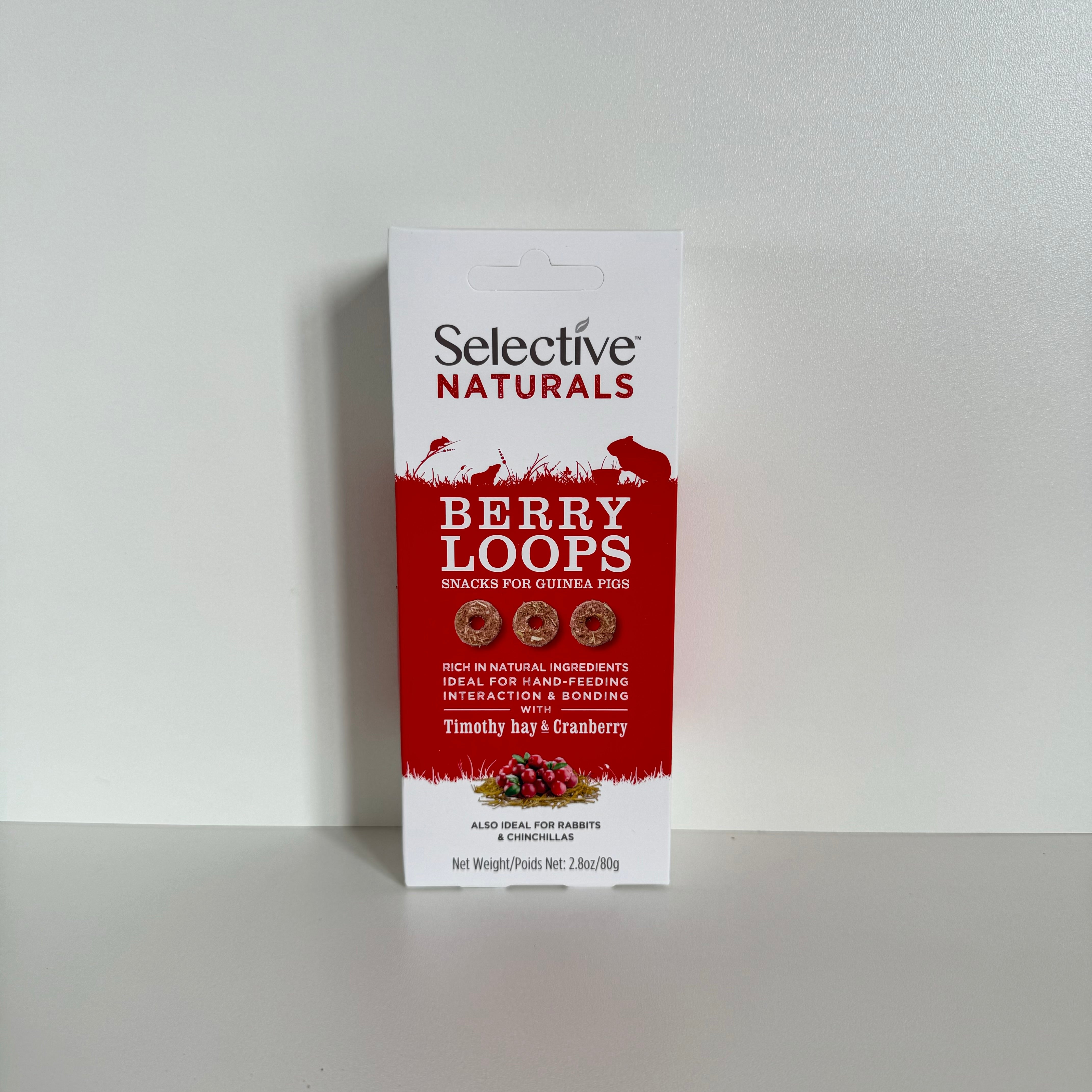 Selective Naturals Berry Loops (Timothy Hay & Cranberry) are delicious hay based treats. They are high in fibre and perfect for pets with a sensitive digestive system, making them a healthier alternative.