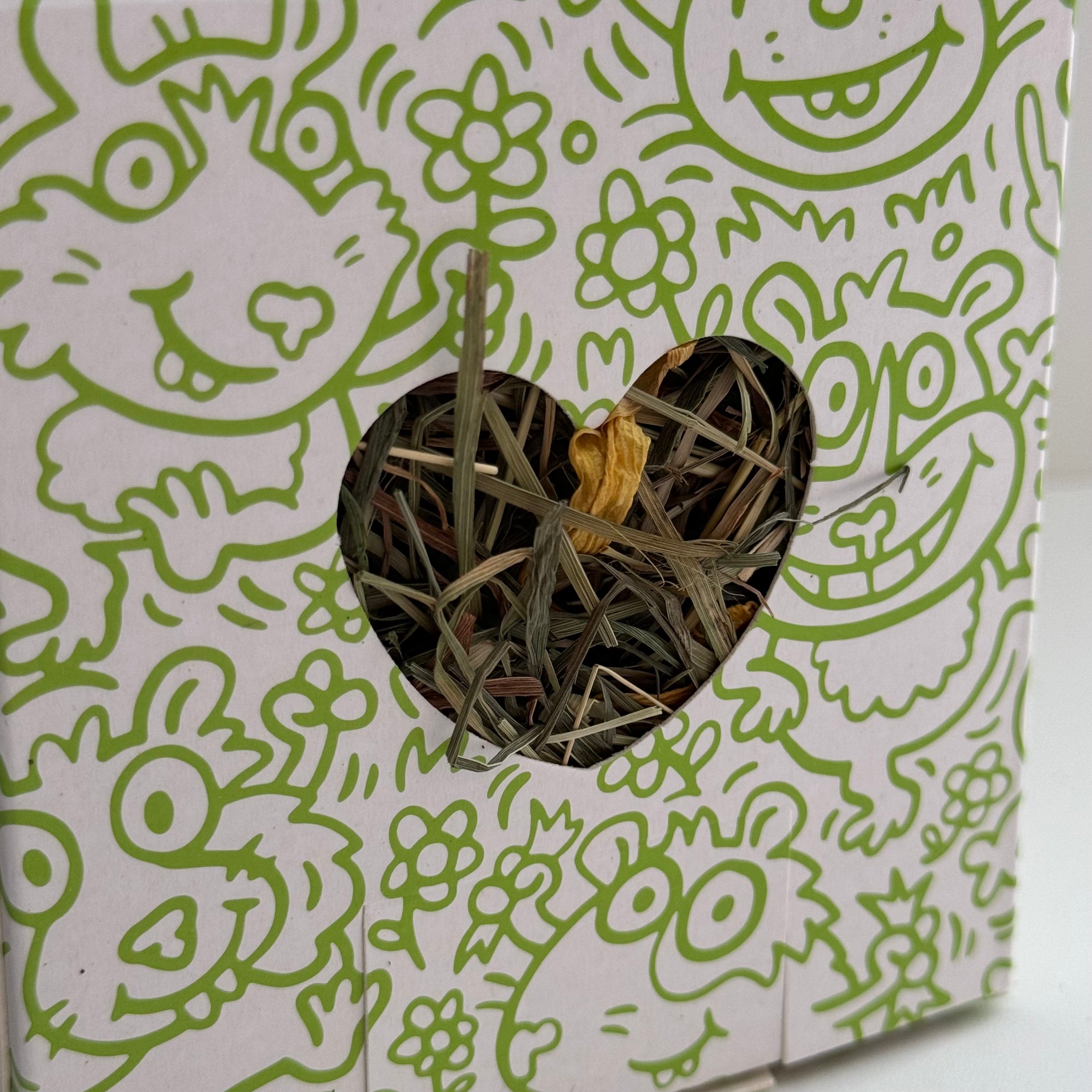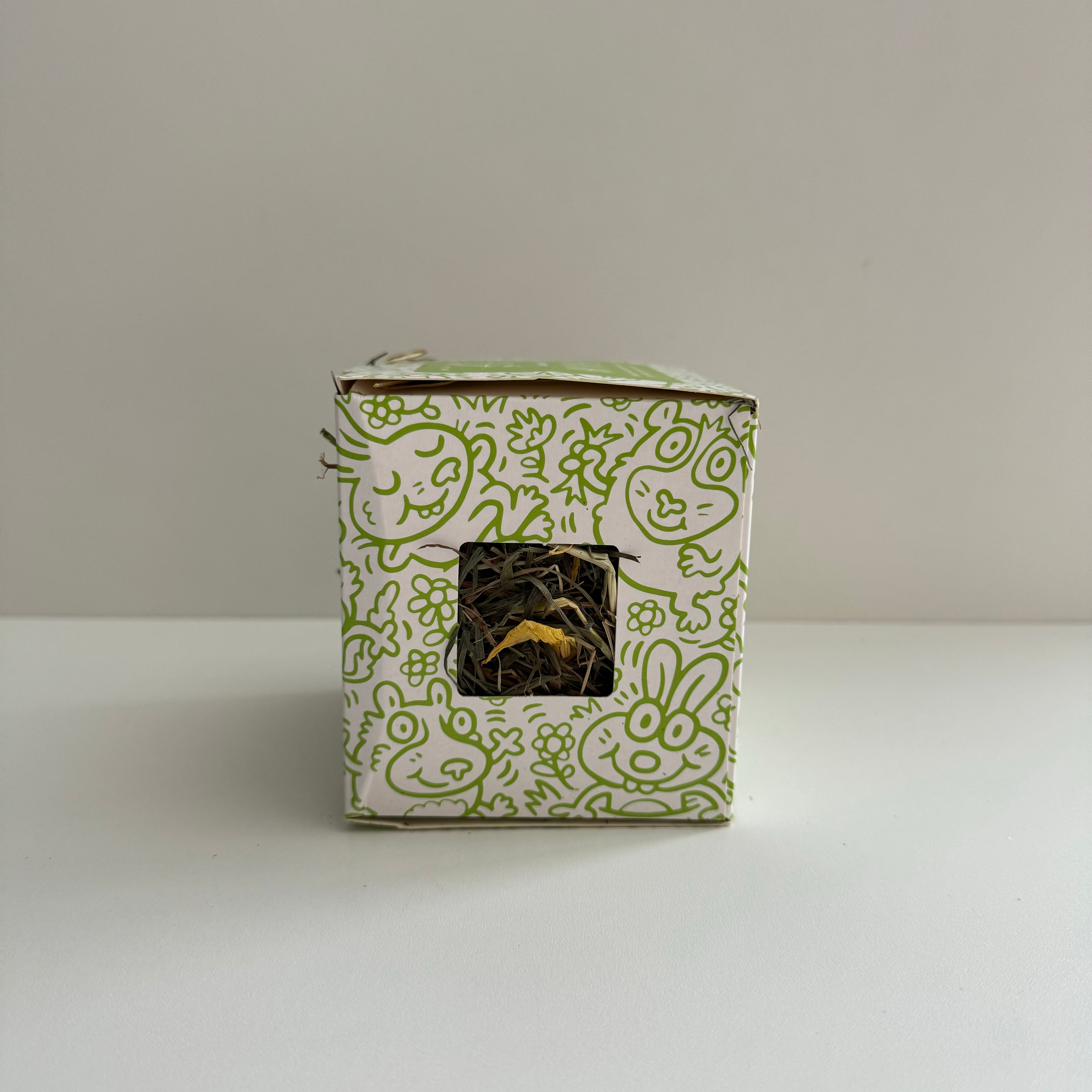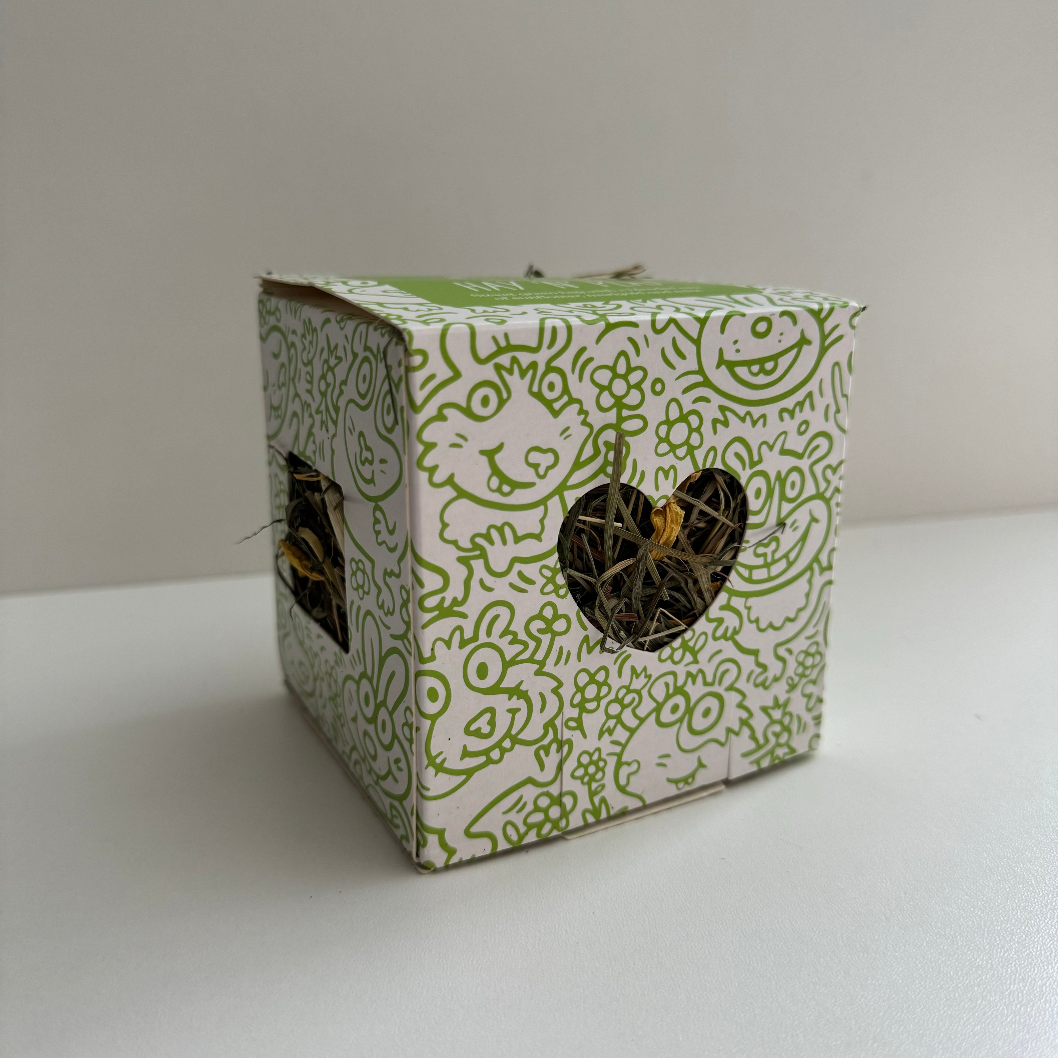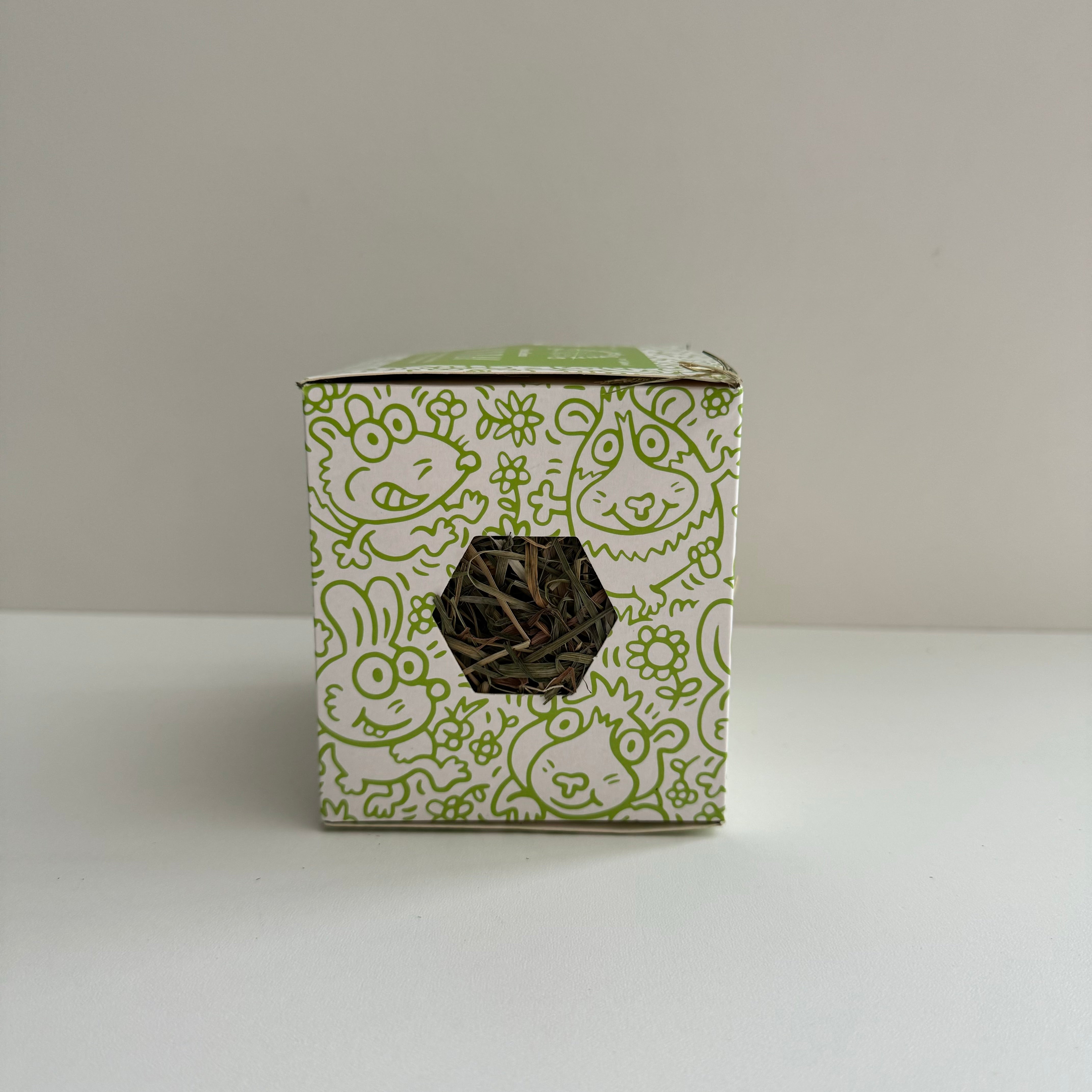 Hay 'N' Play is blended mix of Sunflowers, Marigolds and Mint in a box which is safe for chewing and is made using safe, water based edible inks.