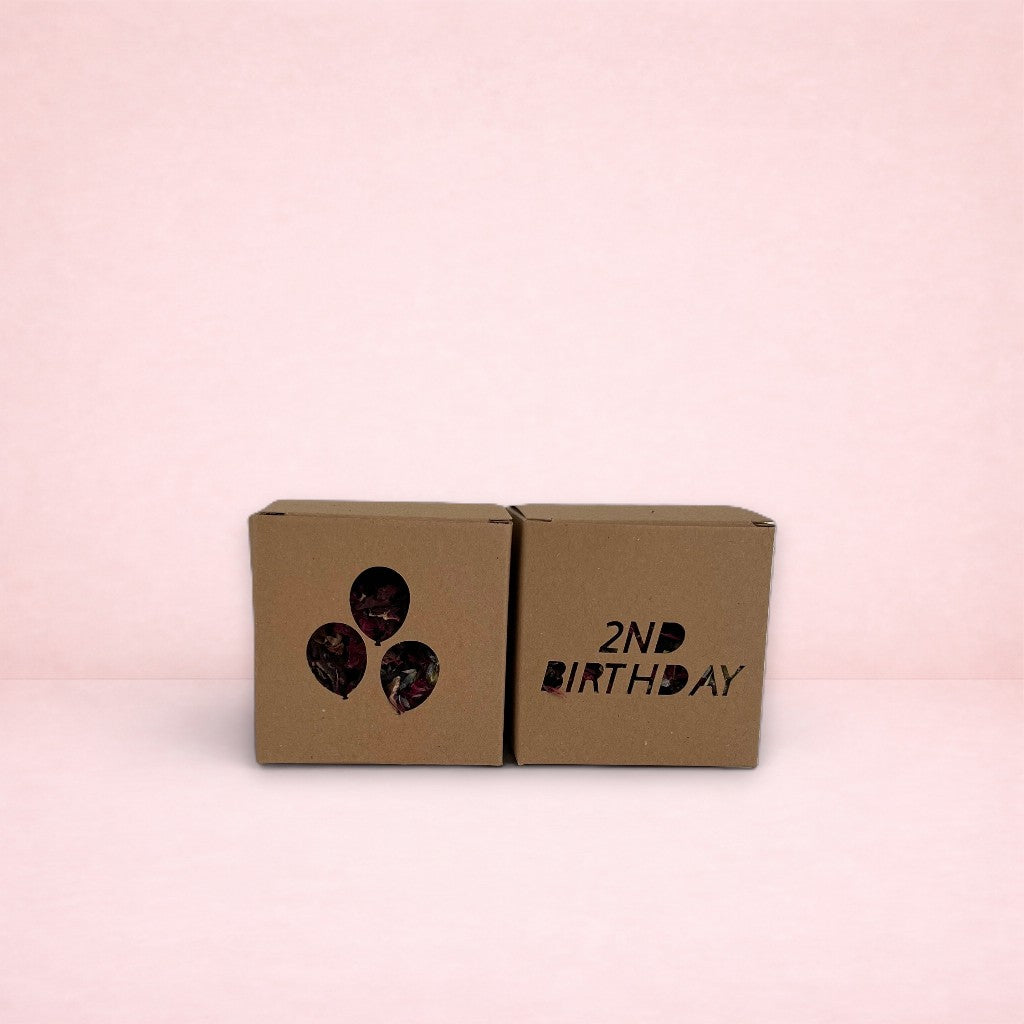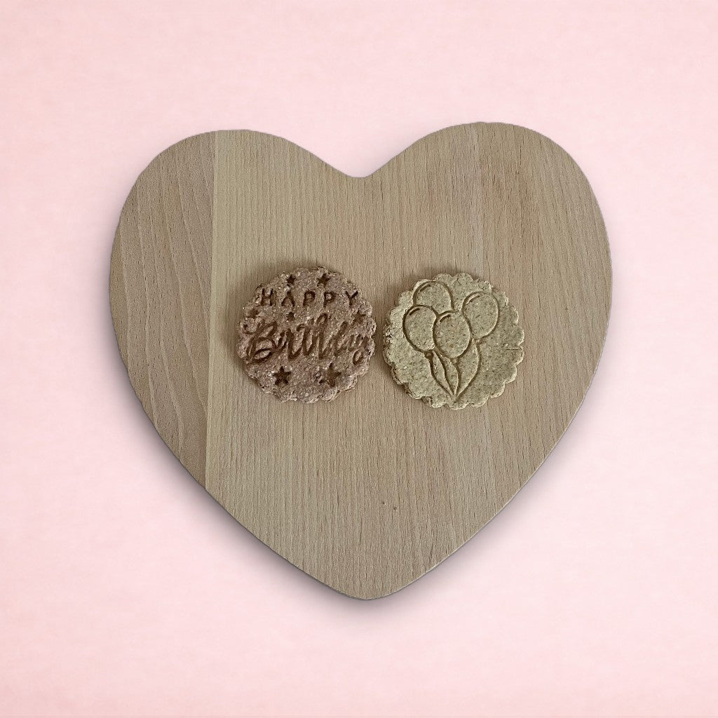 • Boredom Breakers with your choice of forage filling (balloon + "age" birthday) • Pack of 2 fruit and oat cookies (balloons + Happy Birthday). The two flavours for these treats will be the same as the flavours you choose for the cake!