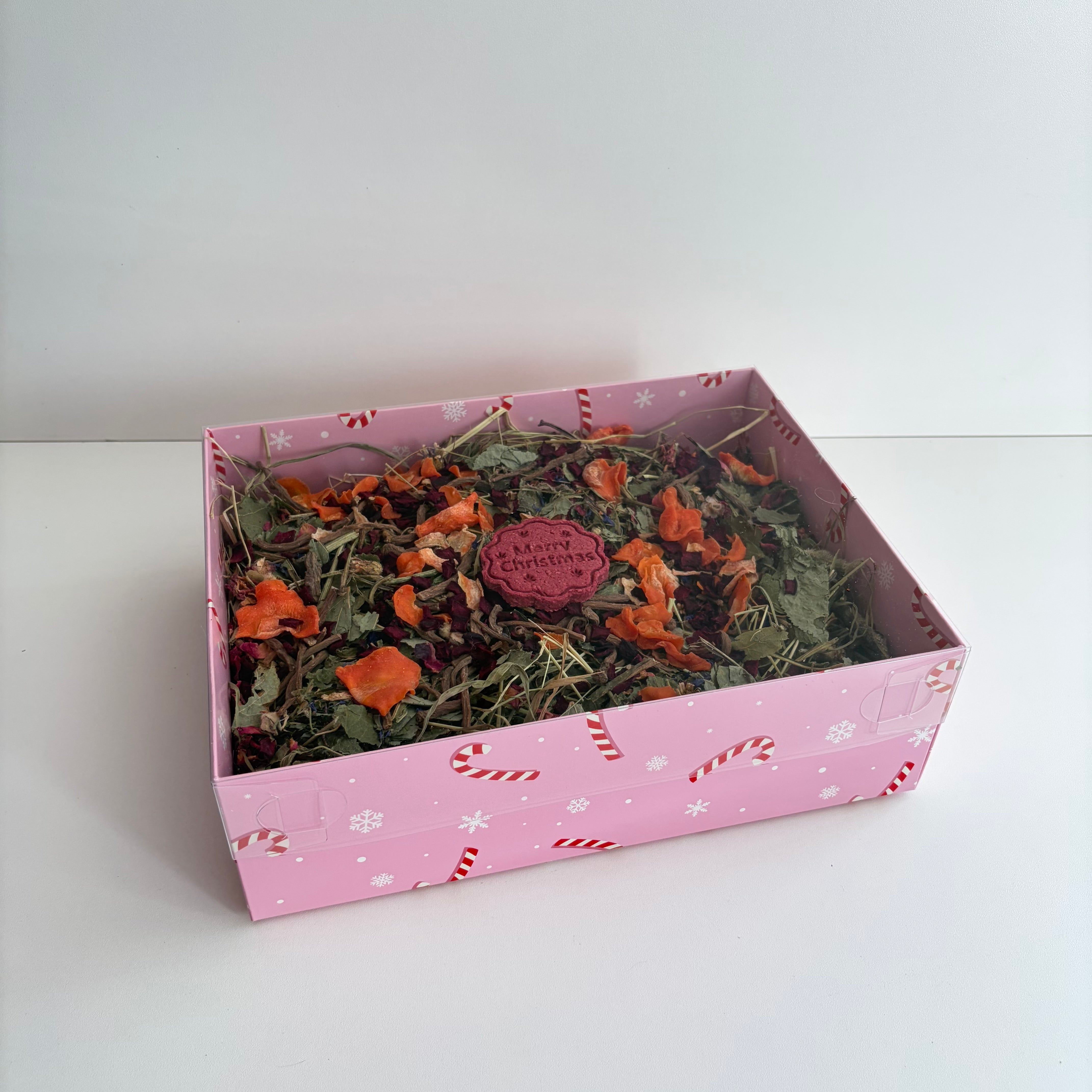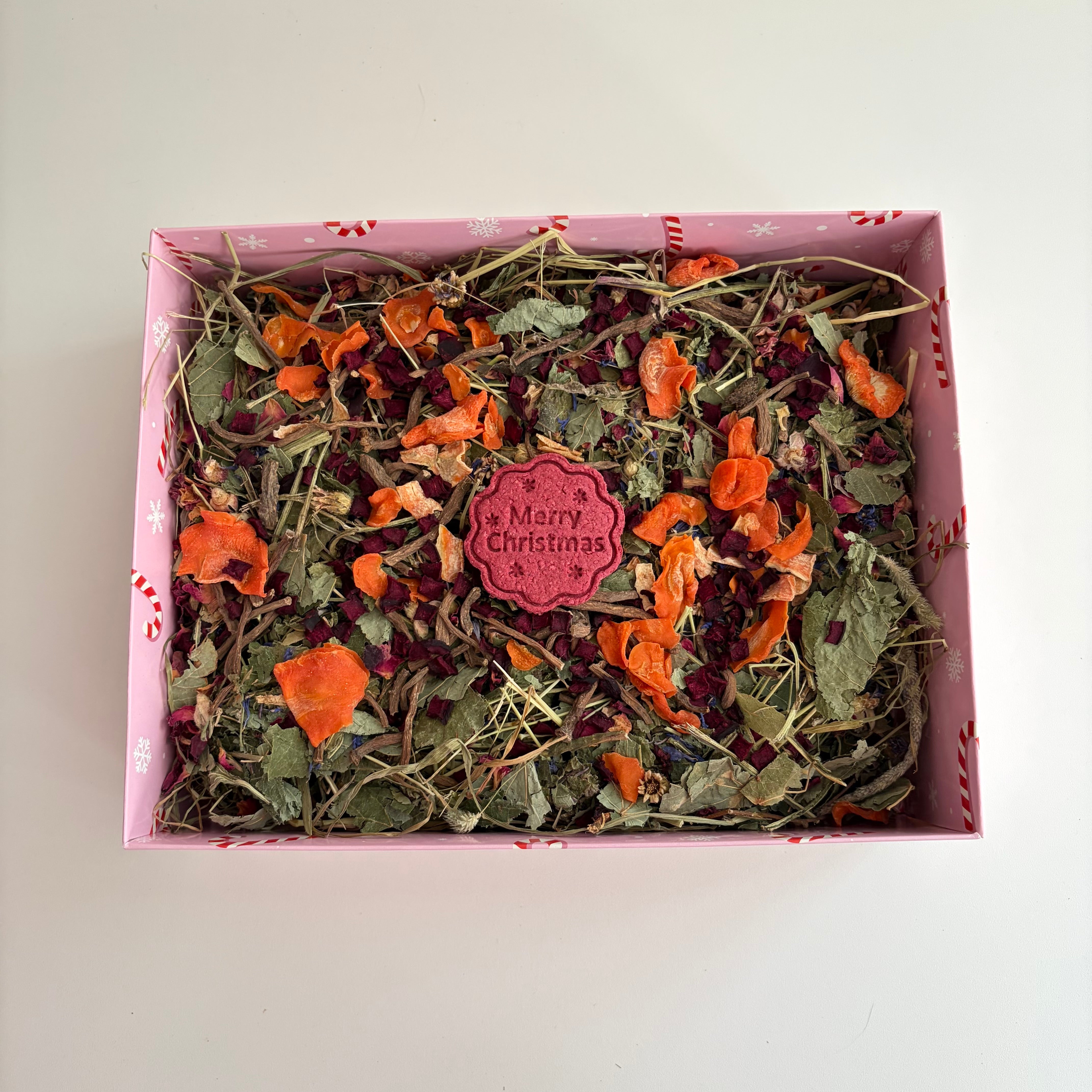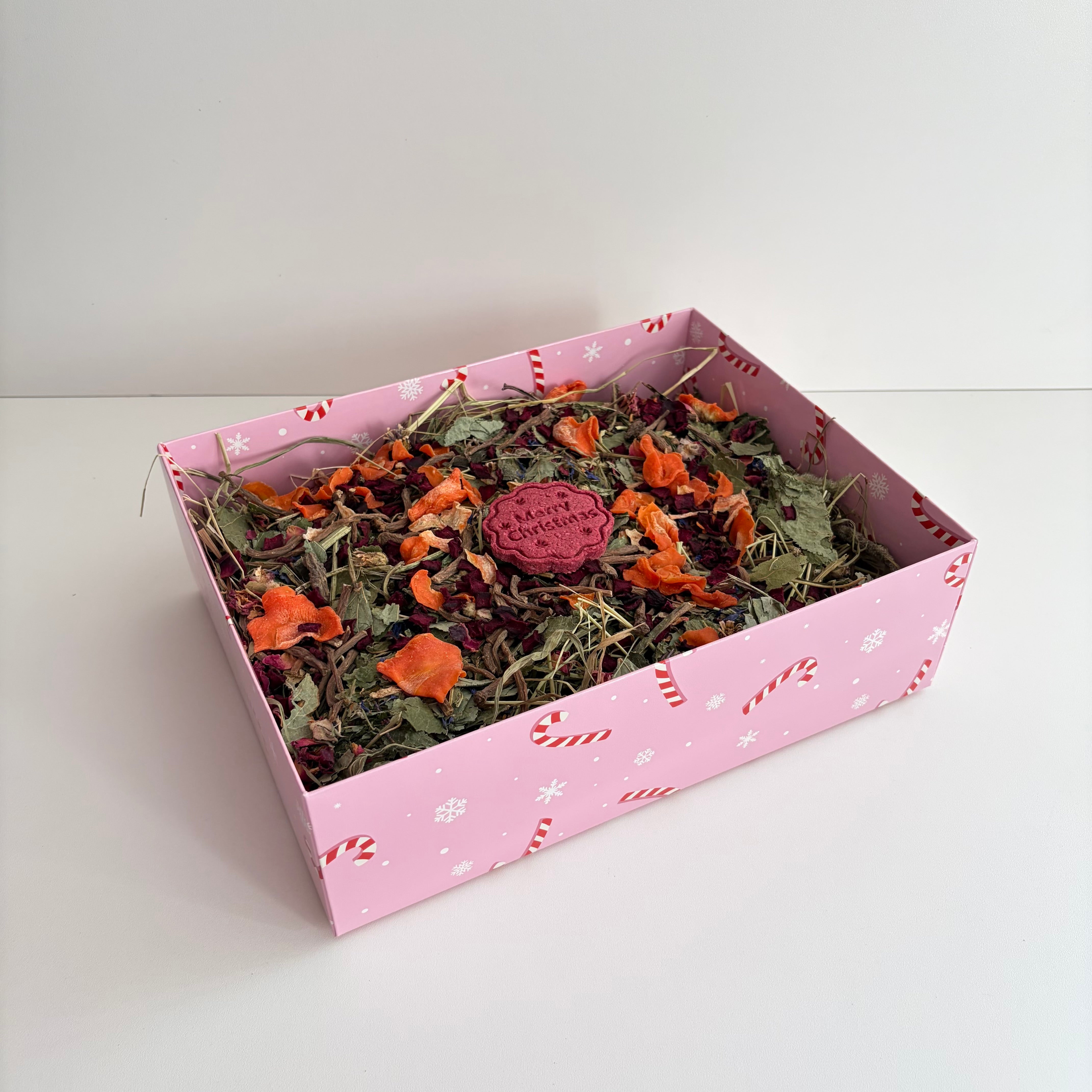 Get into the holiday spirit with this delightful candy cane-themed forage box! Each box is brimming with fresh timothy hay, a generous helping of our 'Cosy Winter' forage blend which is exclusive to this box, topped with a festive ‘Merry Christmas’ beetroot and oat treat. Plus a sprinkling of dried beetroot, dandelion root nibbles, and carrot slices which adds the perfect seasonal touch for your rabbit or small animal to enjoy.