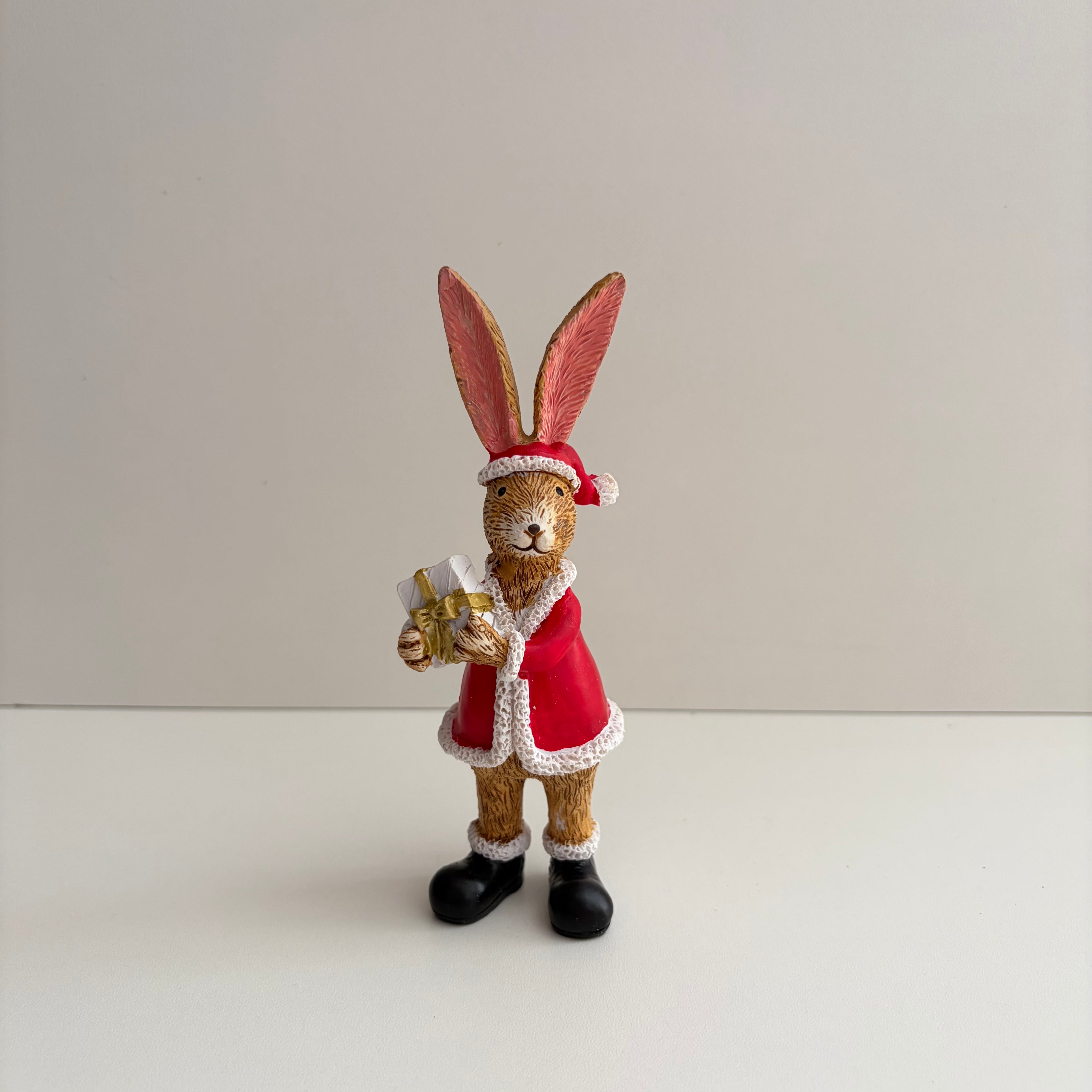 A cute, handmade Festive ornament featuring a Santa bunny holding a present. Makes a lovely addition to seasonal displays.