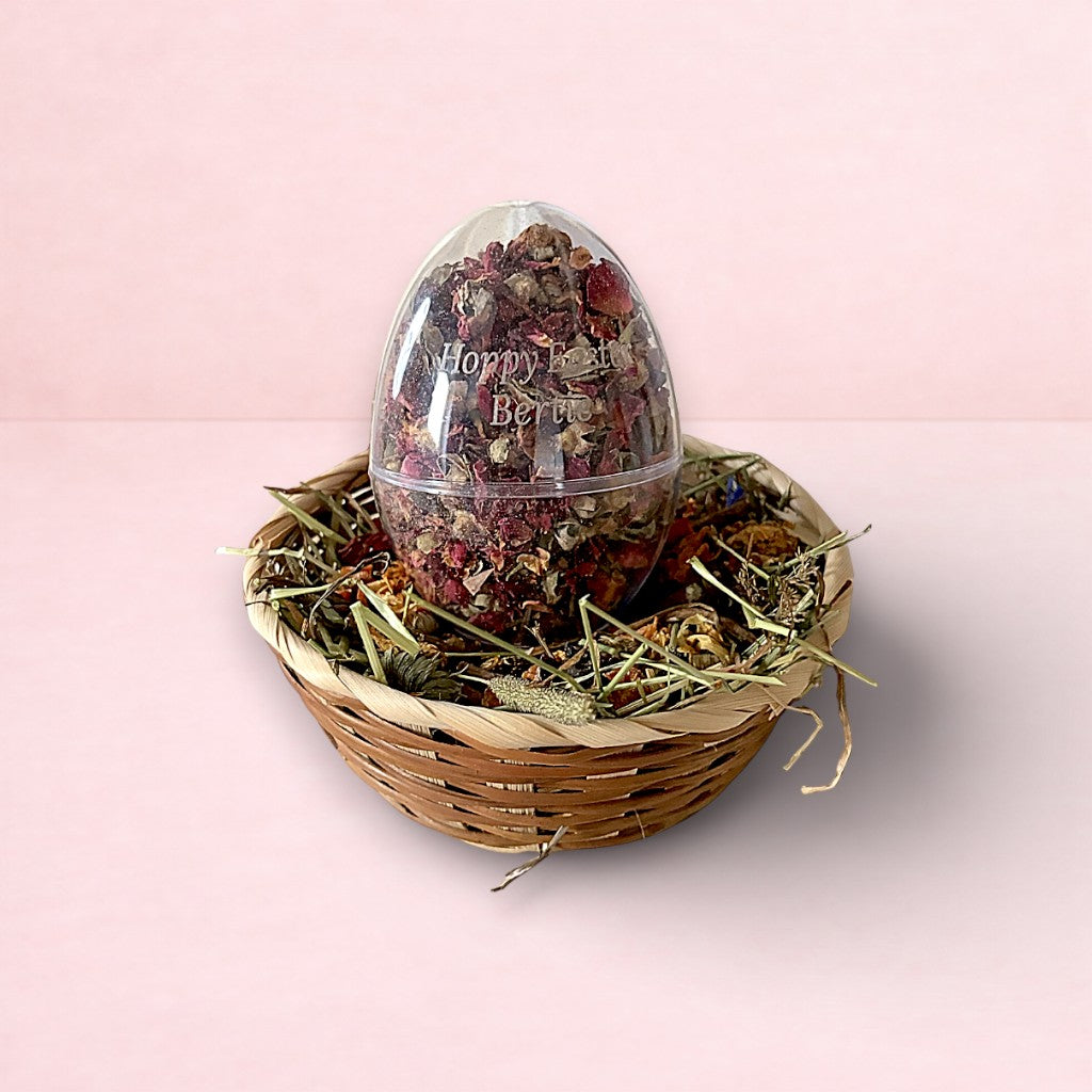 This adorable bamboo basket is packed with delicious timothy hay and topped with Beautiful Blooms forage blend. It also includes your rabbit’s very own personalised Easter egg, filled with Rose Flowers and finished with Carrot and Dandelion Roots. Making the perfect Easter Basket for your rabbit!