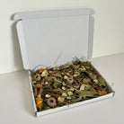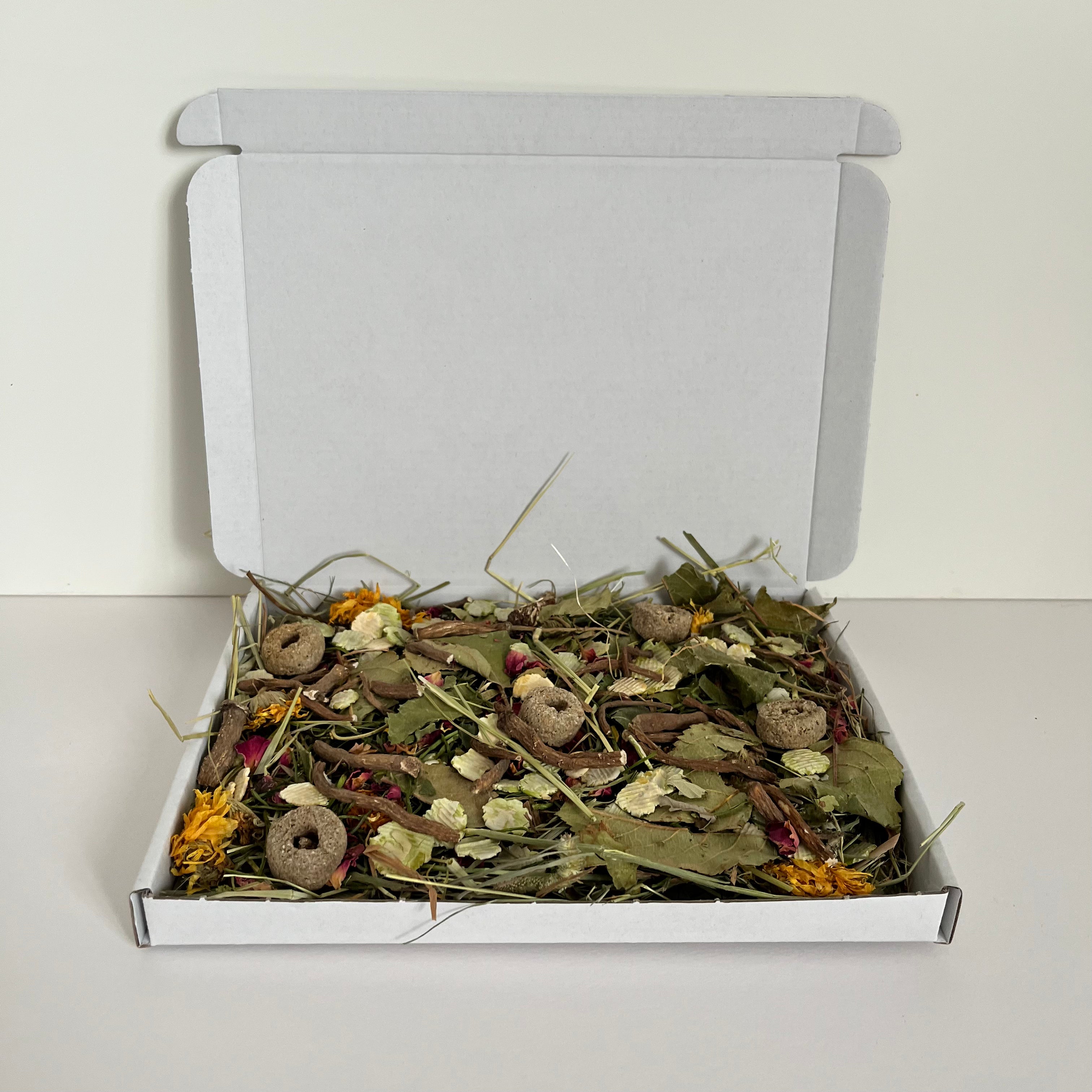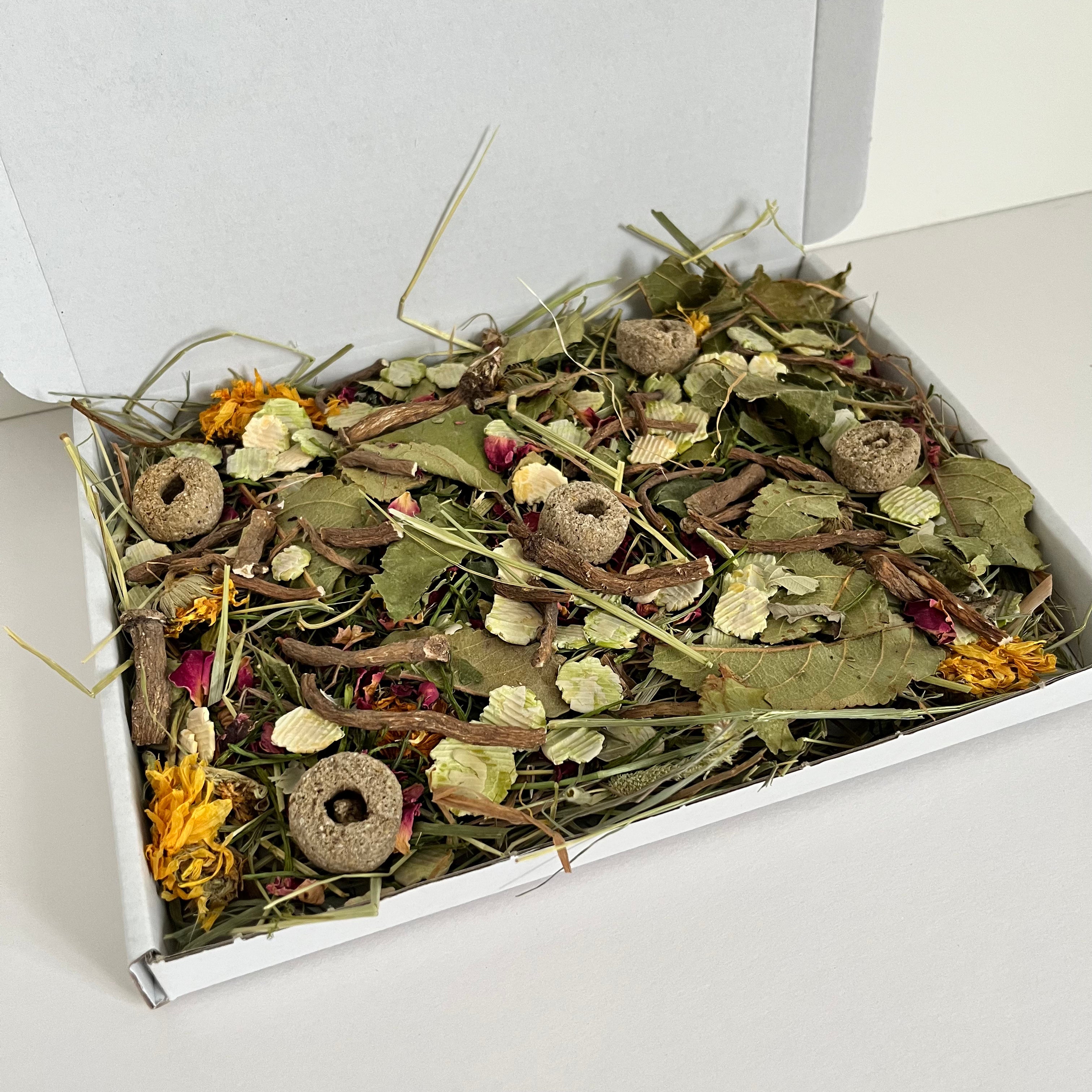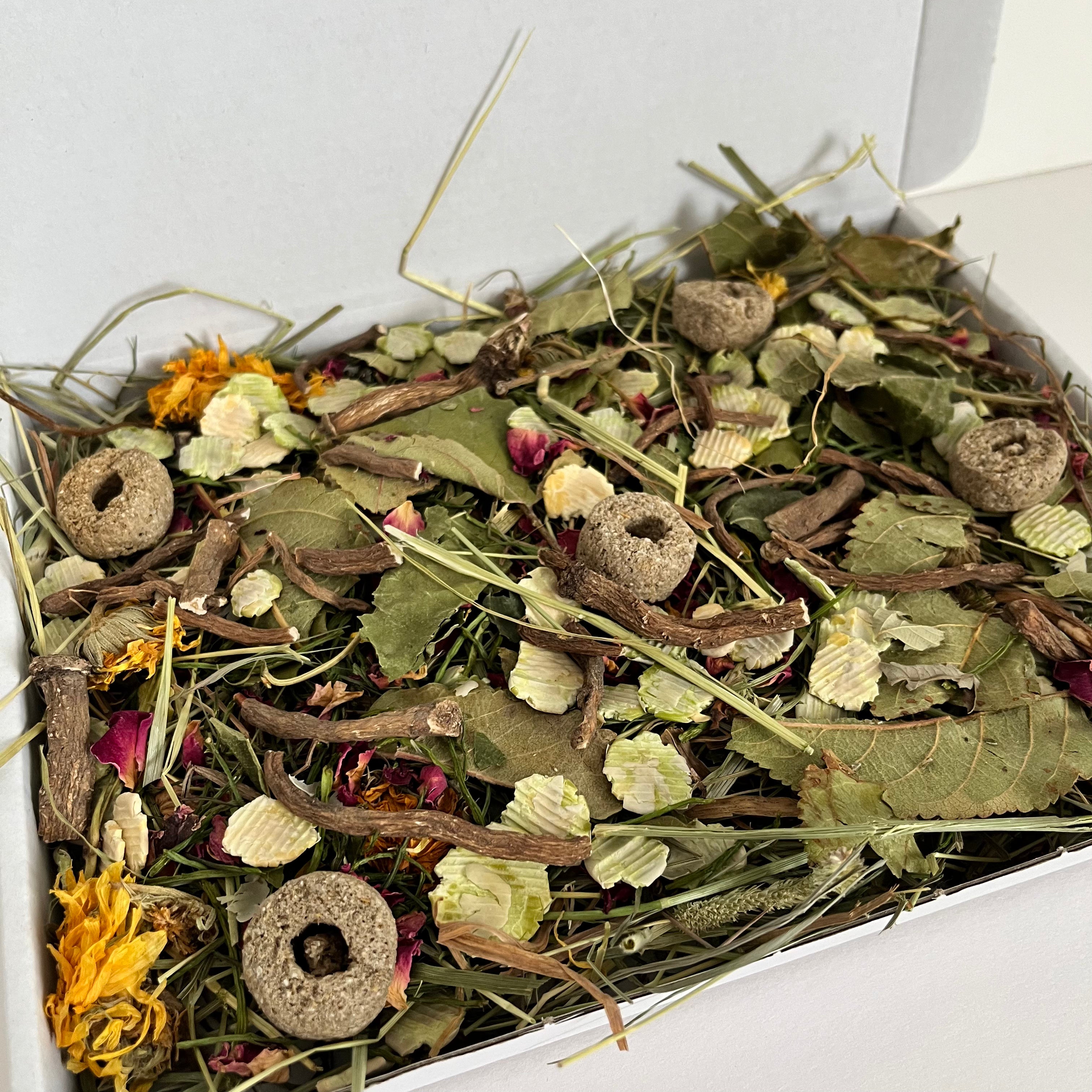 Each Binky Box contains a mixed handful of high-quality Timothy and Rye hay and our "English Garden" forage blend - a scrumptious mix of marigold, coriander stalks, rose petals, raspberry leaf, pear leaves, apple leaves, mulberry leaves, and strawberry leaves. Not only that, but we also sprinkle some dandelion root nibbles, pea flakes and barley rings, most pets absolutely loves these!