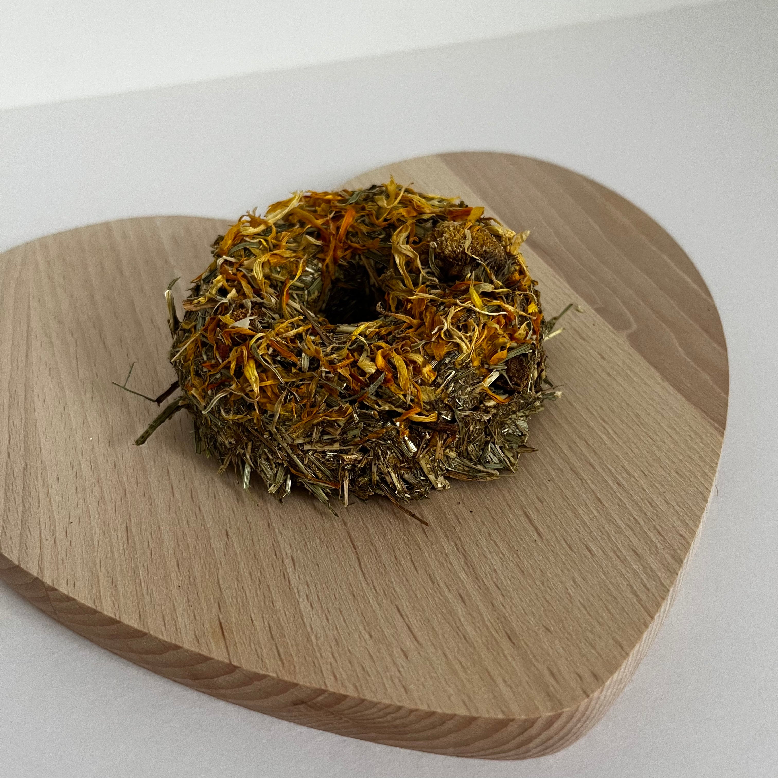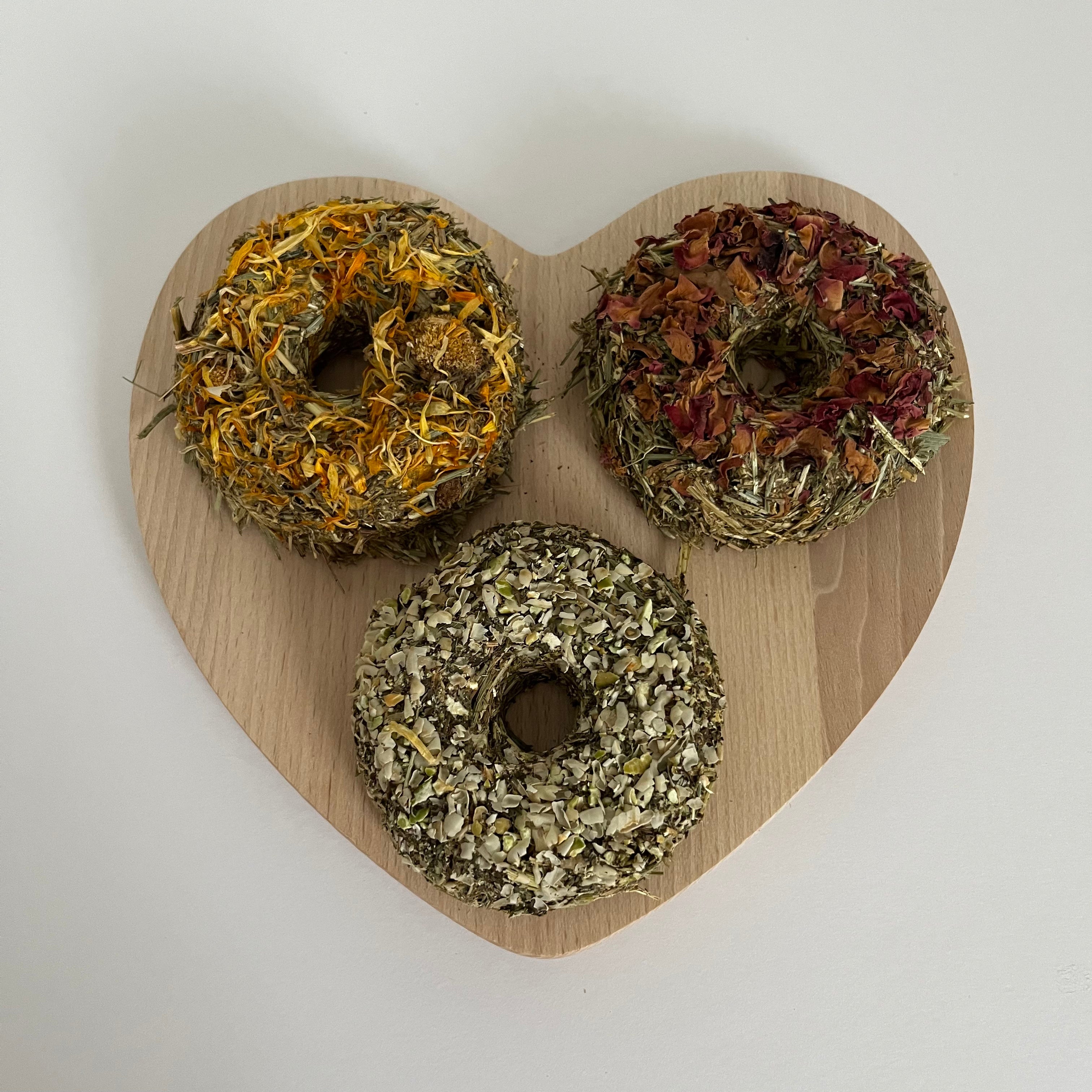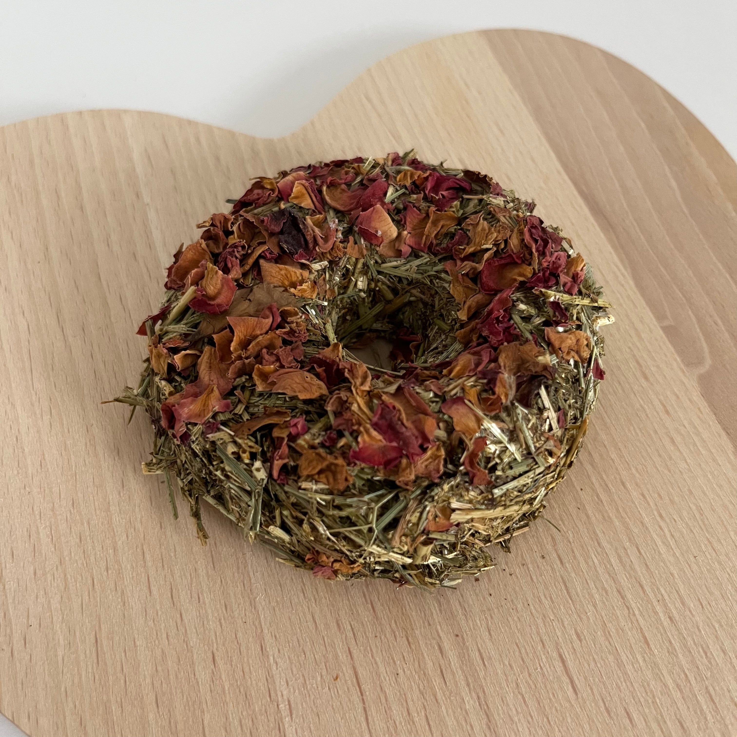Our Forage Doughnuts are a delicious and healthy snack for all small animals. Packed with 100% natural ingredients, these doughnut treats are made with a unique blend of Dried Grass, Dandelion and Nettle with your choice of 3 different toppings - Rose Petals, Chamomile and Marigold and lastly, Mint with crushed Pea Flakes.