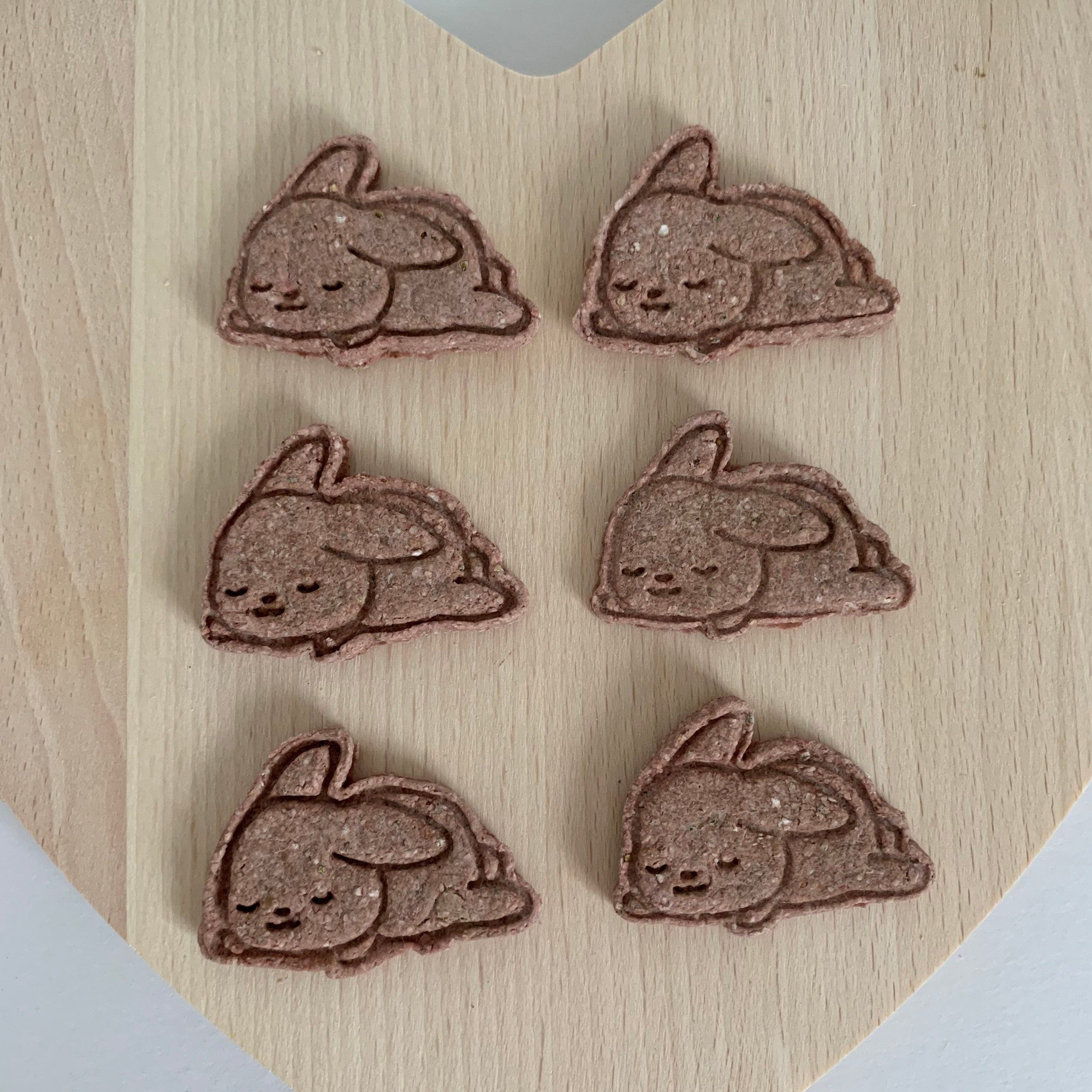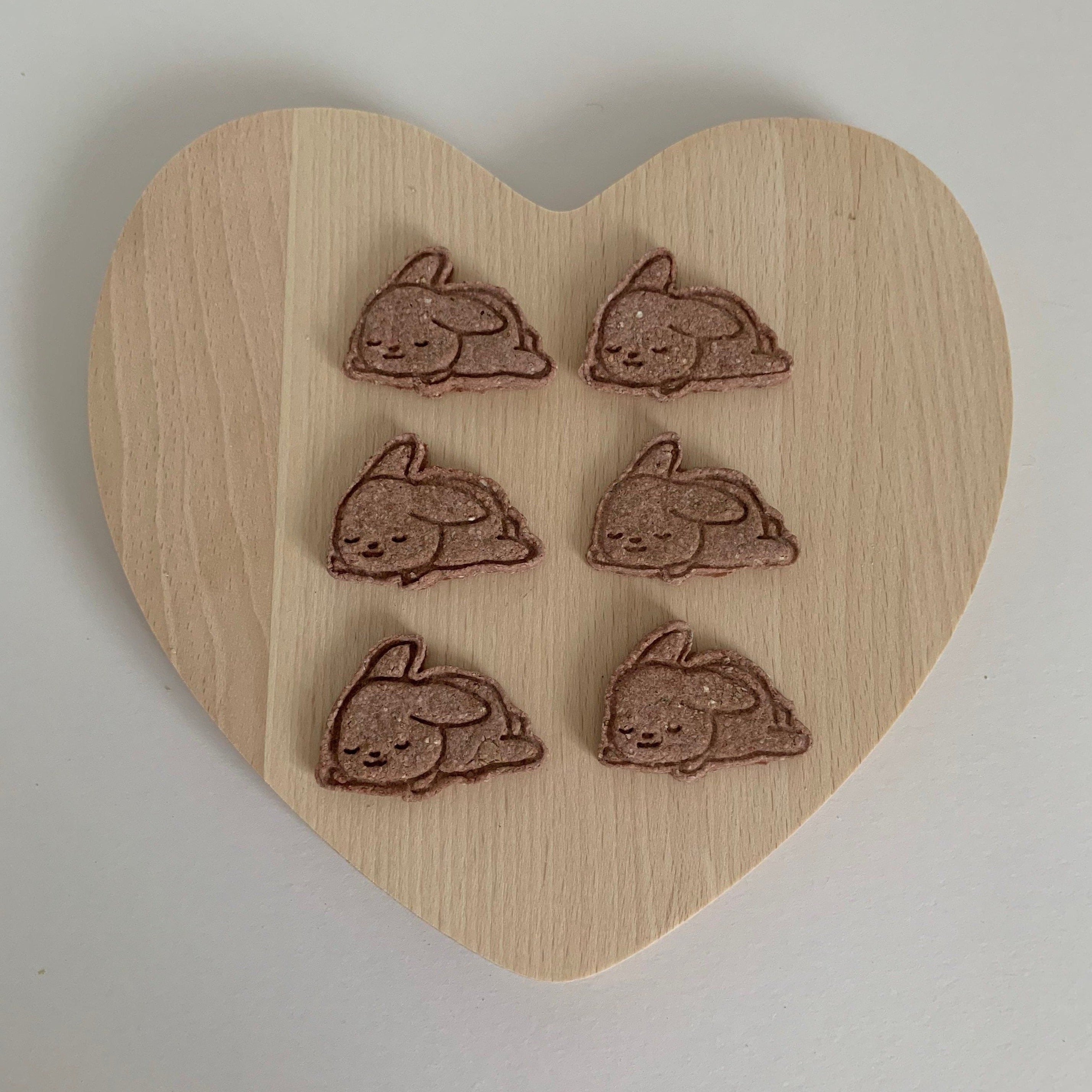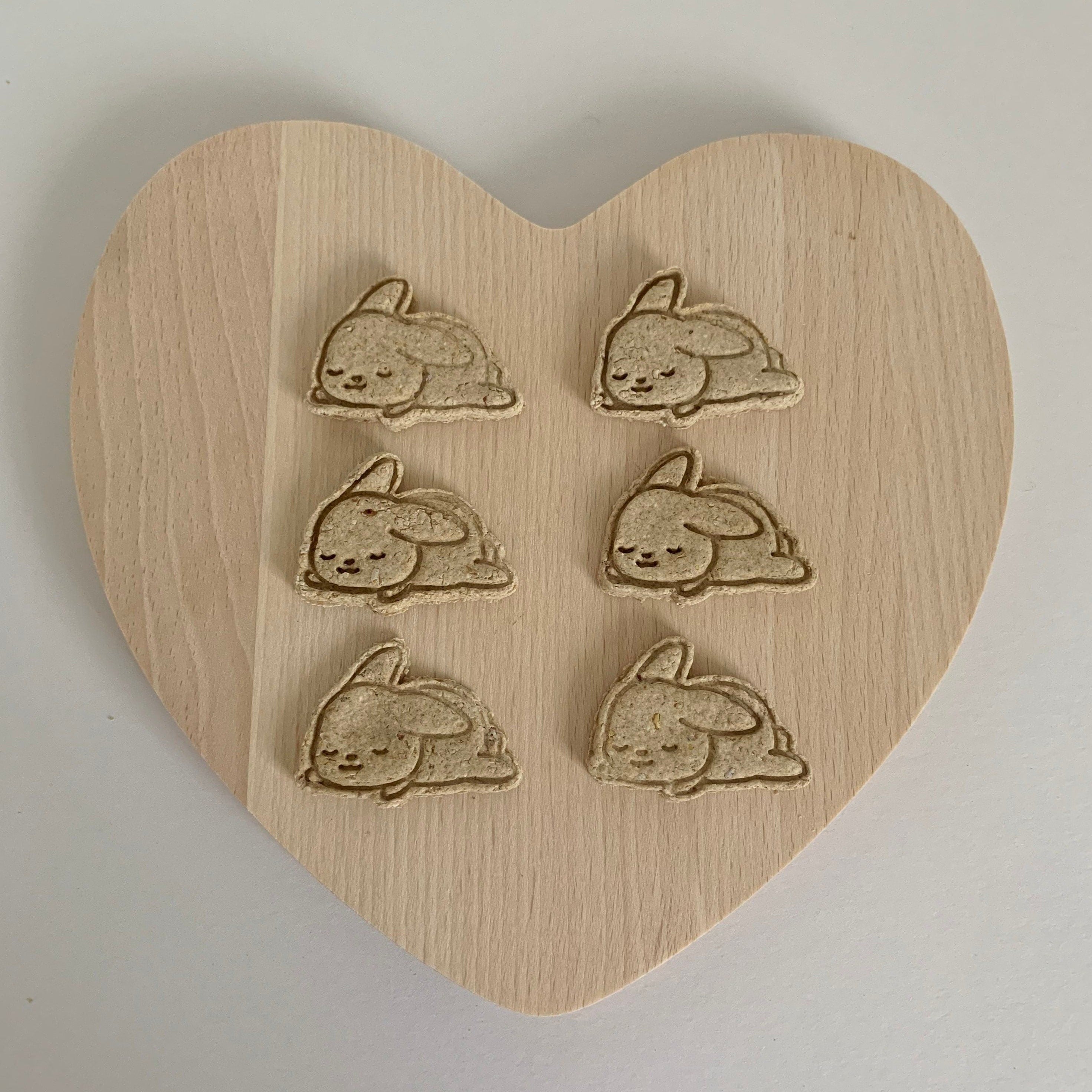 Our "Sleeping bunny" shaped treats are handmade from wholesome oats and are perfect for rabbits and other small animals to enjoy.