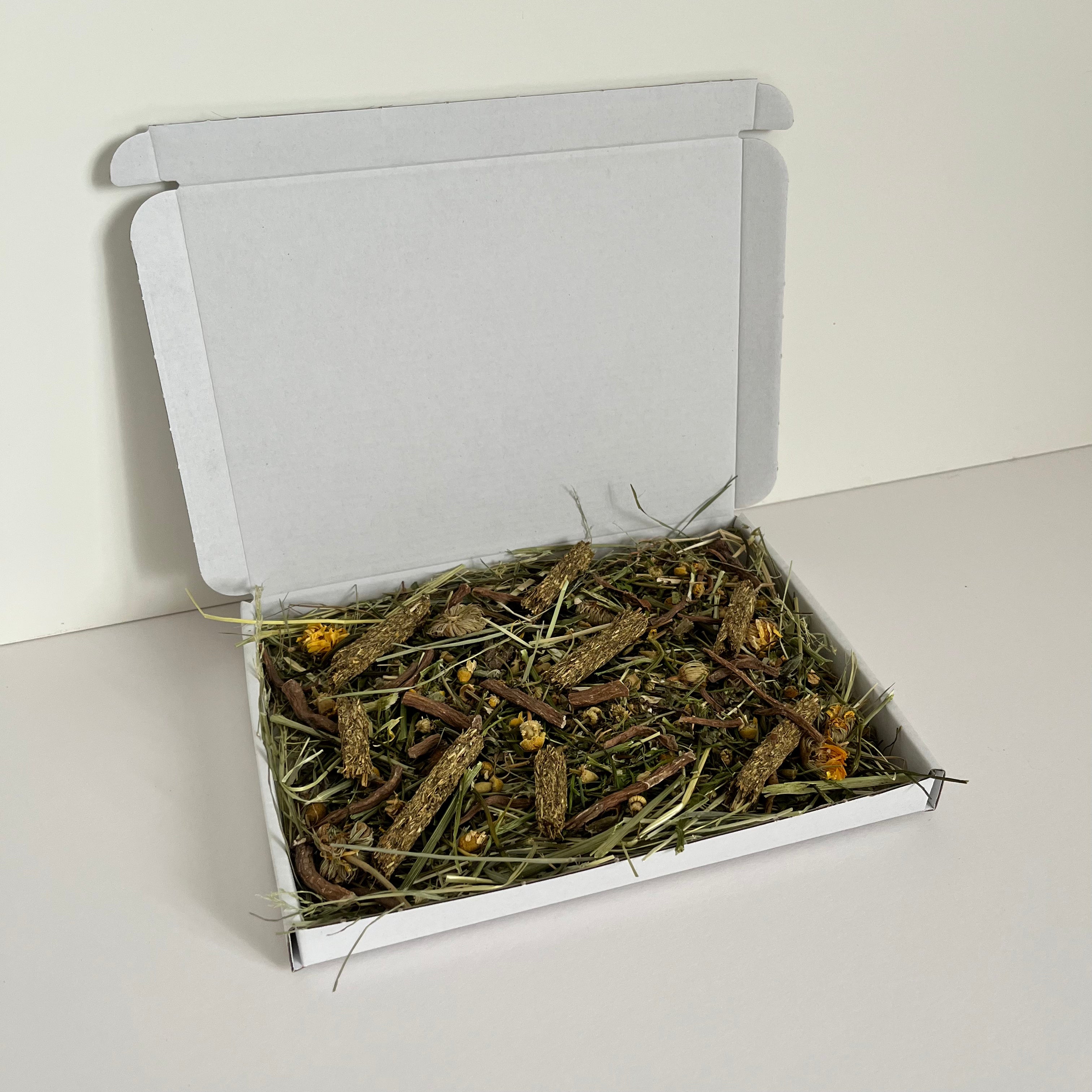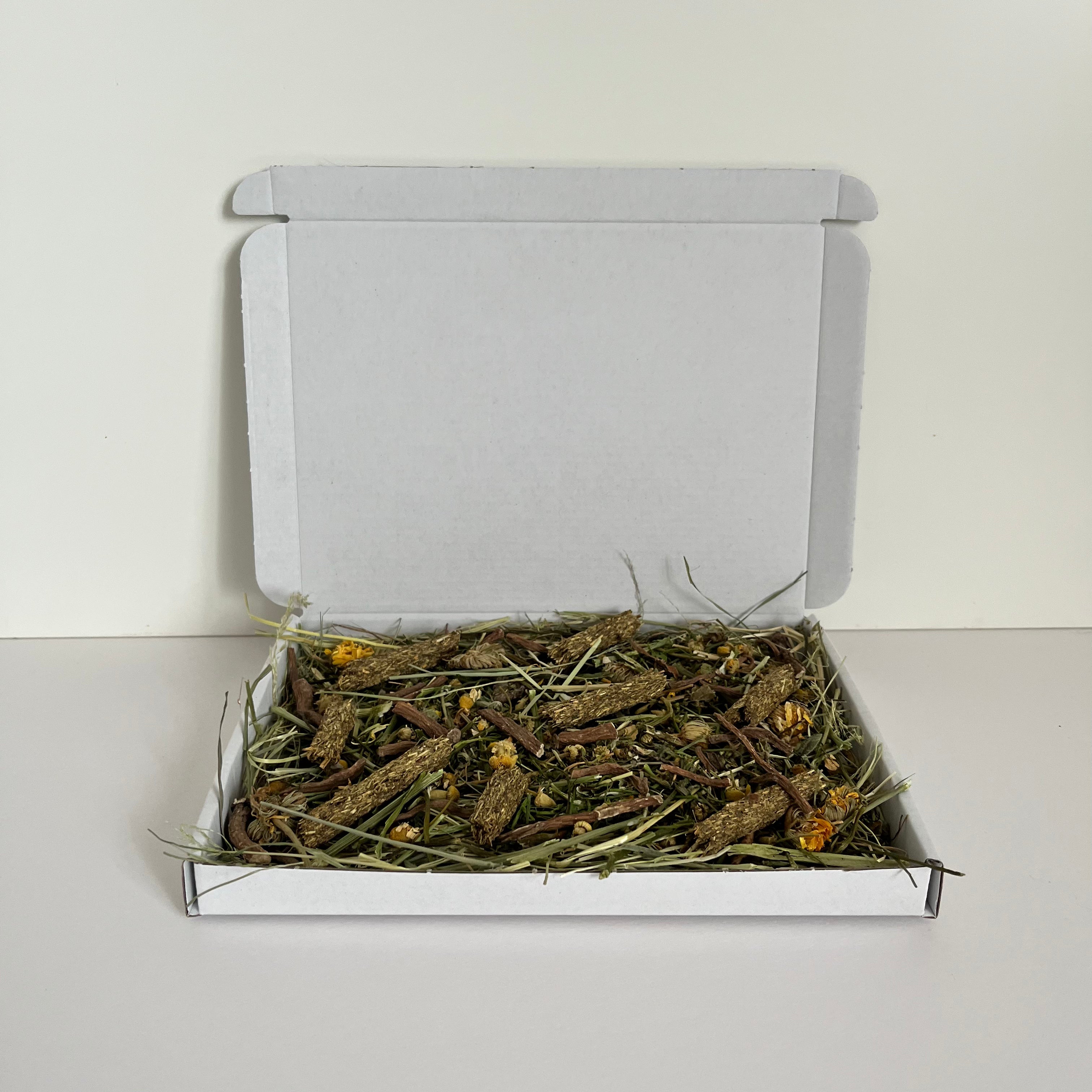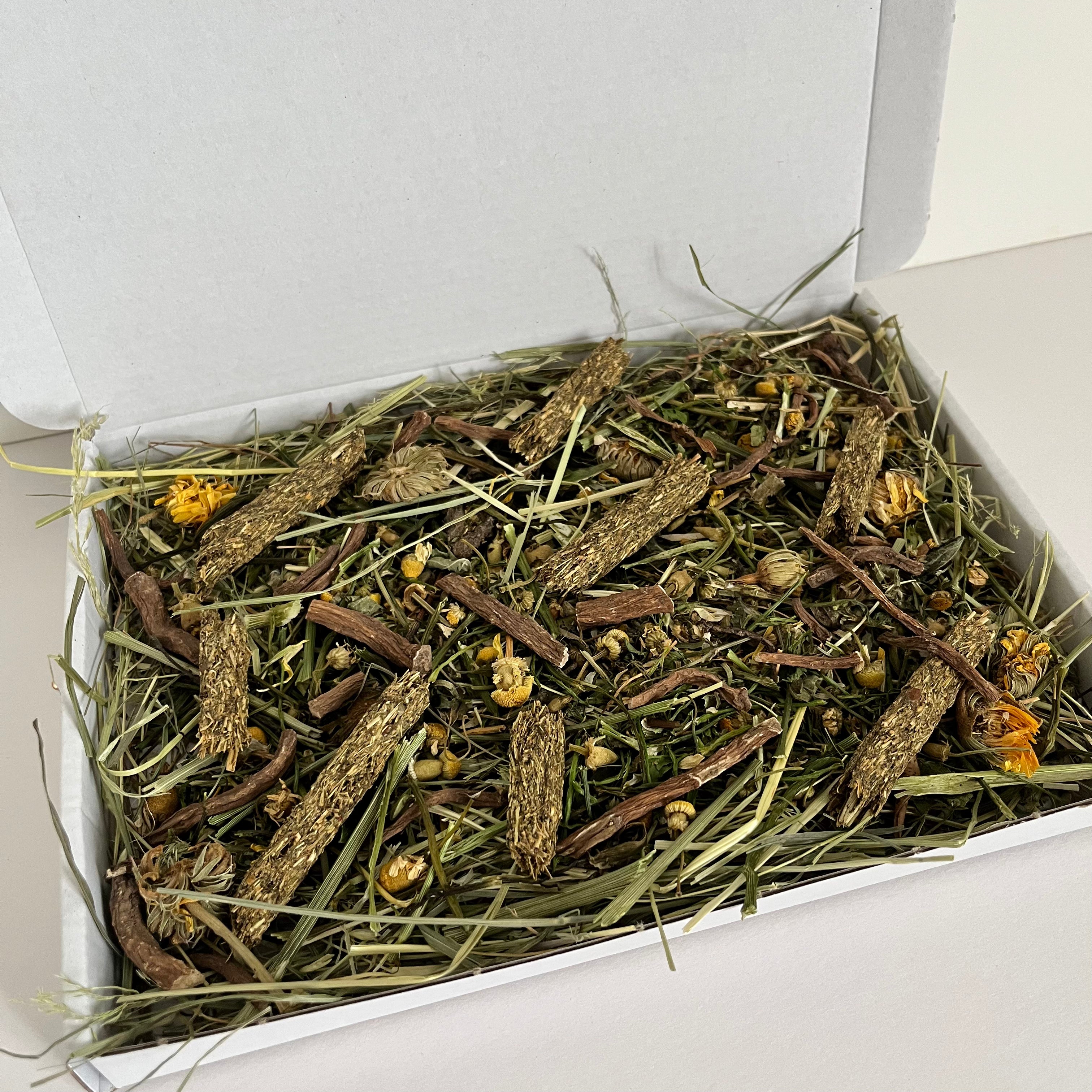 Our Digestion Forage Box, specifically designed to help small animals, like rabbits, maintain healthy digestion. This letterbox is filled with a mix of premium timothy and rye hay, our Happy Tums Happy Buns forage blend and topped with dandelion root nibbles and broken-up fibre sticks. Perfect for those looking to aid their pets digestion in a natural and tasty way!