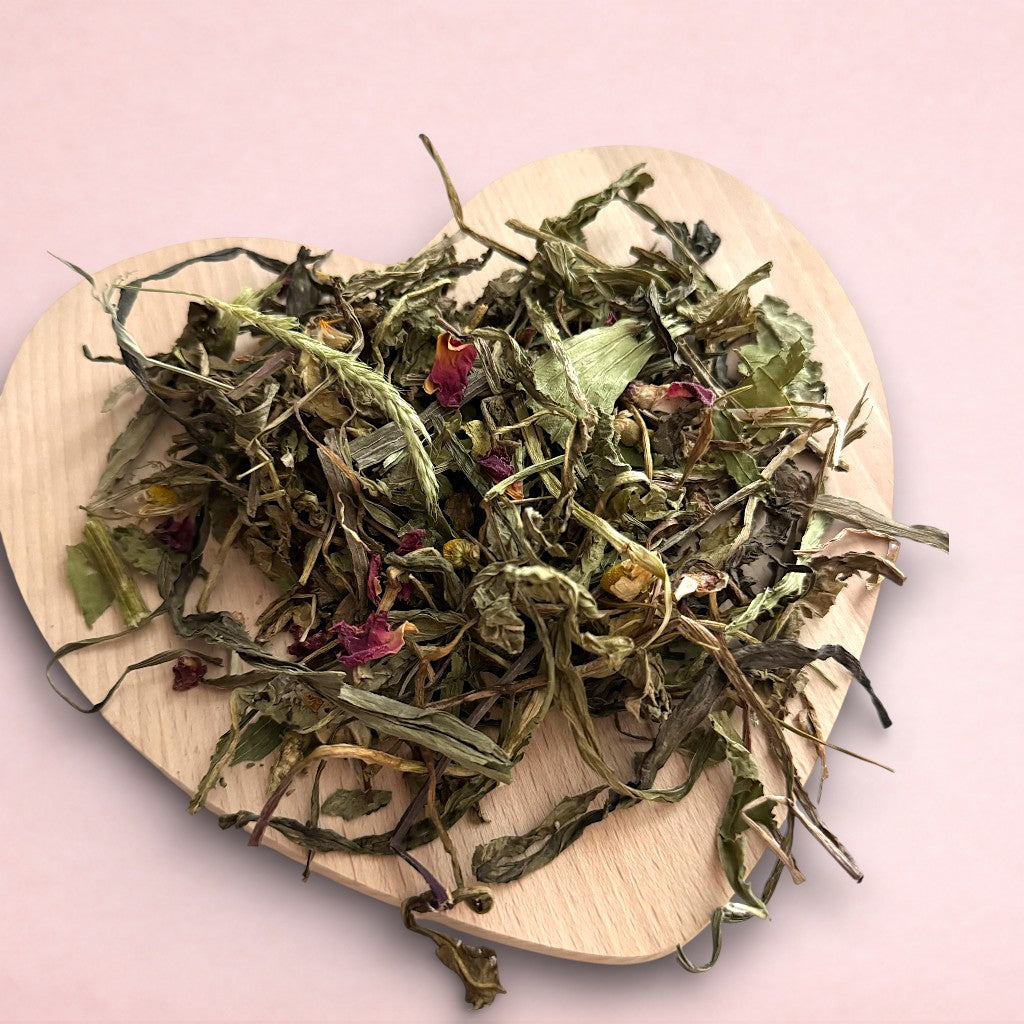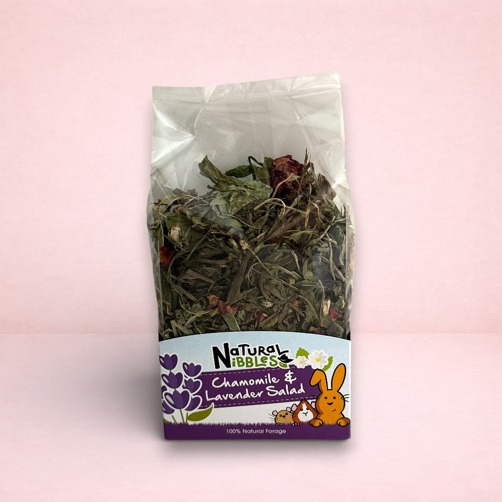 Natural Nibbles Chamomile & Lavender Salad is a high quality, health boosting forage mix, perfect for most small animals. A blend of calming herbs, flowers, and leaves, it is great for using at times of stress to relax and calm. It can be used when introduced to new enclosures or environmental changes. This blend is loved by rabbits & guinea pigs! You can simply mix these in with hay to encourage your pet's natural foraging instinct.
