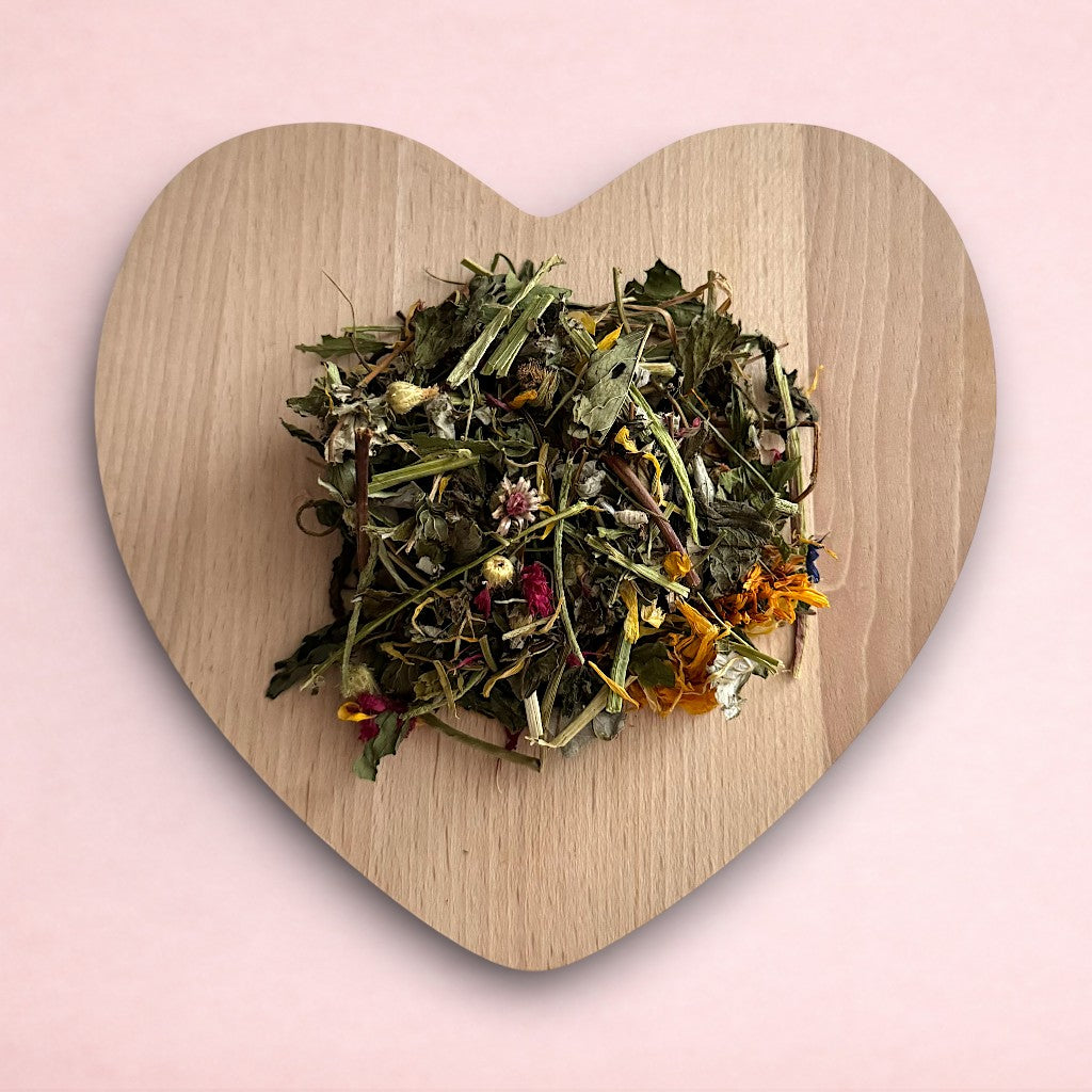 Composition: Echinacea, Parsley stalks, Nettle, Alfalfa Forage, Marigold Flowers, Premium Dandelion, Red Cornflowers, Raspberry Leaves, Spearmint.