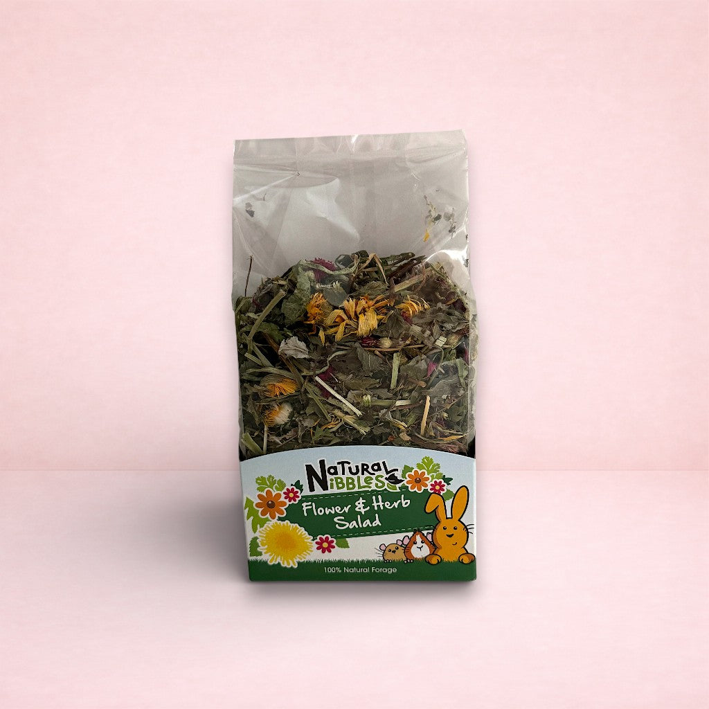 Natural Nibbles Flower & Herb Salad is a tasty, health boosting addition to the diet of small animals. It's packed full of natural vitamins that can help keep your pets active for longer. This well-balanced blend contains ingredients that are loved by rabbits & guinea pigs! You can simply mix these in with hay to encourage your pet's natural foraging instinct.