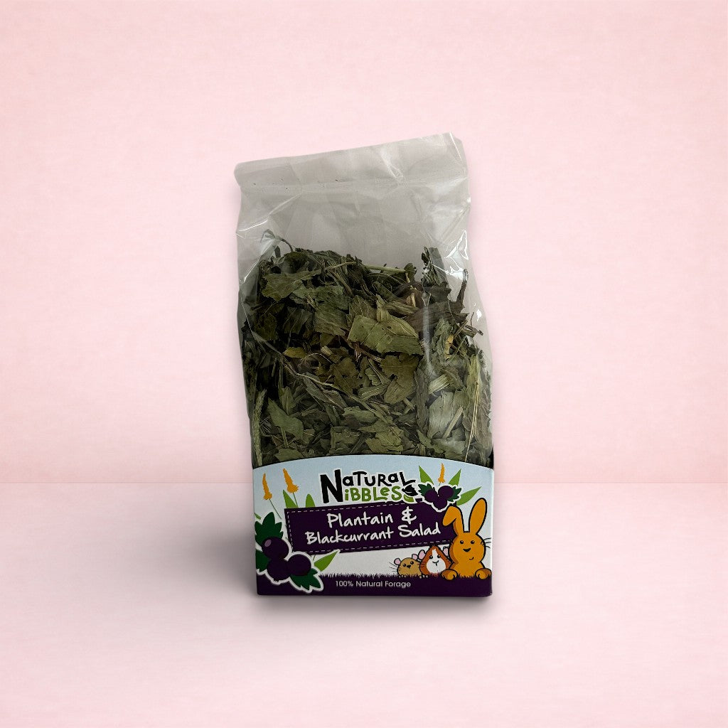 Natural Nibbles Plantain & Blackcurrant Salad is a great natural addition to the diet of your small animal. Plantain is a high fibre feed, rich in natural vitamins, minerals & trace elements. Plantain aids digestion meanwhile blackcurrant helps strengthen the immune system. These leaves are much loved by rabbits & guinea pigs! You can simply mix these in with hay to encourage your pet's natural foraging instinct.