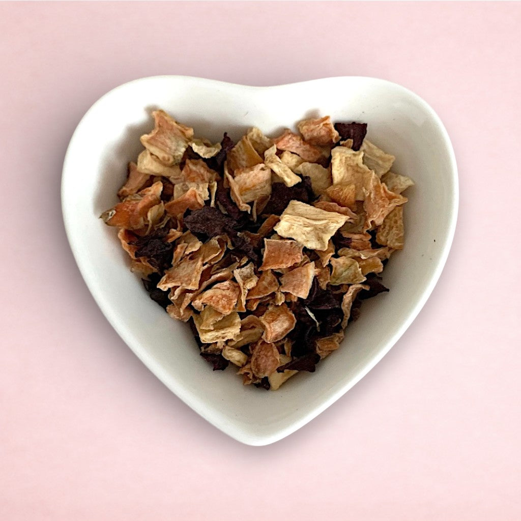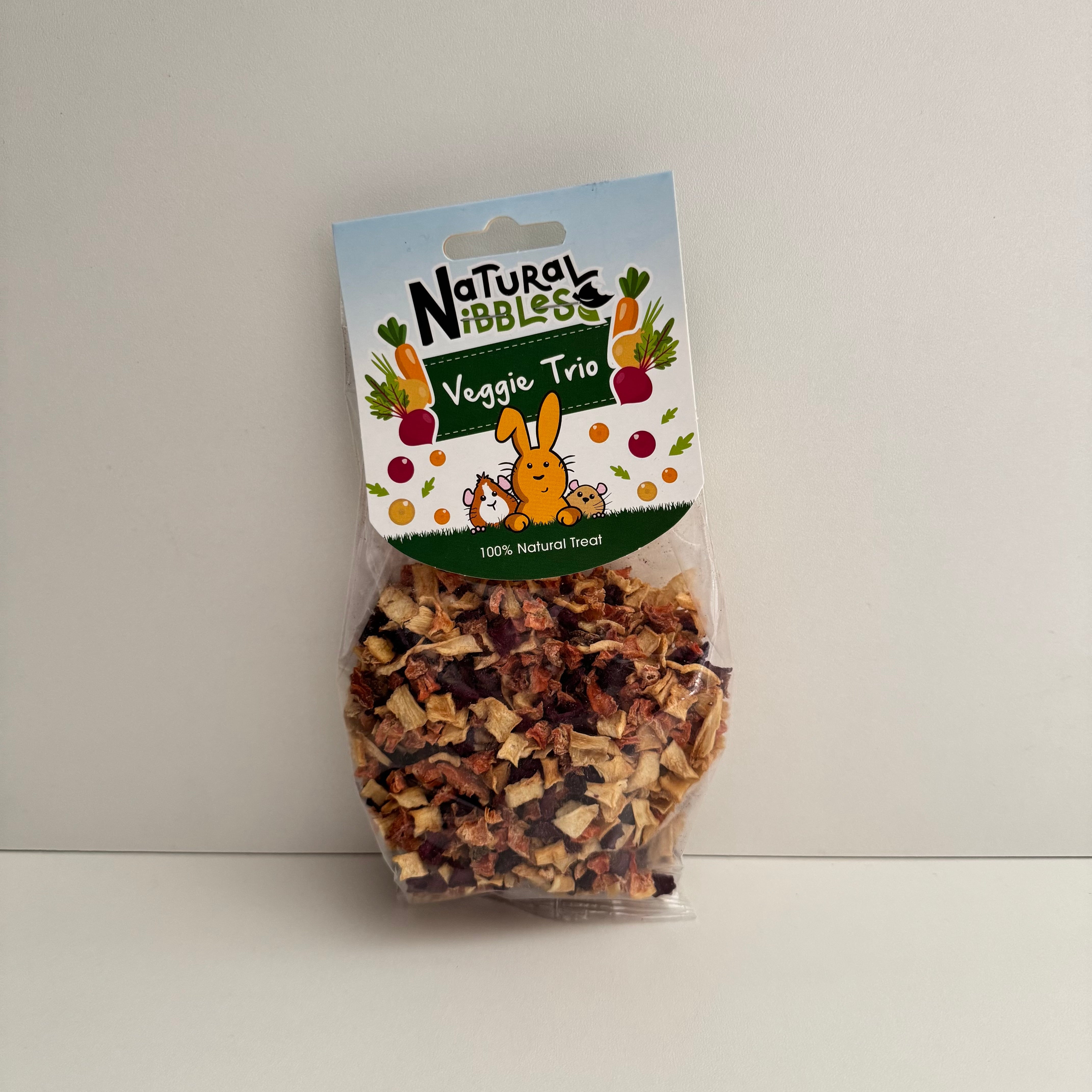 Natural Nibbles Veggie Trio Mix is a blend of dried carrot chips, dried parsnip chips & dried beetroot chips. This blend is perfect for feeding as part of a natural diet, as a treat or mixed with their current food as a natural energy boost. As this mix is made from small chips, it's easy to ensure only a small amount is fed and they are perfect for using in activity toys!