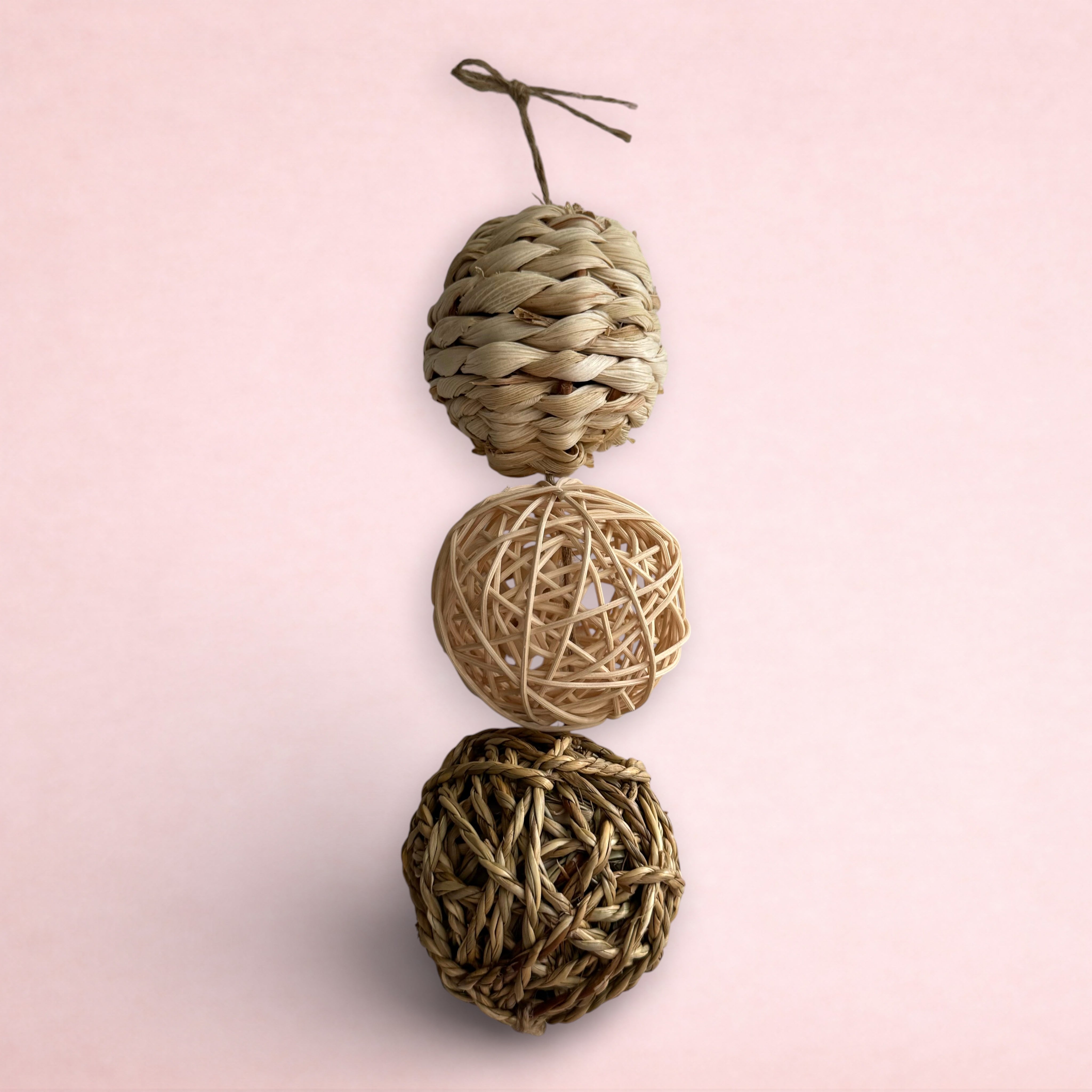 The Nature First Ball Hanger is a durable, three-piece hanging toy for rabbits. Made from edible materials such as rattan, sea grass, and willow, this toy provides both entertainment and a tasty snack for rabbits and guinea pigs. Keep your pet happy and satisfied with this unique and natural toy.