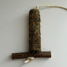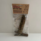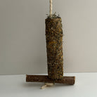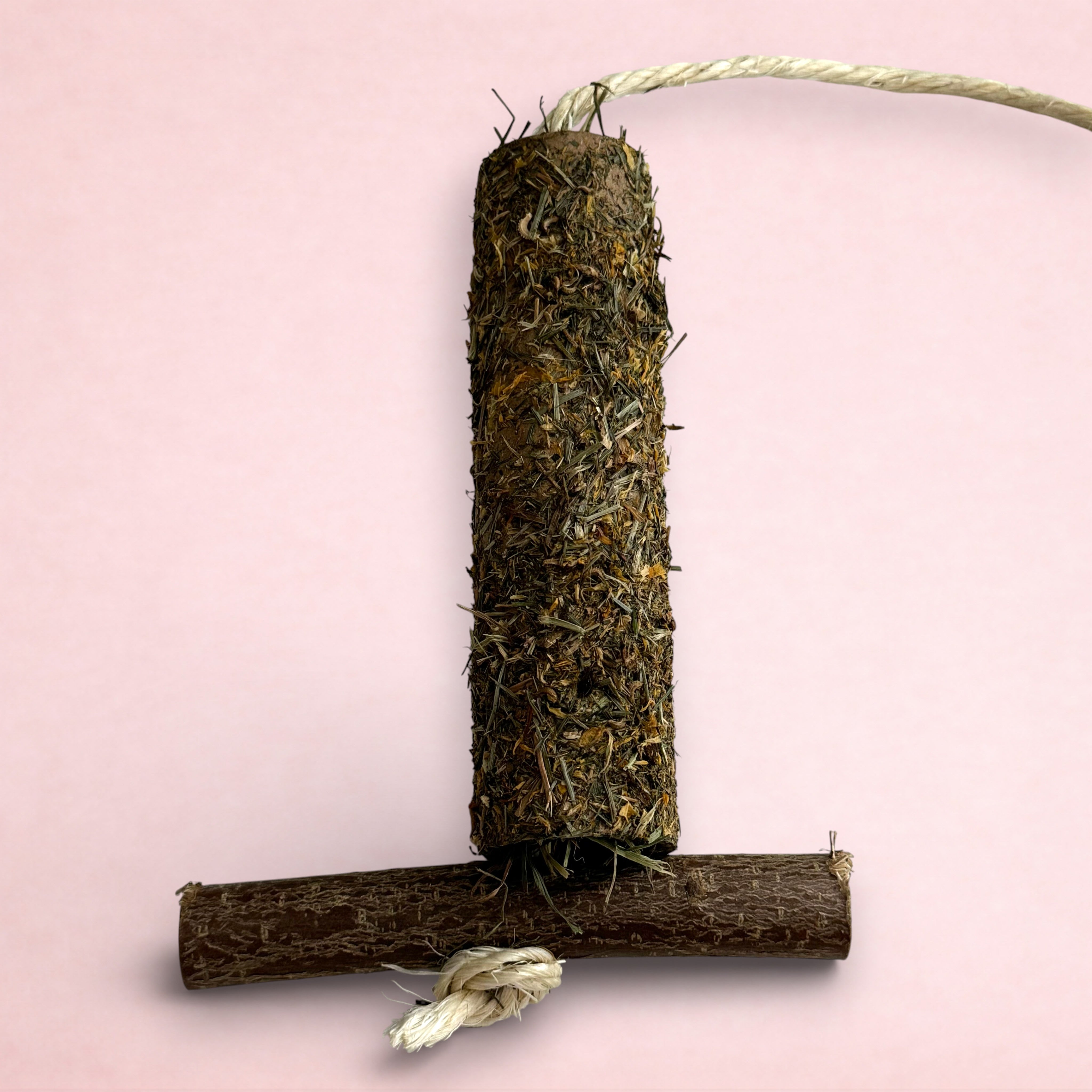 As your rabbit tries to eat the wonderful meadow hay that coats and fills the parchment tube, they will occasionally release one of the 'hidden' grainless drops! The wonderful hazelnut branch also helps to wear growing teeth.