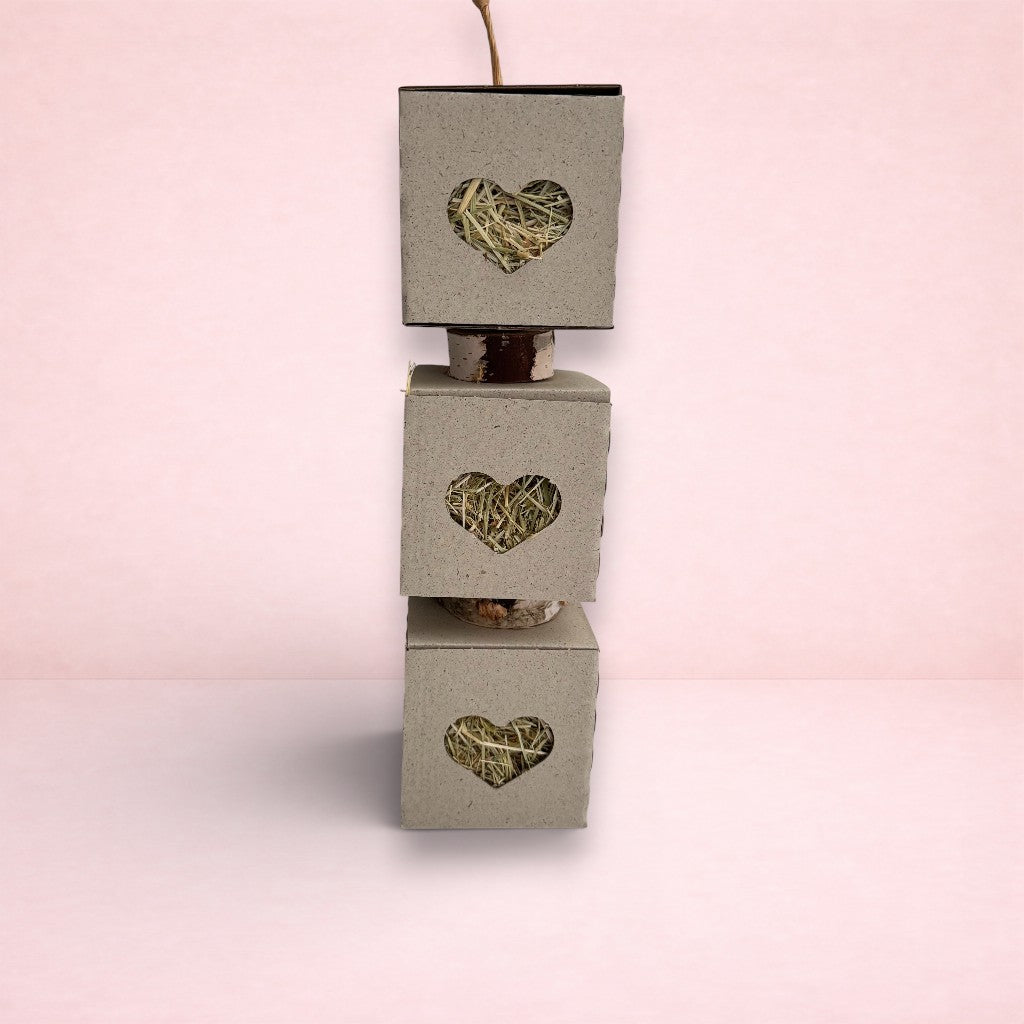 Each of these three large, edible, grass-based boxes is filled with delicious sweet grass with a blend of aromatic and beneficial rose, lavender, lemon balm, peppermint and marigold flowers. Each 9.5cm cube is threaded on a twisted-paper hanger with two natural wooden gnaws, ready to hand for pets to nibble, forage and generally destroy! Suitable for rabbits, Guinea pigs, and other small animals.