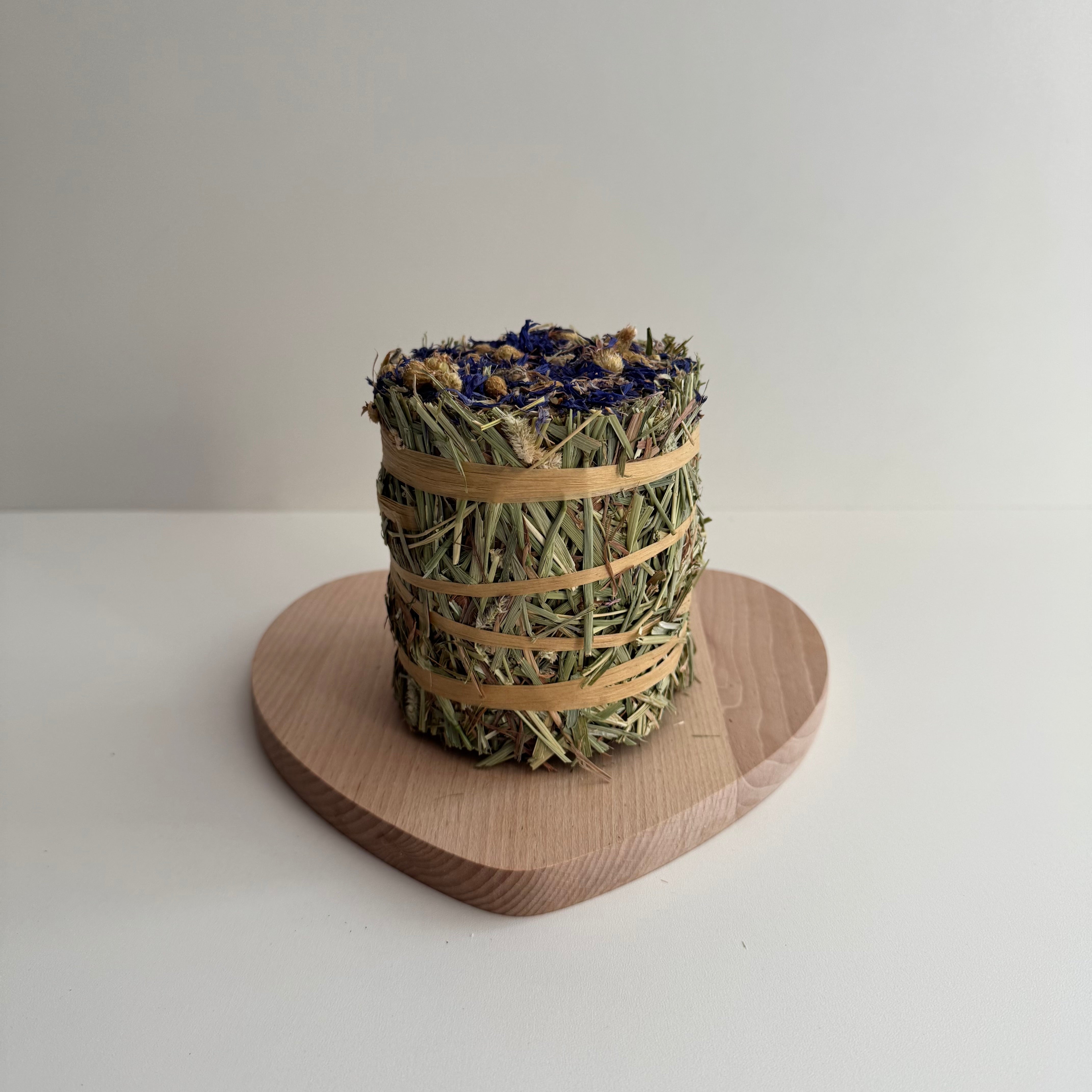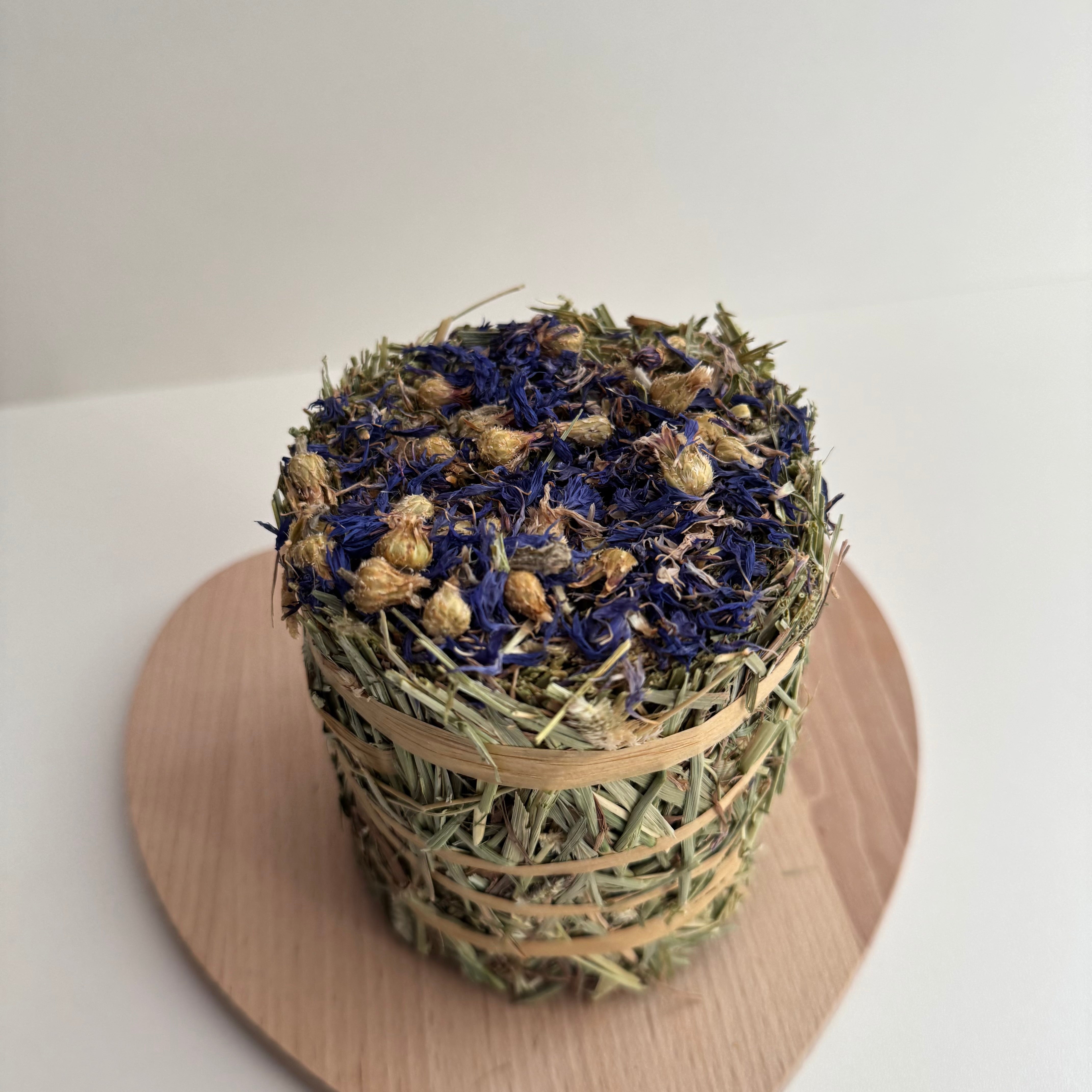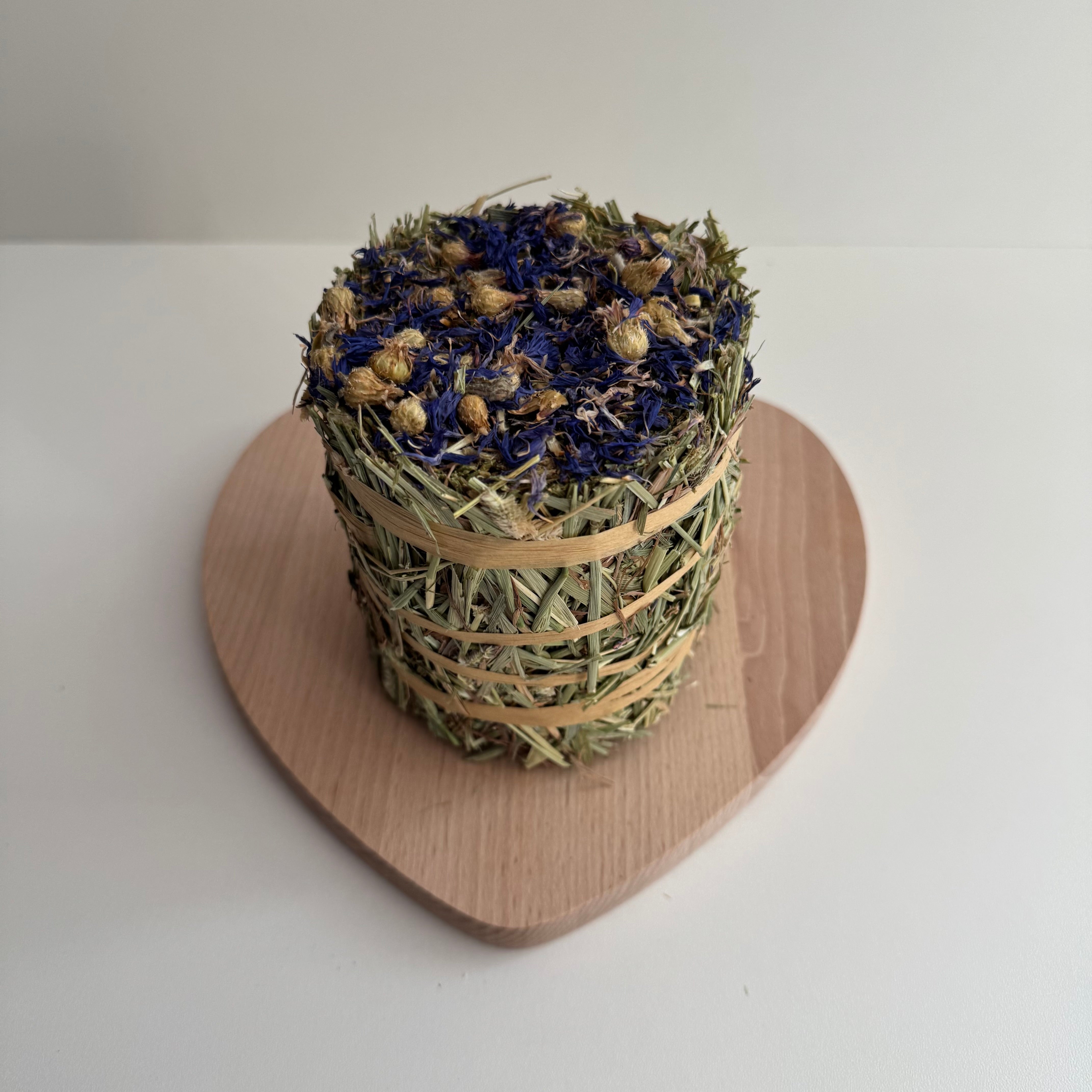 Made using only premium Canadian timothy hay, these hay rolls make a fantastic & nutritious enrichment treat that’s packed full of healthy dietary fibre! These beautiful rolls are formed under just the perfect amount of pressure to create a mini bale that’s bound using a 100% natural paper strap, then topped with a generous portion of blue cornflower.
