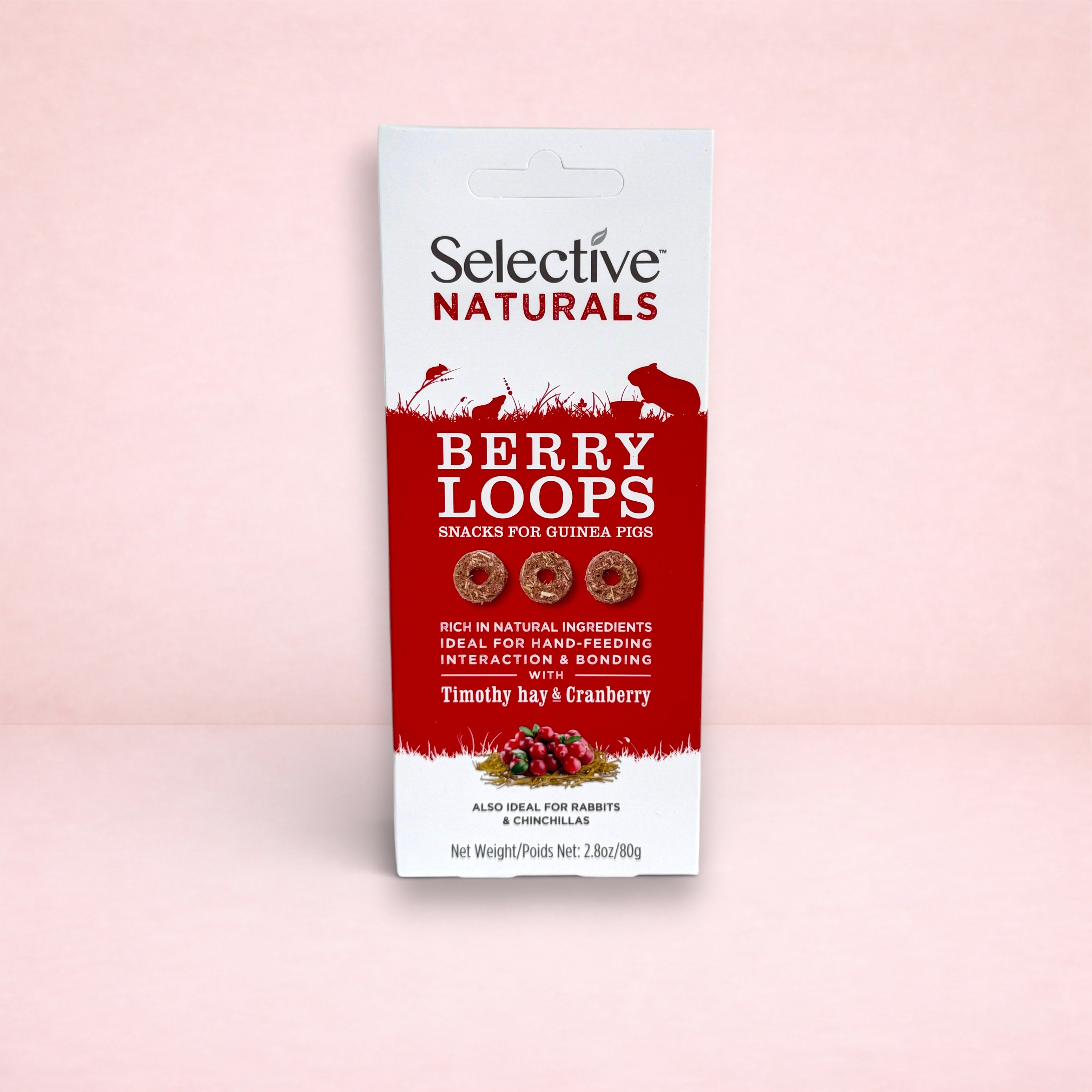 Selective Naturals Berry Loops (Timothy Hay & Cranberry) are delicious hay based treats. They are high in fibre and perfect for pets with a sensitive digestive system, making them a healthier alternative.