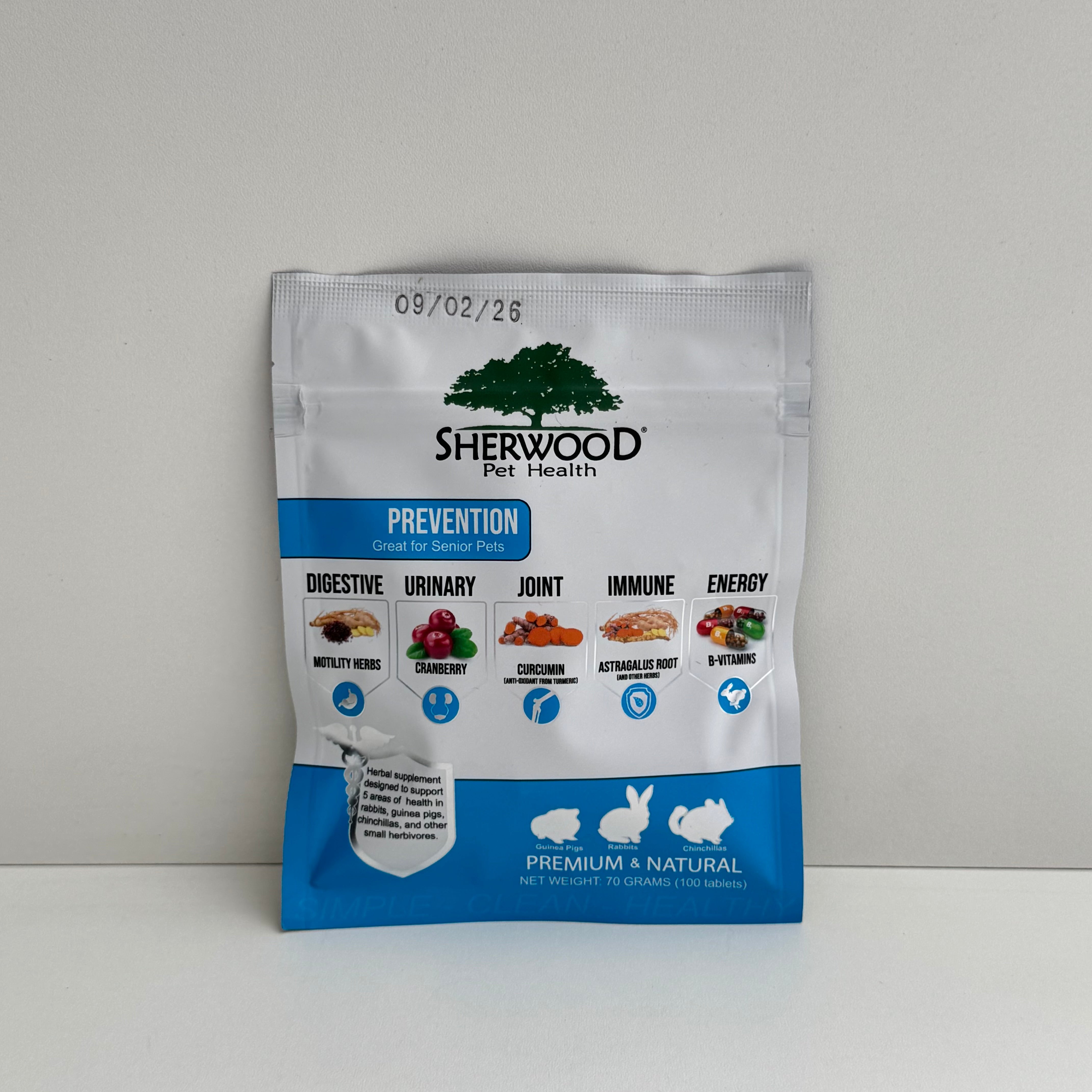 Sherwood Pet Health Prevention is a dietary supplement designed to support the overall health and wellbeing of rabbits, guinea pigs, and other small animals.