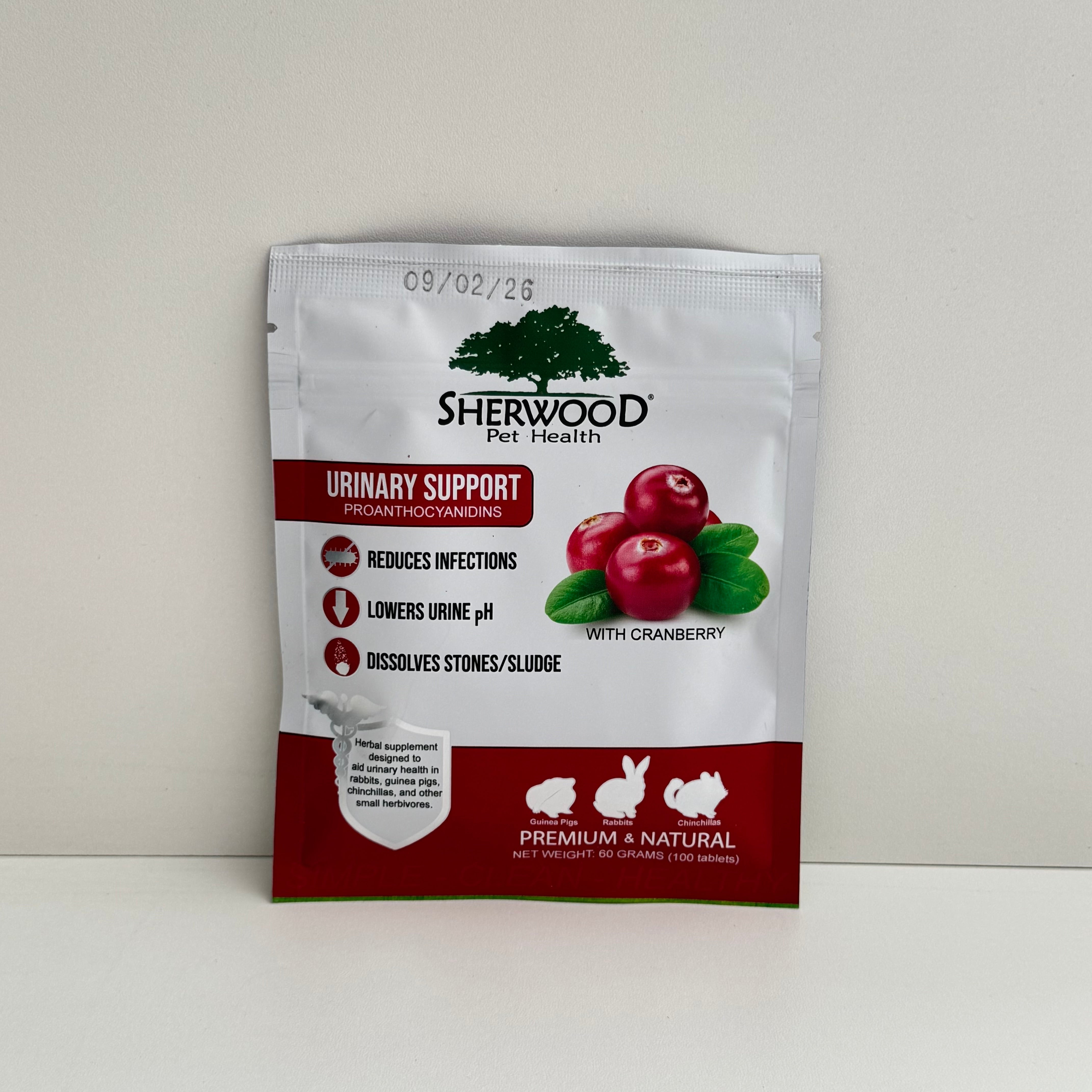 Sherwood Pet Health Urinary Support is specially formulated to help maintain urinary health in rabbits, guinea pigs, chinchillas, and other small animals. Using the natural power of cranberry and other botanicals, this supplement supports your pet’s urinary tract to keep them happy and healthy.
