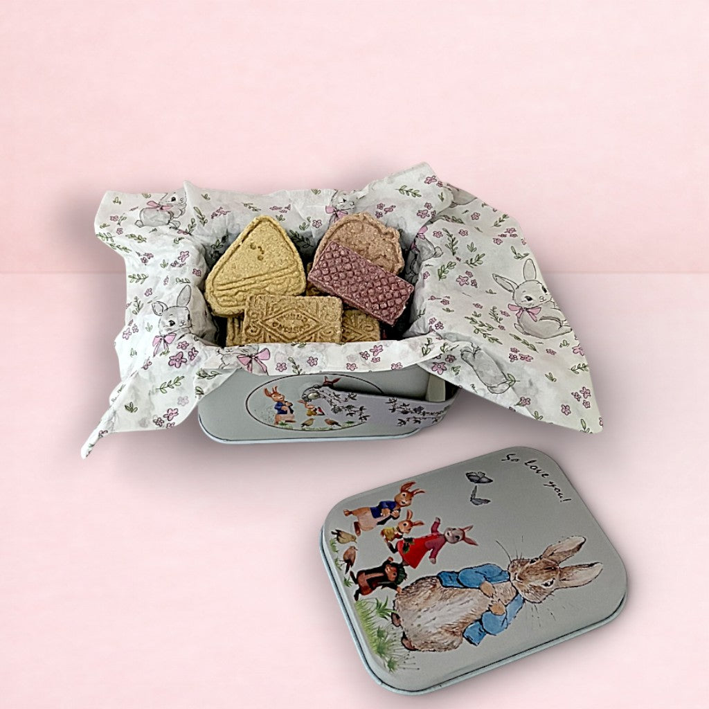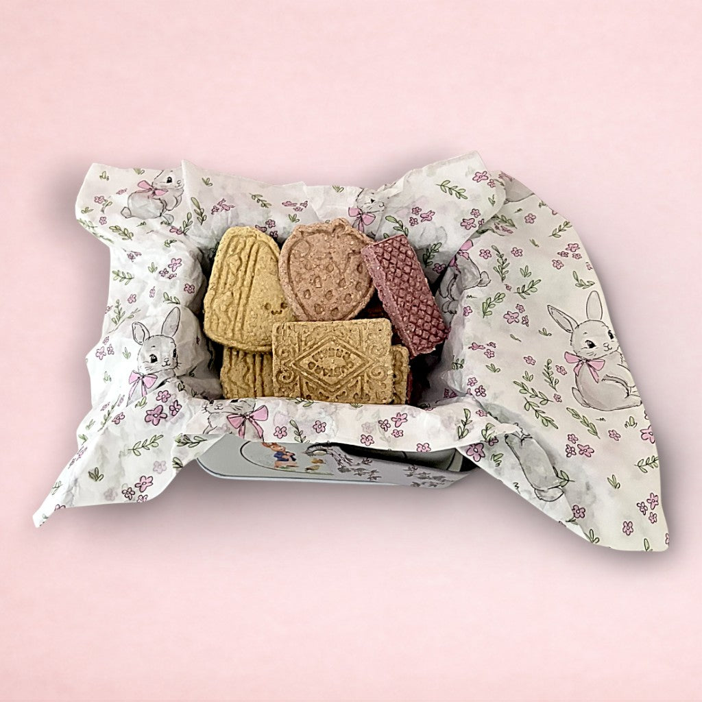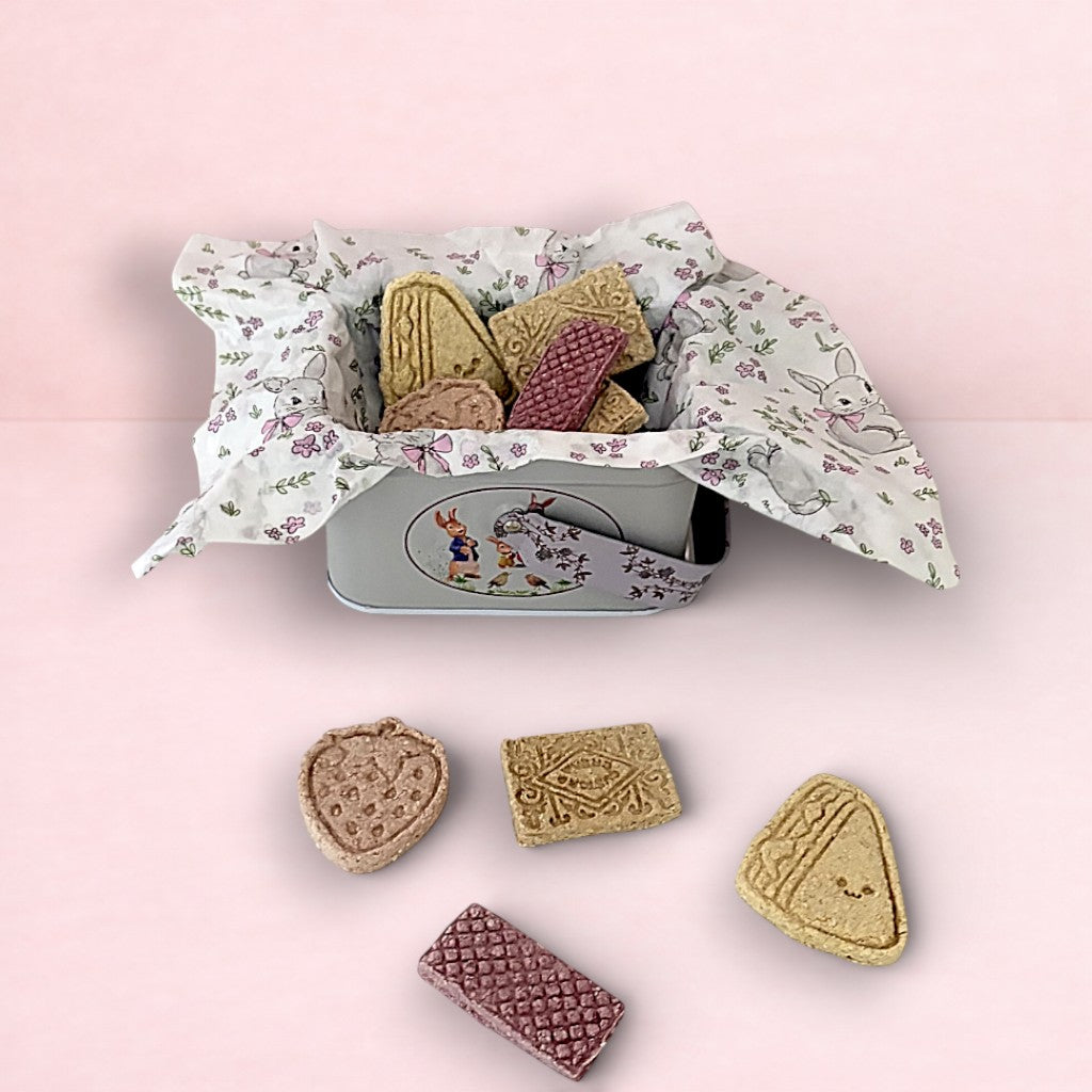 Treat your rabbit to this adorable picnic tin, filled with four packs of tasty oat treats: Strawberry Strawberries, Apple Sandwiches, Banana Custard Cream Biscuits, and Raspberry Pink Panther Wafers.