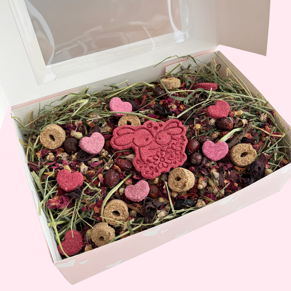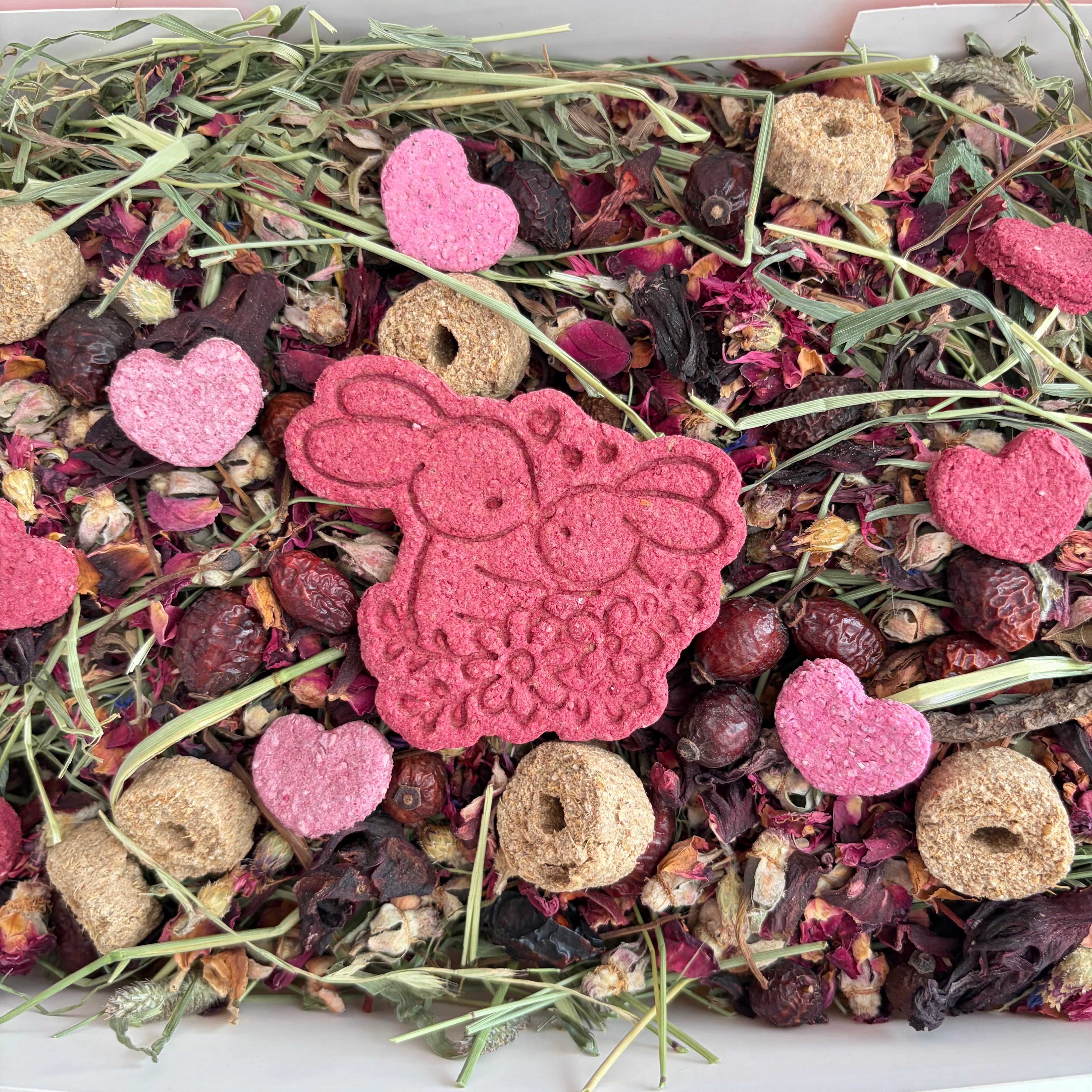The Bunnytine Banquet Box is the perfect feast for your small pets this Valentine's Day. Each beautiful heart box comes filled to the brim with a blend of Timothy Hay, topped with our Hops And Kisses Blend, a handful of Barley Rings, Rose Hips and a beautiful Valentine's bunny themed oat treat in the flavour beetroot. What more could your small pet want this Valentine's day?!