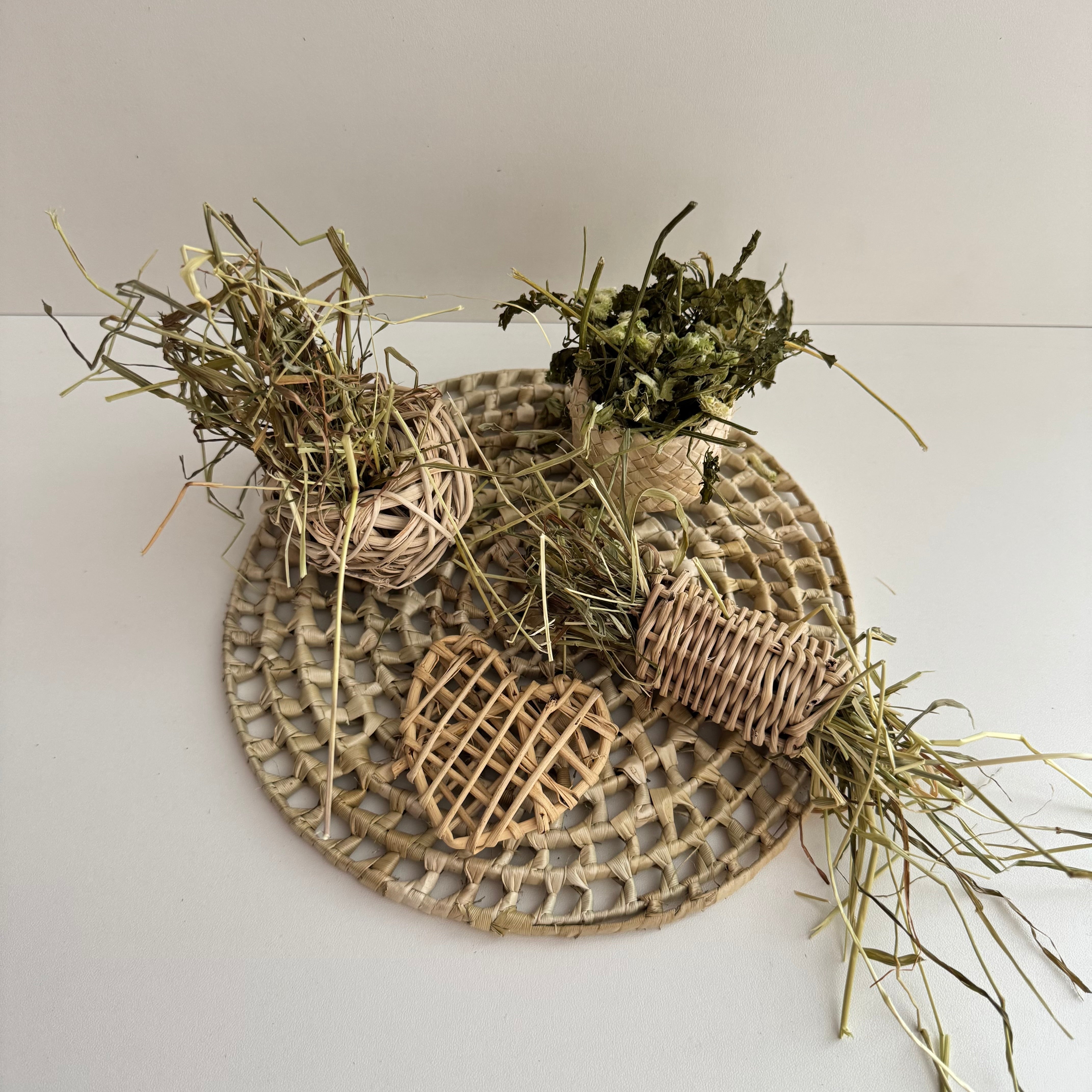 Keep your bunny busy, happy, and mentally stimulated with our brand-new enrichment mats! This mat encourages natural foraging and digging behaviours while helping to prevent boredom. Each mat has multiple textures and is also filled with timothy hay, flat leaf parsley & broccoli nibbles. Once your rabbit has eaten the forage, you can refill again and again with their favourite forage or treats.