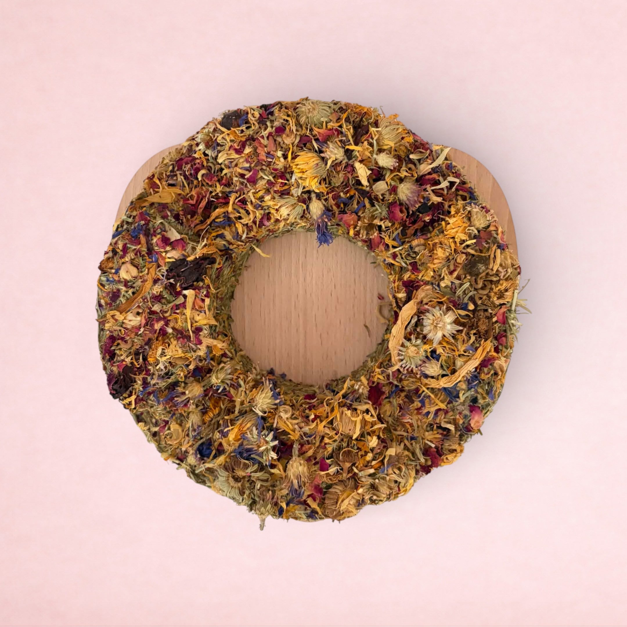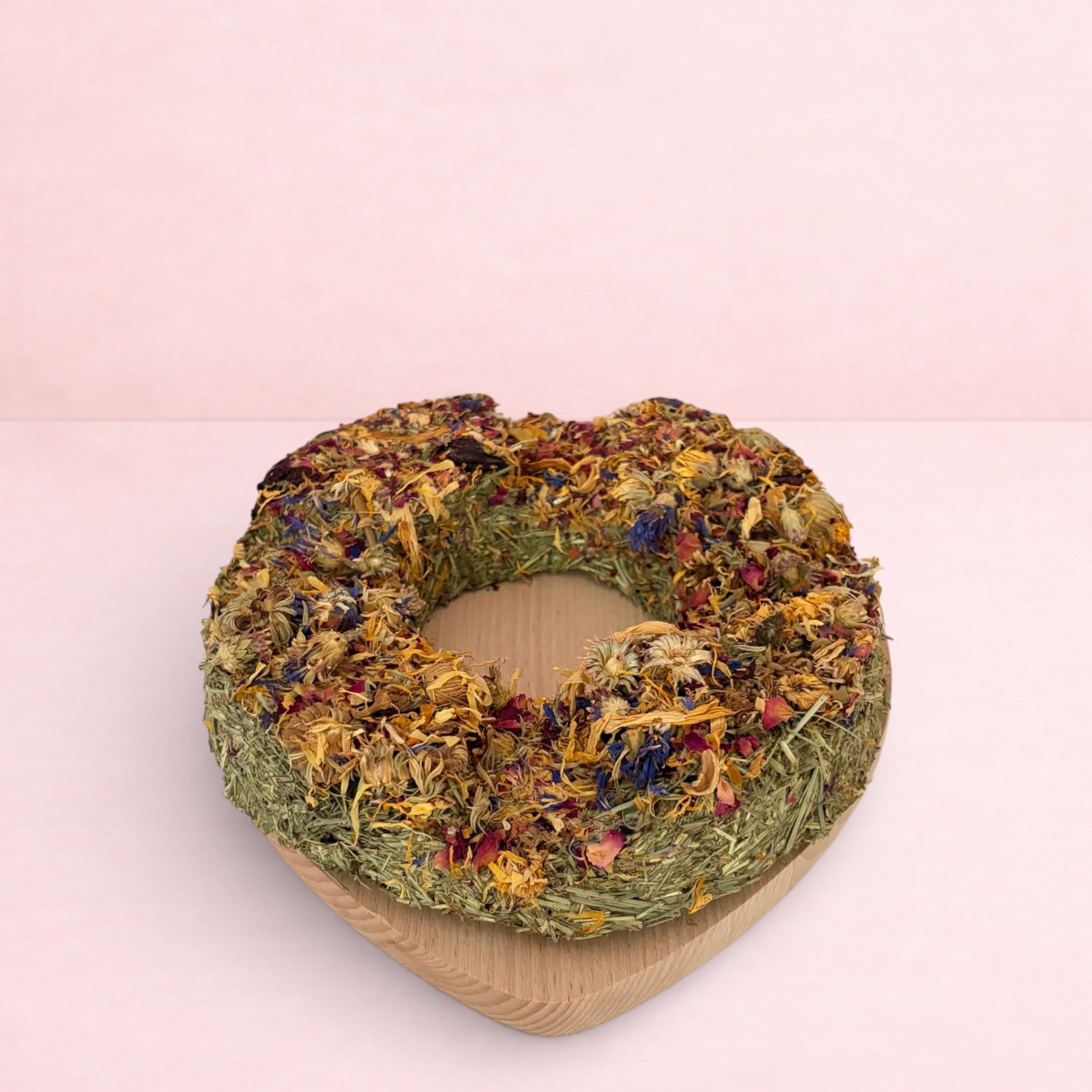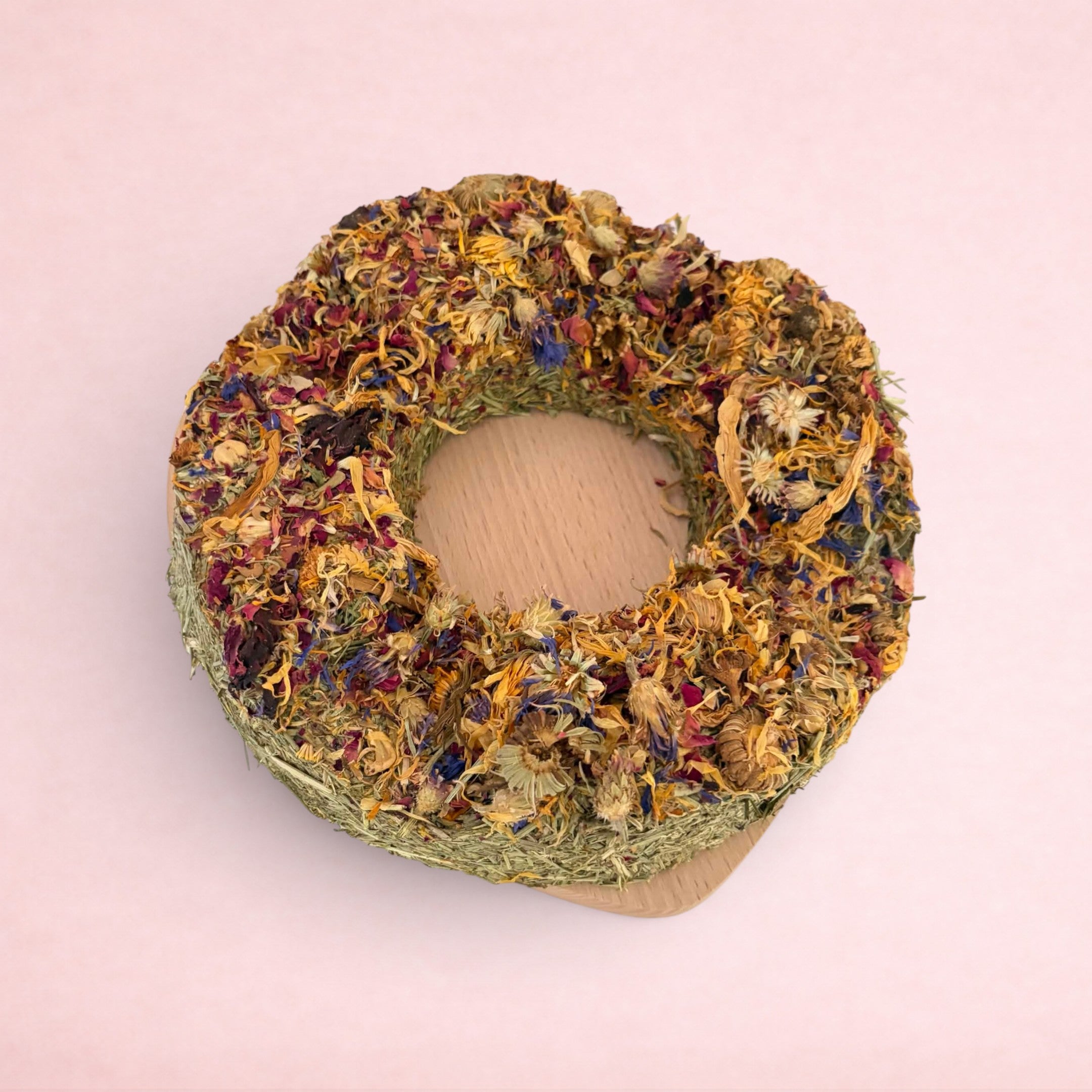Great for sharing, this round dried grass hoop with Flower Petals is a complementary, fun daily treat to help promote foraging and teeth health. Made from delicious hay, with marigold, rose petals, cornflowers and sunflowers, suitable for small animals.