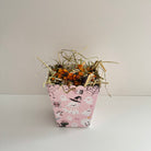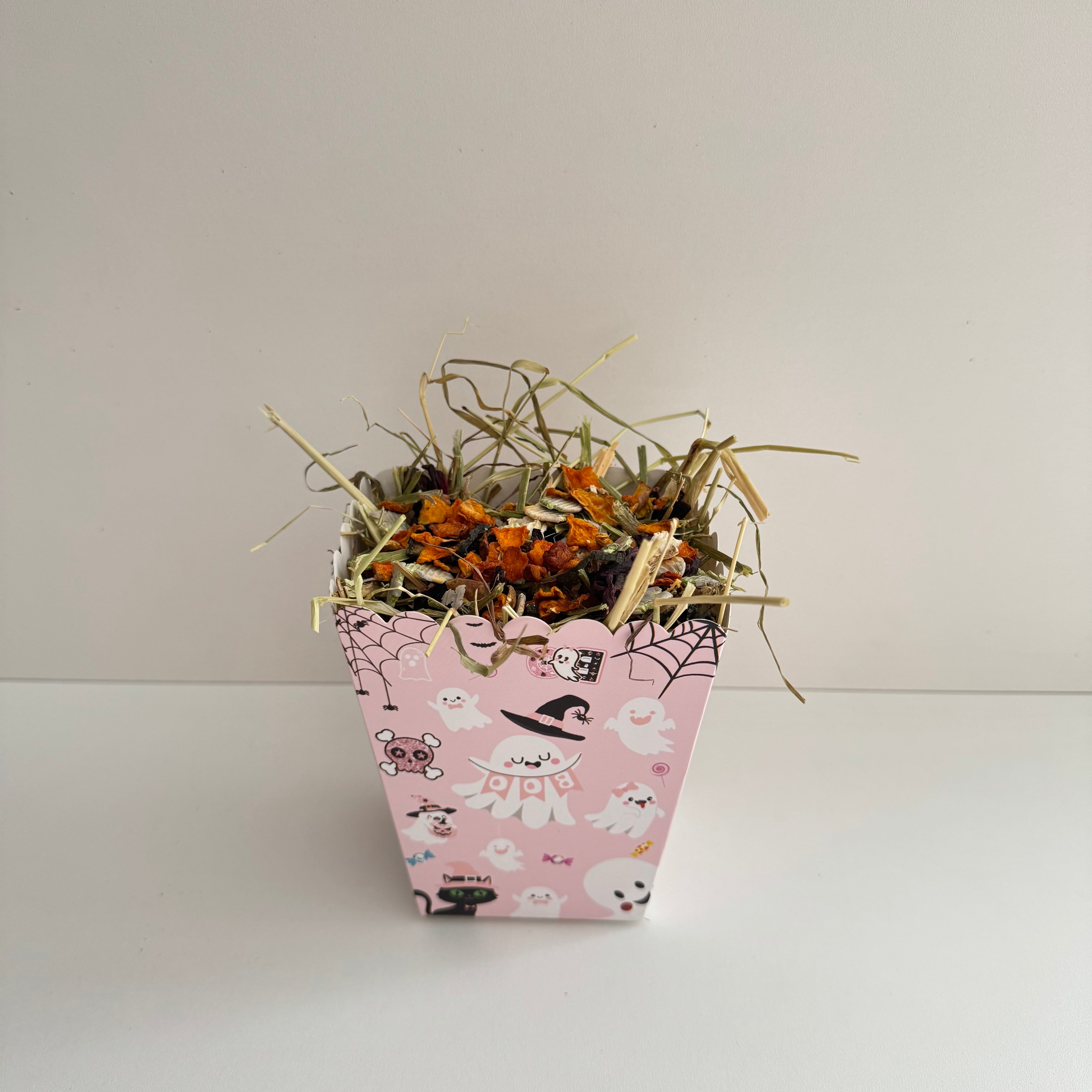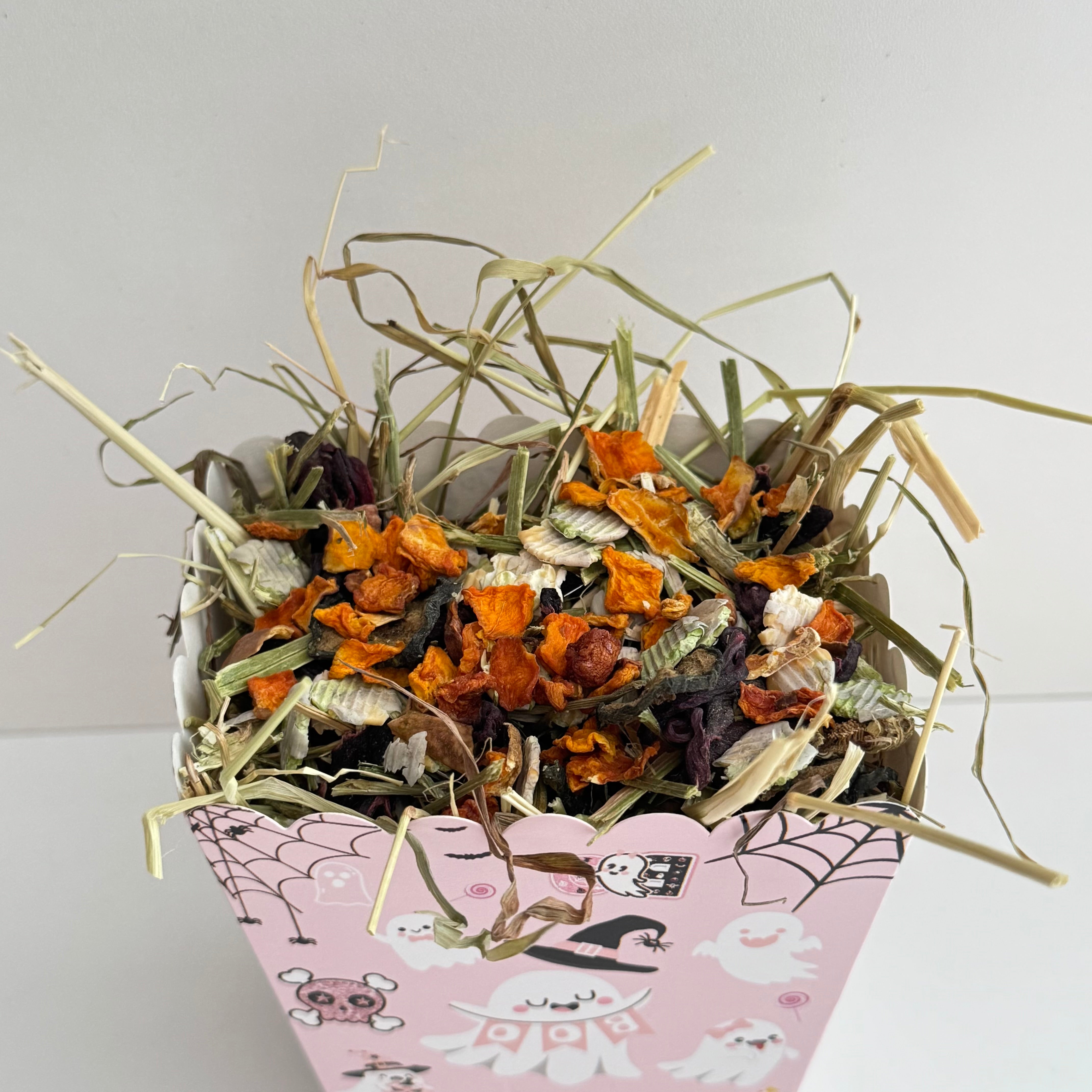 This adorable pink, ghost-themed Halloween snack box is filled with timothy hay, our Pumpkin Spice forage blend, and topped with pumpkin and pea flakes. A spooky-sweet treat for your rabbit or small pet this Halloween!