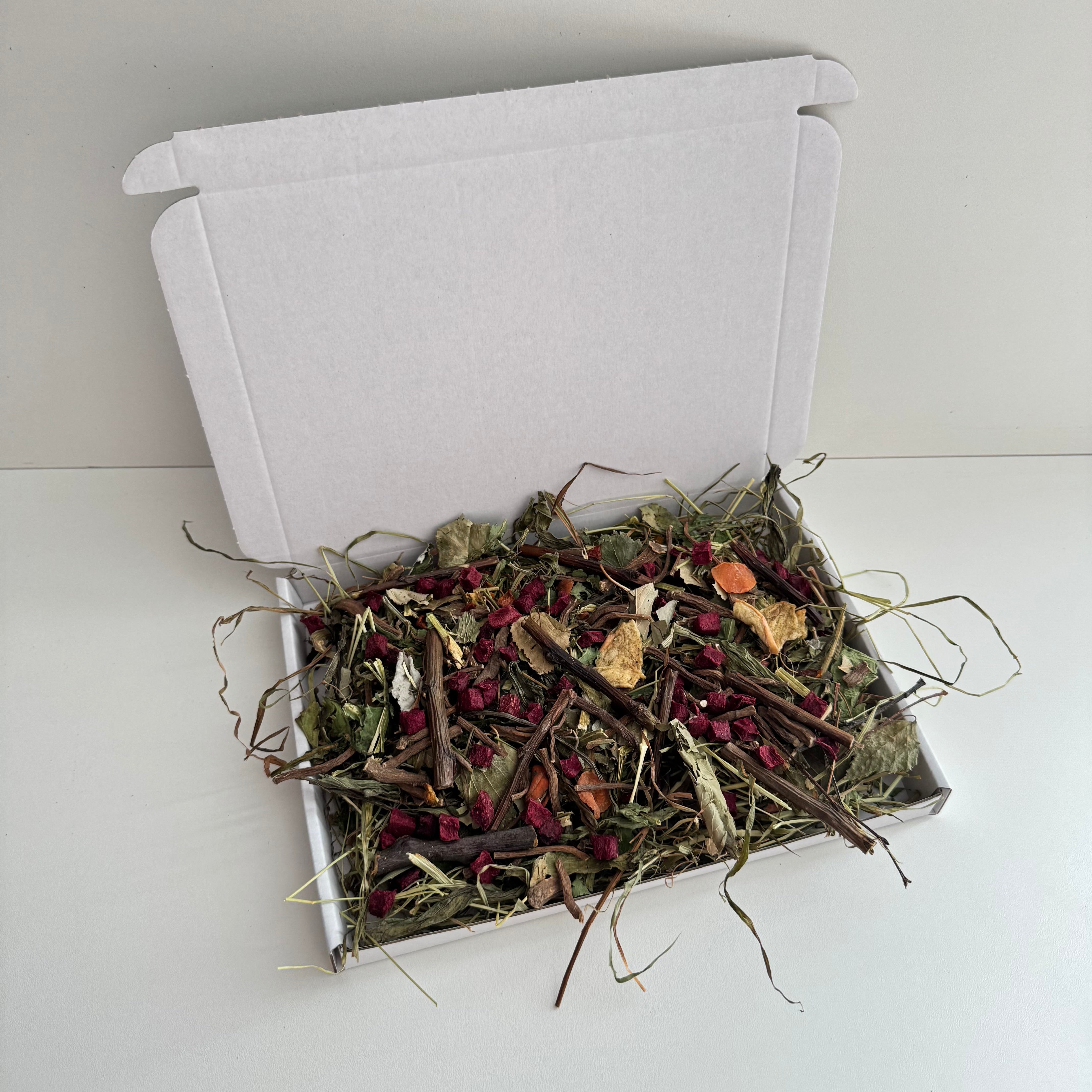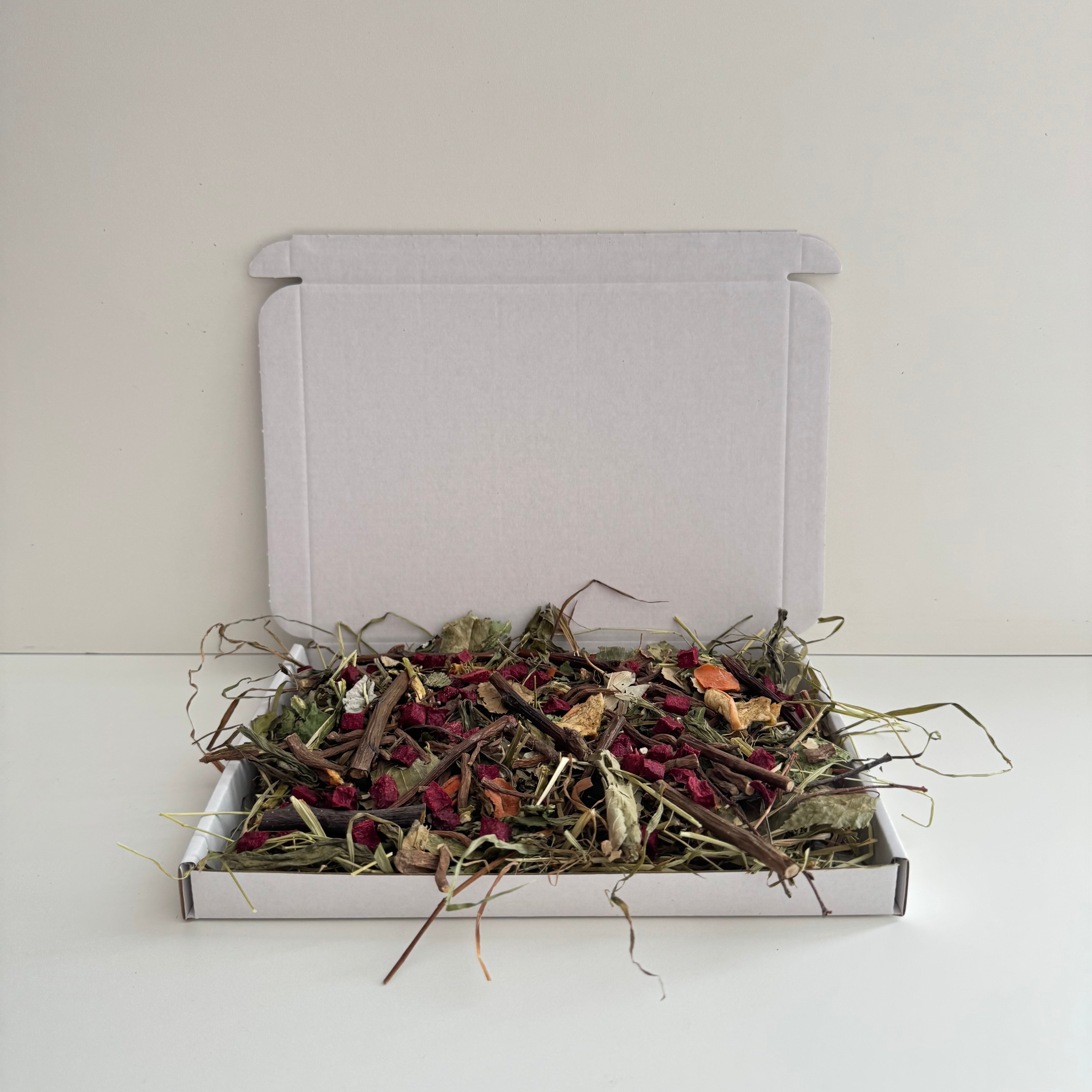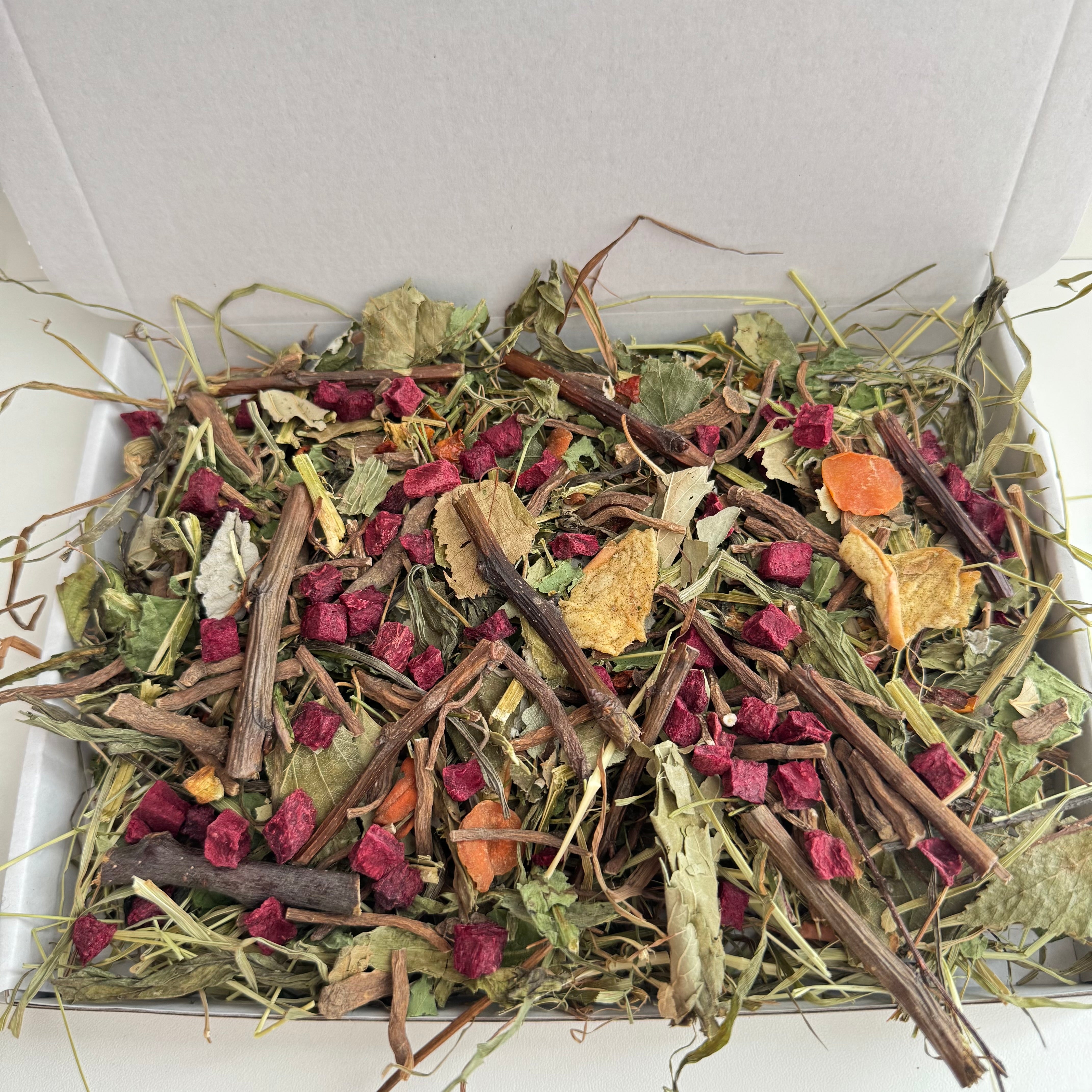 This yummy forage box is packed with all things autumn! A base of timothy hay is layered with our Hop Into Autumn forage blend and topped with pear sticks, dandelion root, and beetroot for a tasty, seasonal treat your rabbit or small pet will love.