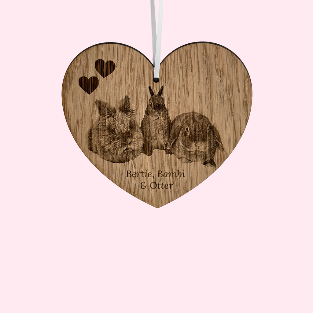 Keep the ones you love most close to your heart with this beautiful Wooden Heart Ornament. Your rabbits' photo is engraved into natural wood, surrounded by delicate hearts and personalised with your buns' names to create a special keepsake.