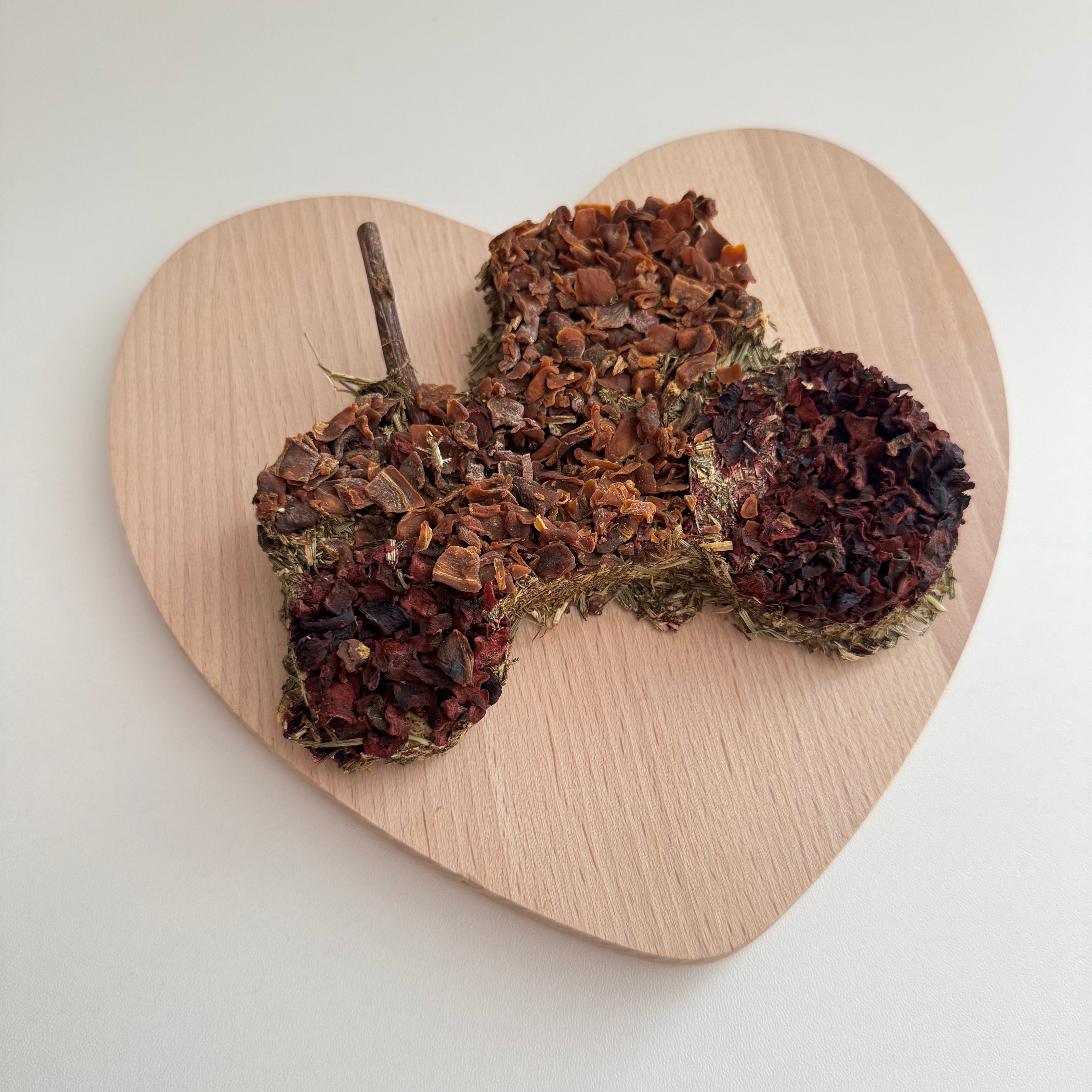 Composition: Grass, Timothy Hay, Dandelion, Peas, Pumpkin, Beetroot, Carrot & Edible Vegan Binder