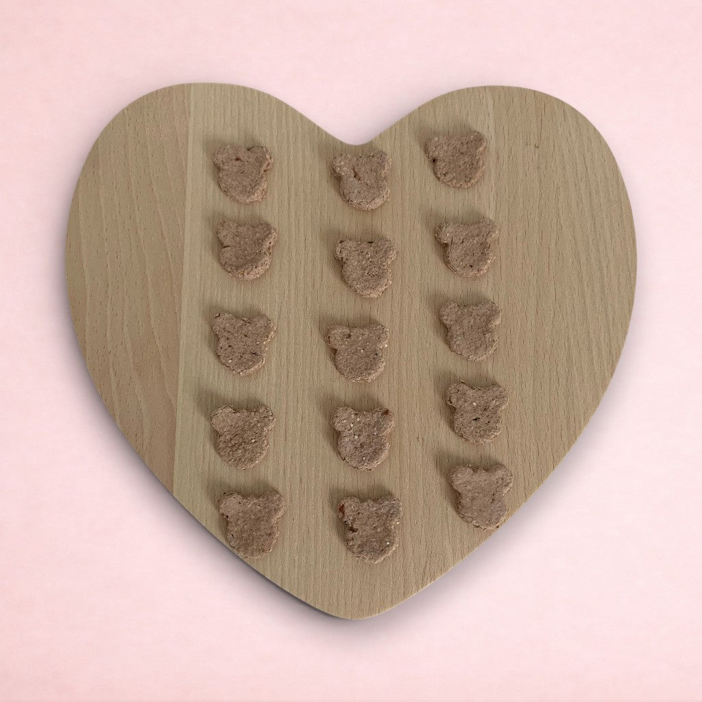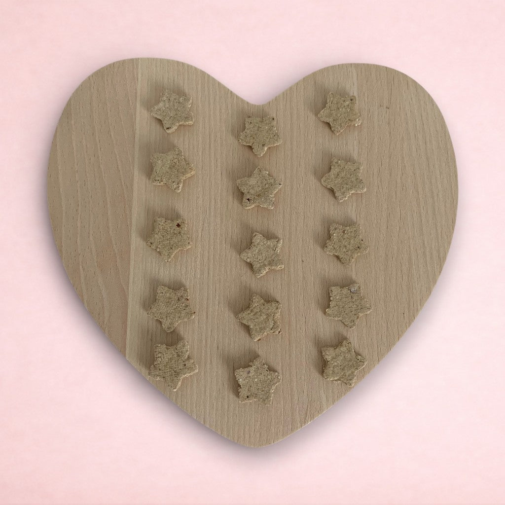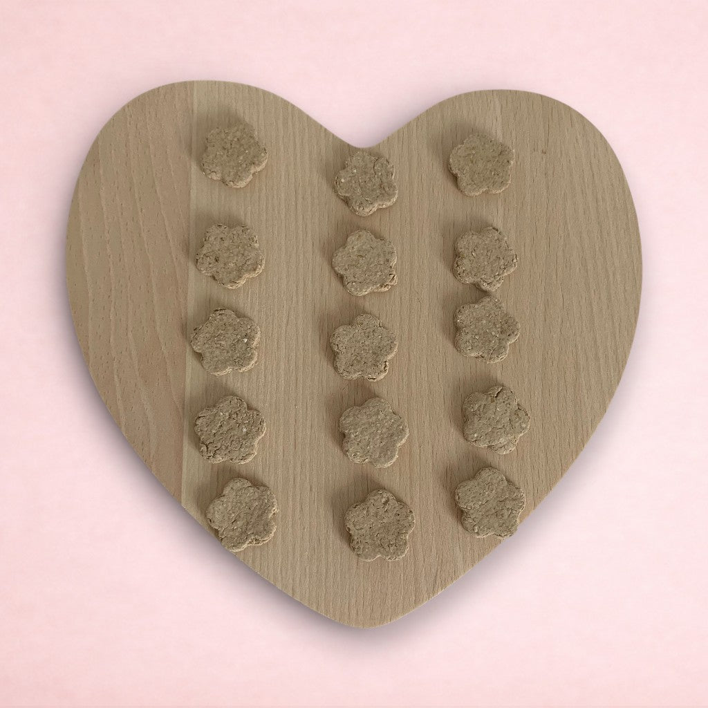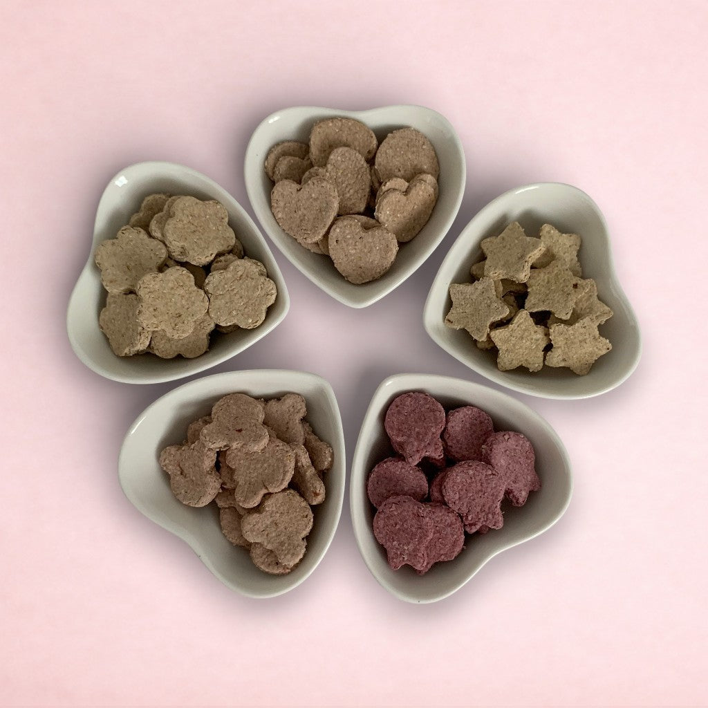 Our treats come in a variety of shapes and flavours, and are completely homemade, so sizes and shapes may vary slightly. What's more, all of our treats are made from completely natural ingredients, including oats. You won't find any artificial additives, colourings or preservatives here!
