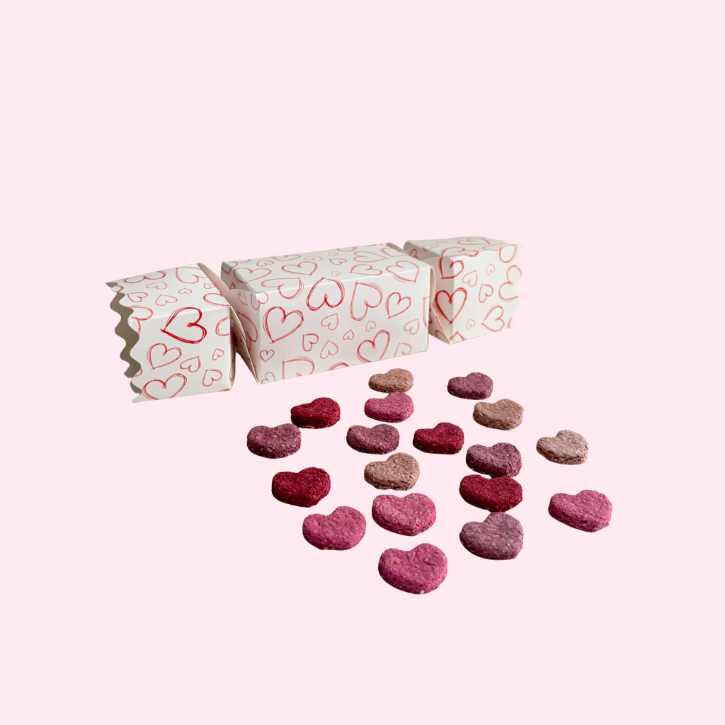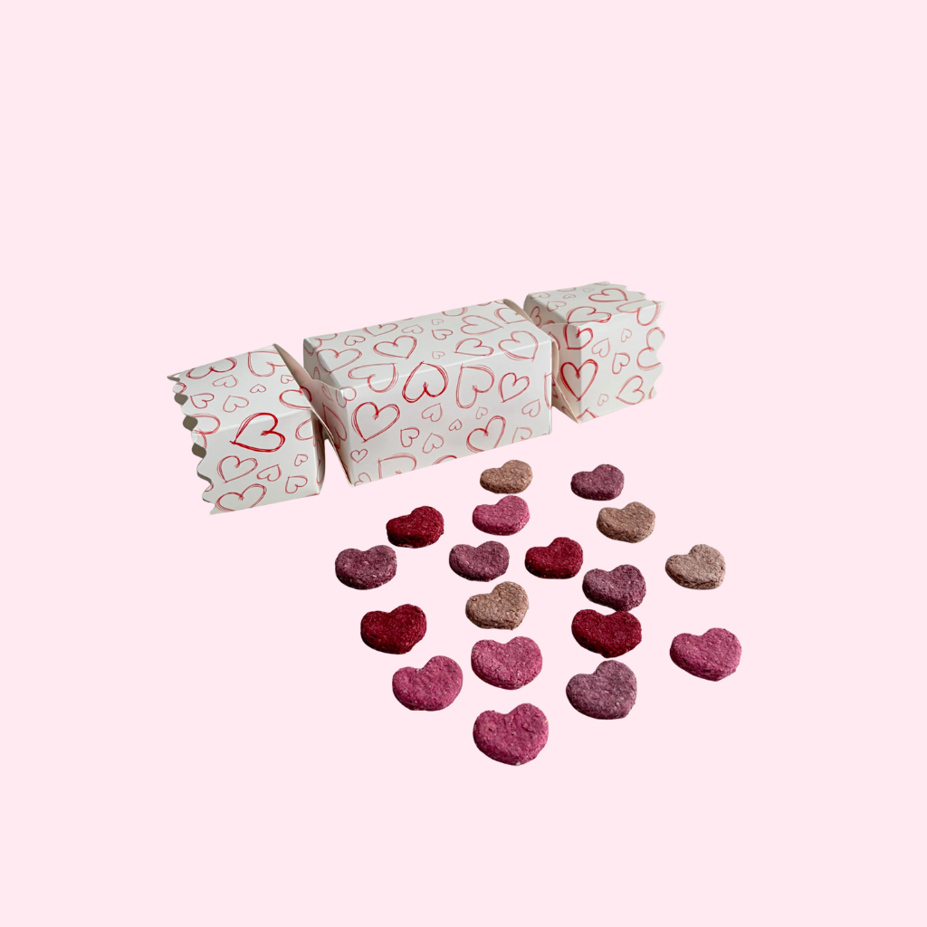Treat your beloved pet to our premium heart cracker this Valentine's. Each cracker includes a bag of twenty heart shaped oat treats in a variety of the following flavours - Strawberry, Beetroot, Raspberry, & Dragon Fruit.