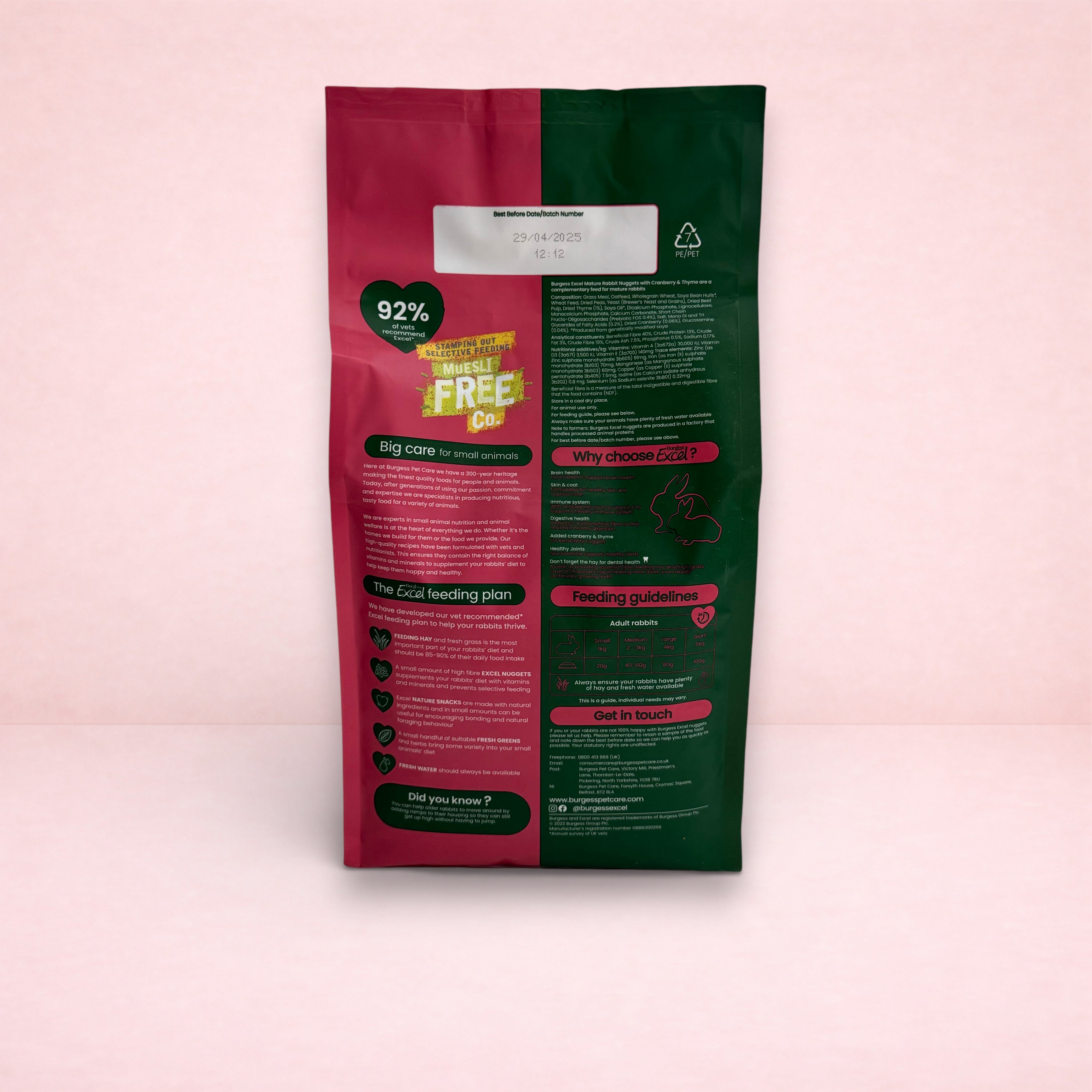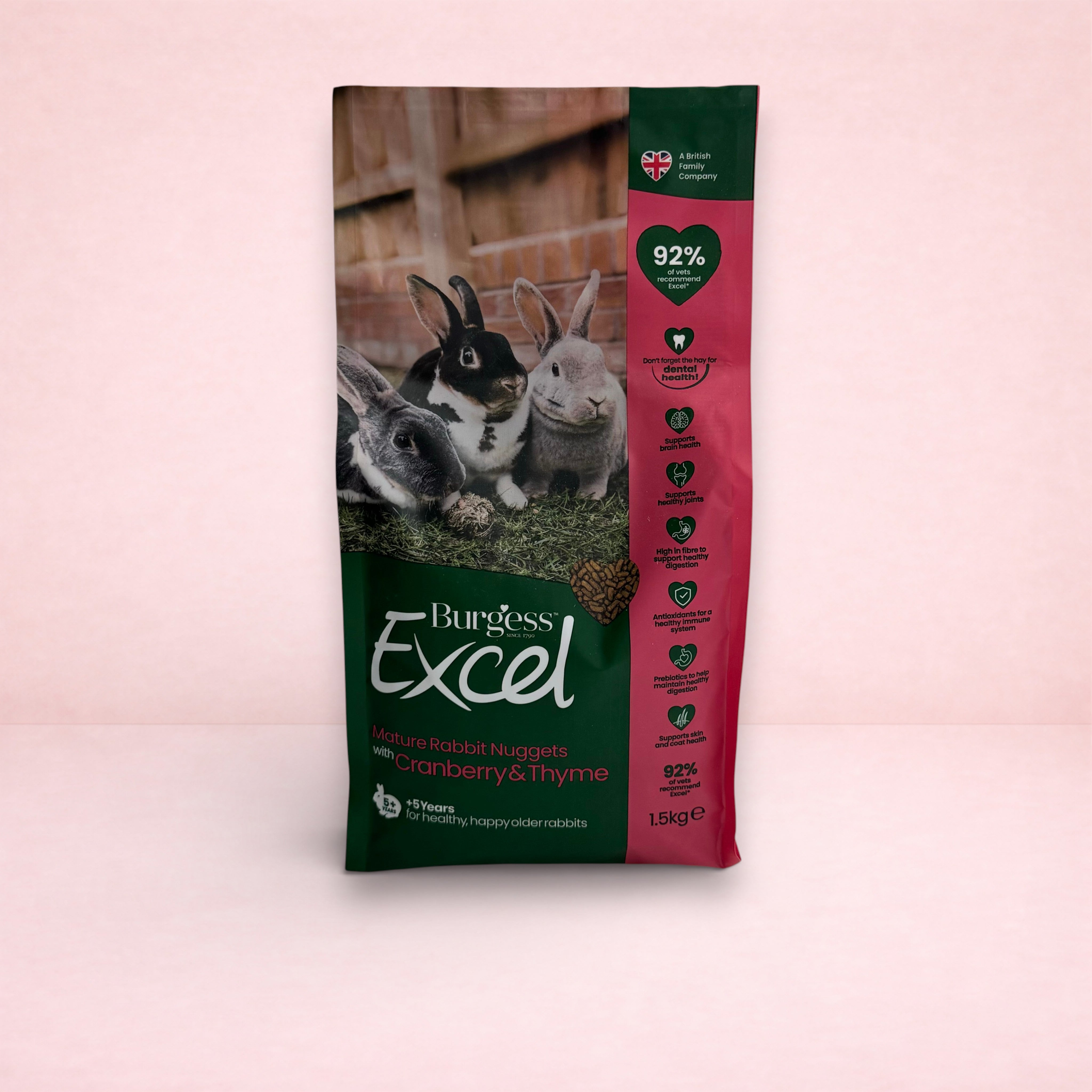 Burgess Excel Mature Rabbit Food is delicious, high fibre pellets with Cranberry & Thyme. Supplement your rabbits’ diet with vitamins and minerals and prevent selective feeding. Suitable for older rabbits aged 5 years+