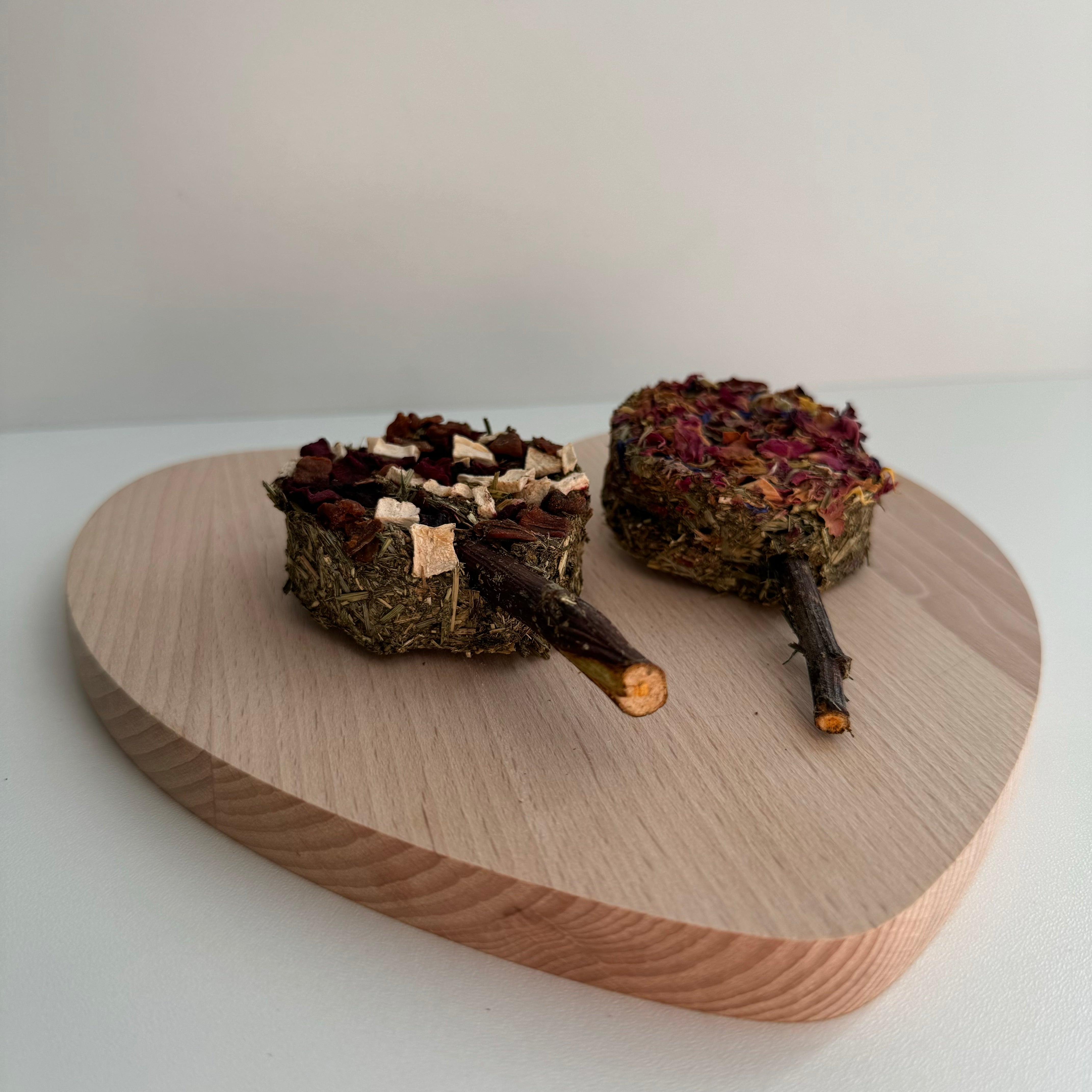 Treat your small pet with these Flower & Veggie Lollipops, made from Dried Grass and Botanicals. Offered in two flavours, Premium Flower Mix or Parsnip, Beetroot and Carrot. These lollies provide essential nutrients and promote healthy teeth. With natural ingredients and an Applewood stick, it's a delicious and nutritious treat for all small animals.