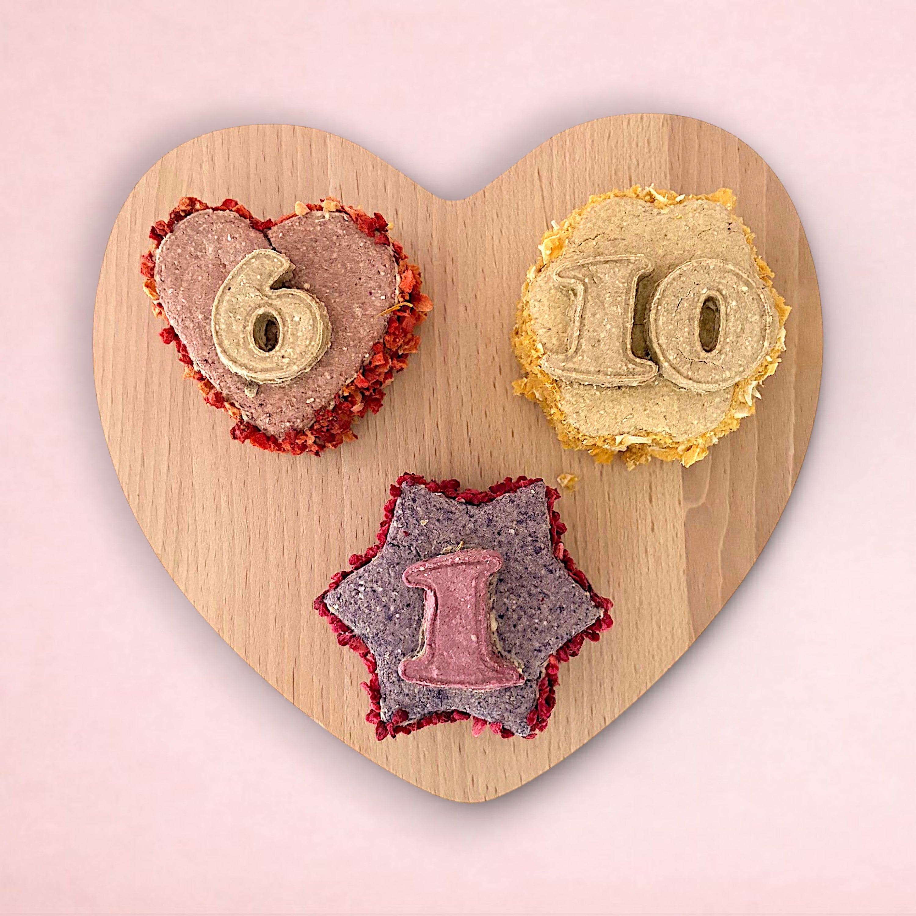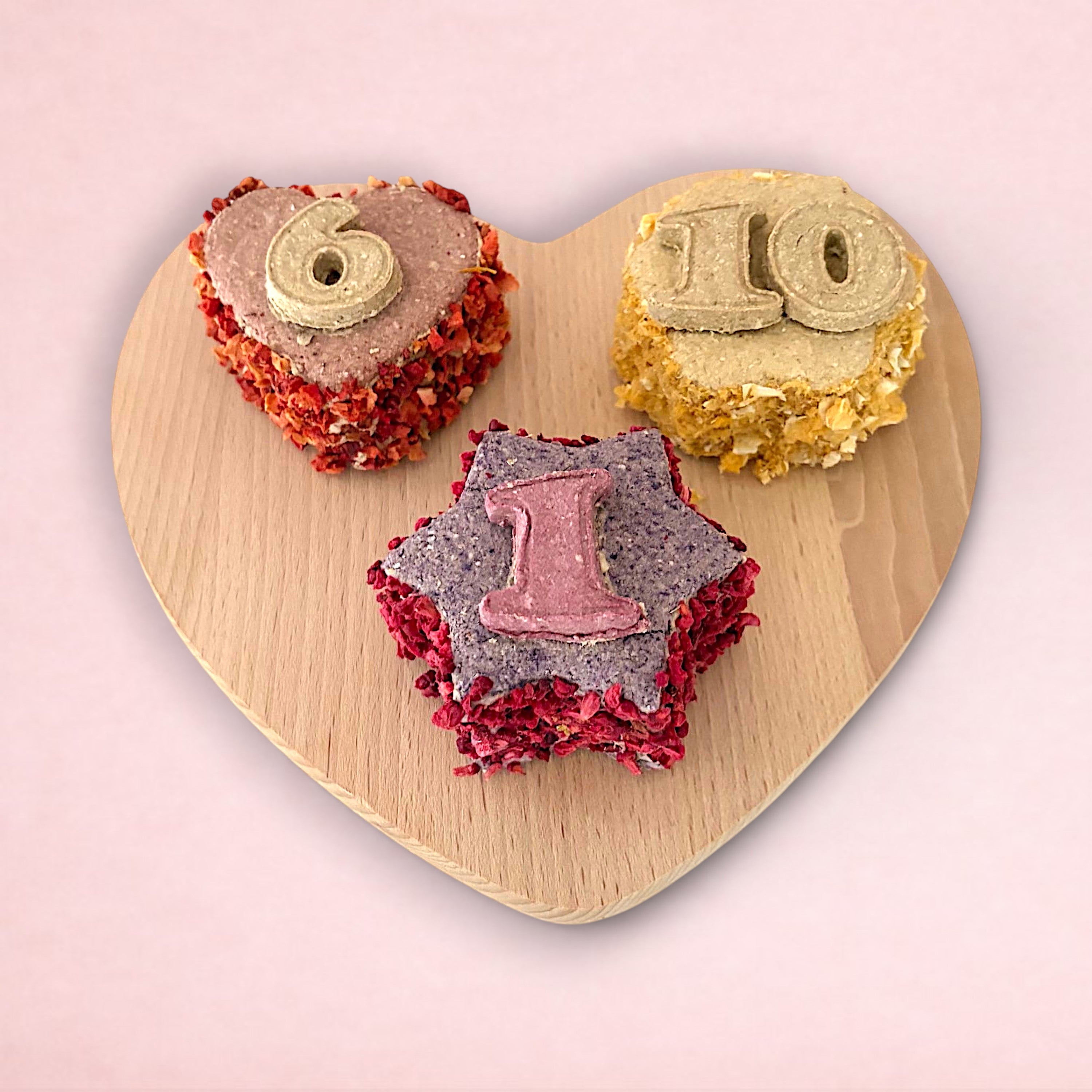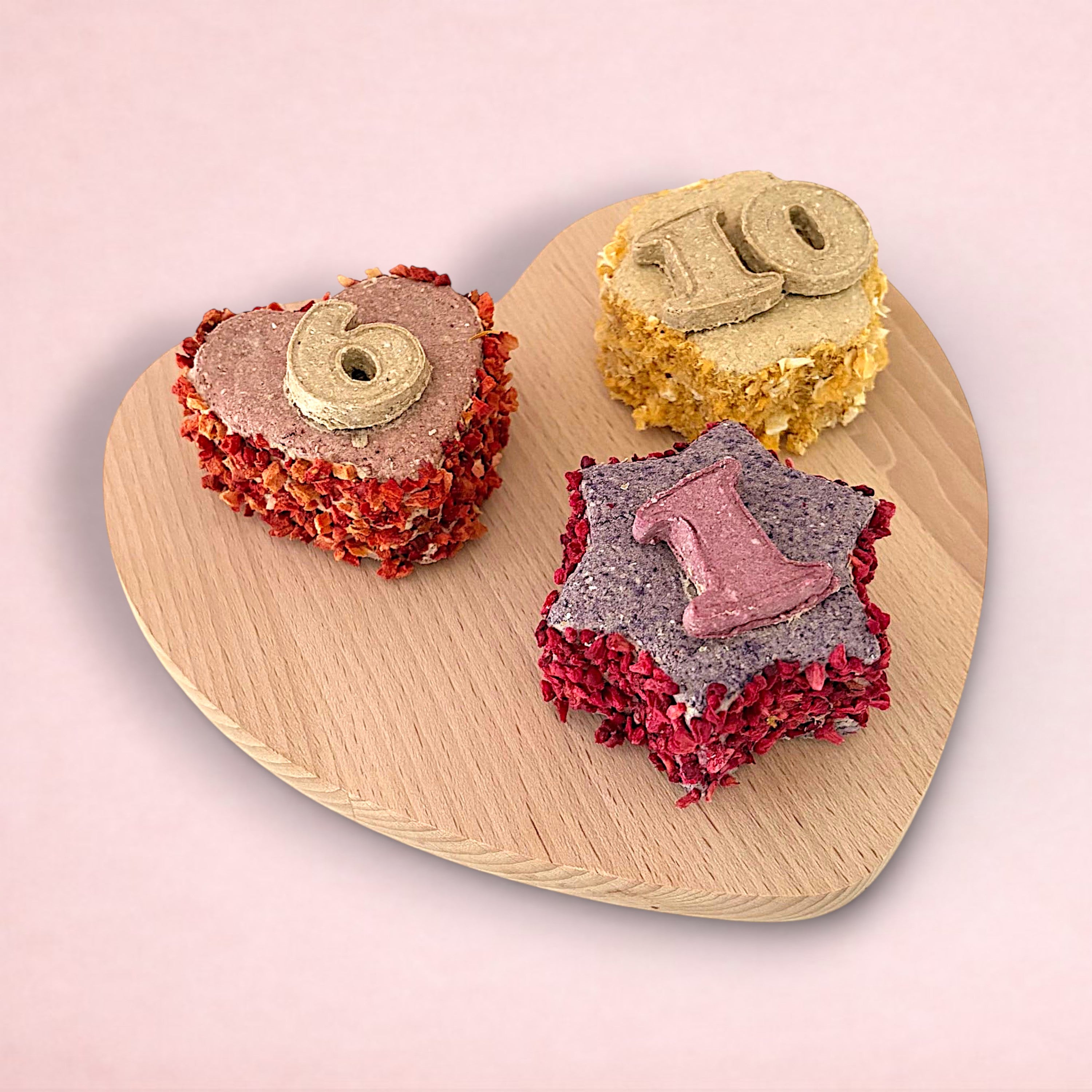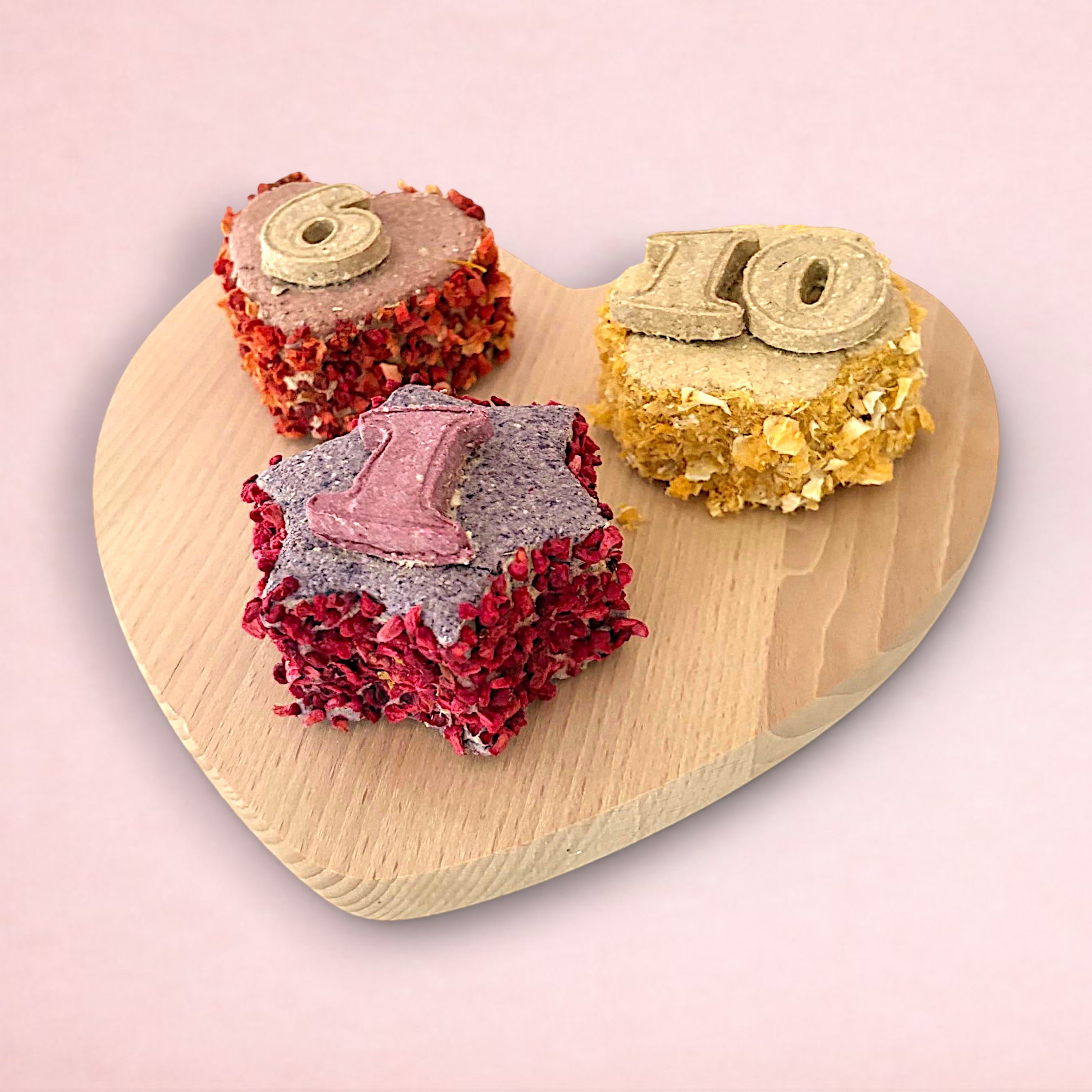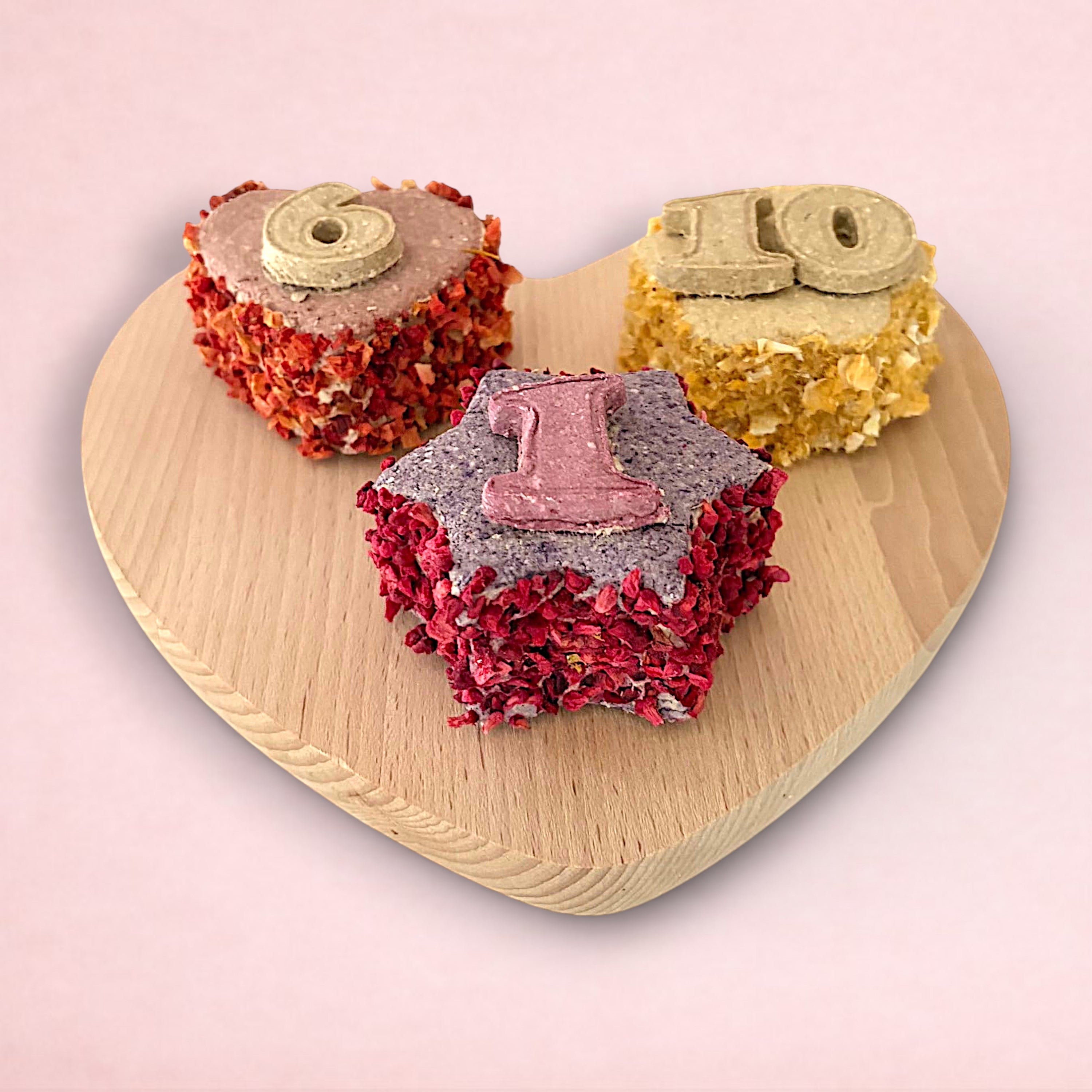 With four optional shapes, multiple flavours, and a fruit coating for added taste, our cakes are the perfect way to celebrate your pet's special day. Each cake is personalised with your pet's age and carefully packaged in a cupcake box for safe transport and that added touch of specialness.