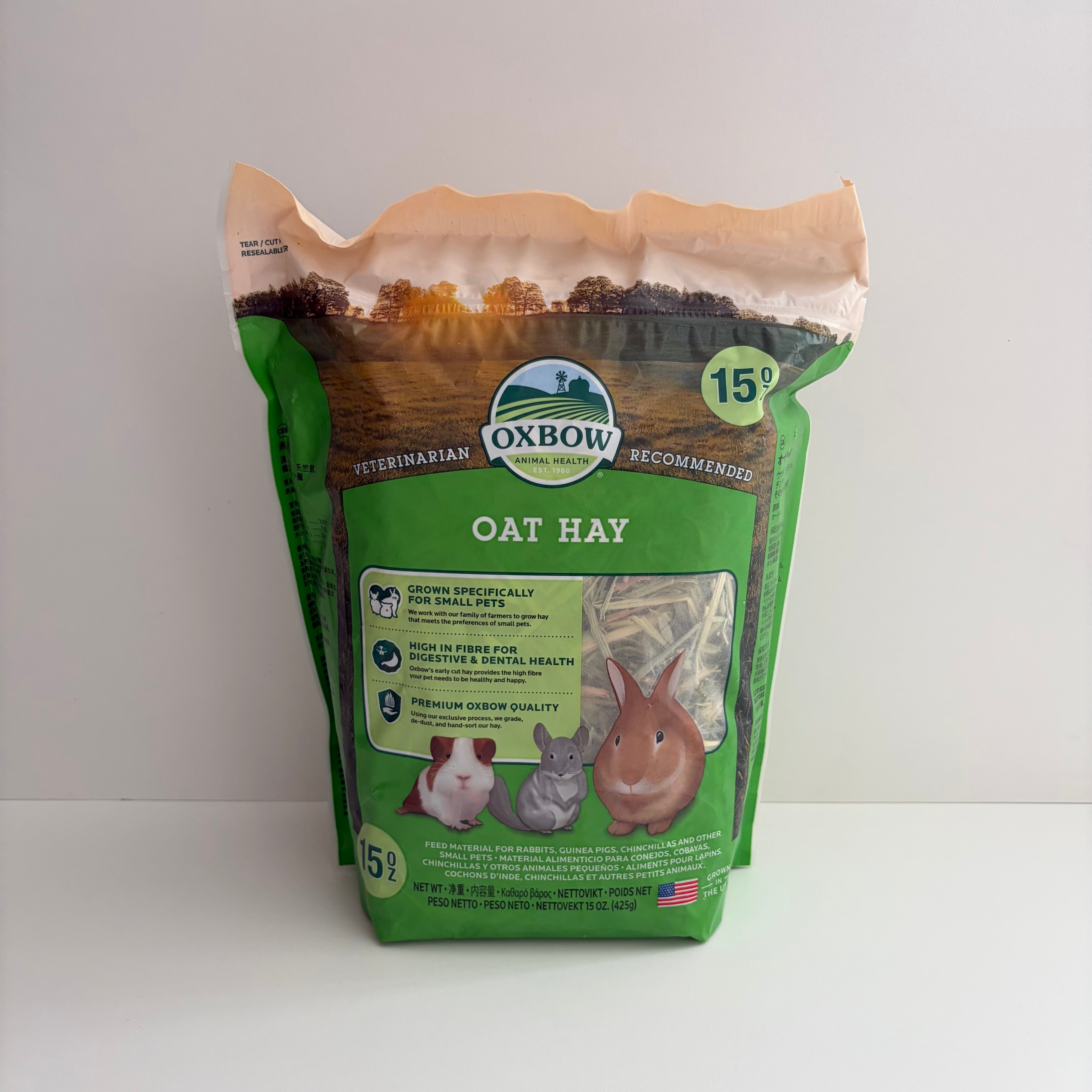 Oxbow Oat Hay is a delicious, high-fibre hay that’s low in carbohydrates, protein, and calcium — making it an excellent choice for rabbits and other small pets. It offers a unique texture and taste compared to timothy hay, thanks to its combination of leafy fibre, thick stems, and immature oat grains in the seed heads. Oat Hay not only supports healthy digestion but also adds welcome variety to your rabbit’s daily diet.