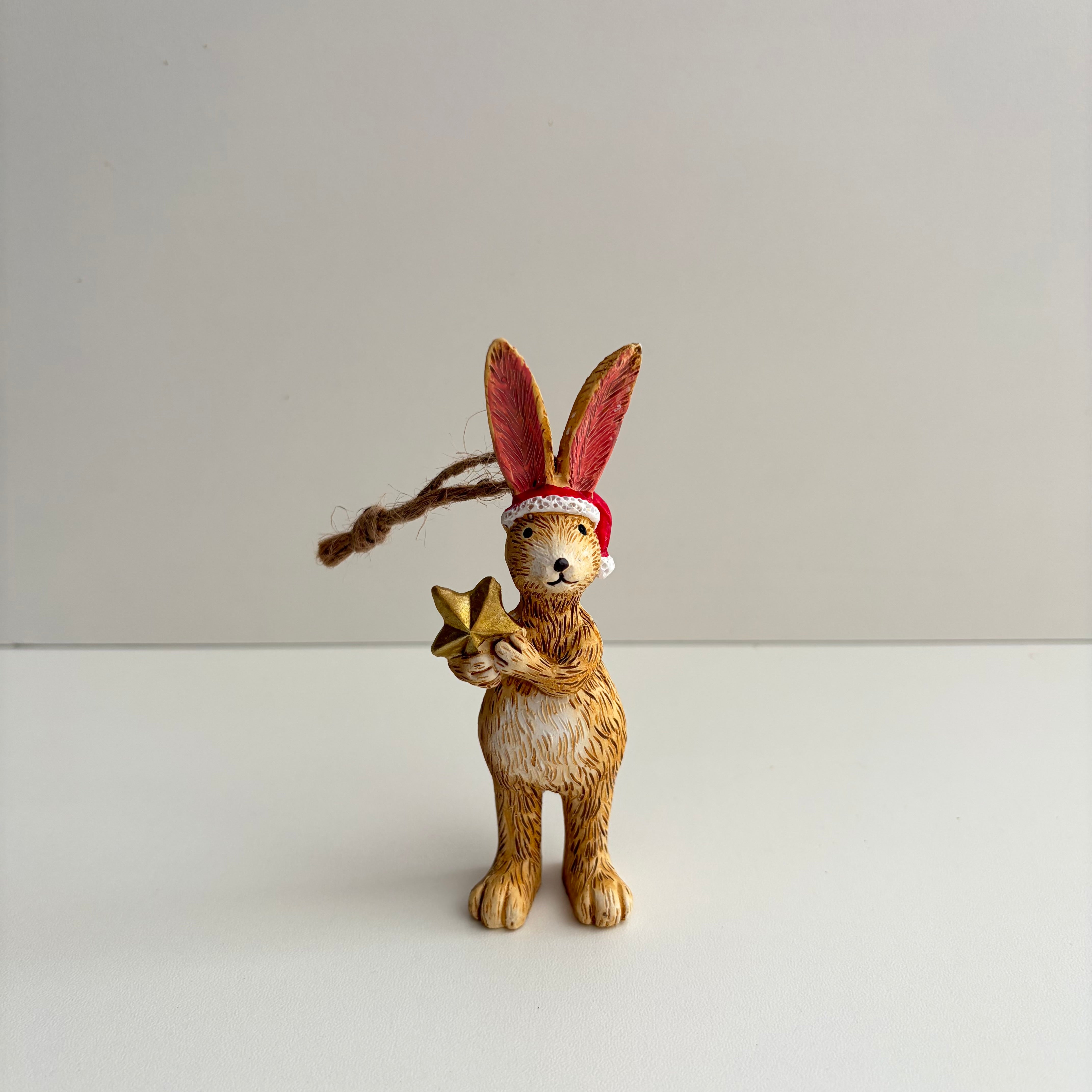 A cute, handmade Festive hanging ornament featuring a Festive bunny holding a Christmas star. Makes a lovely addition to seasonal displays.