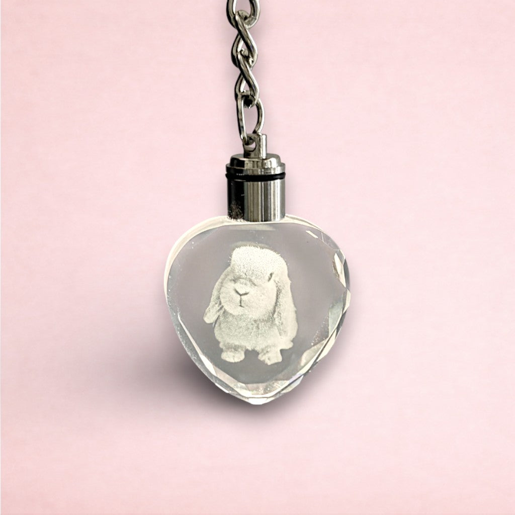 Keep your beloved bunny close to your heart wherever you go with this personalised Heart LED Photo Crystal Keyring. Made from premium glass crystal with a sturdy metal keychain, this beautiful keepsake features your rabbit's photo captured in stunning 3D laser engraving.