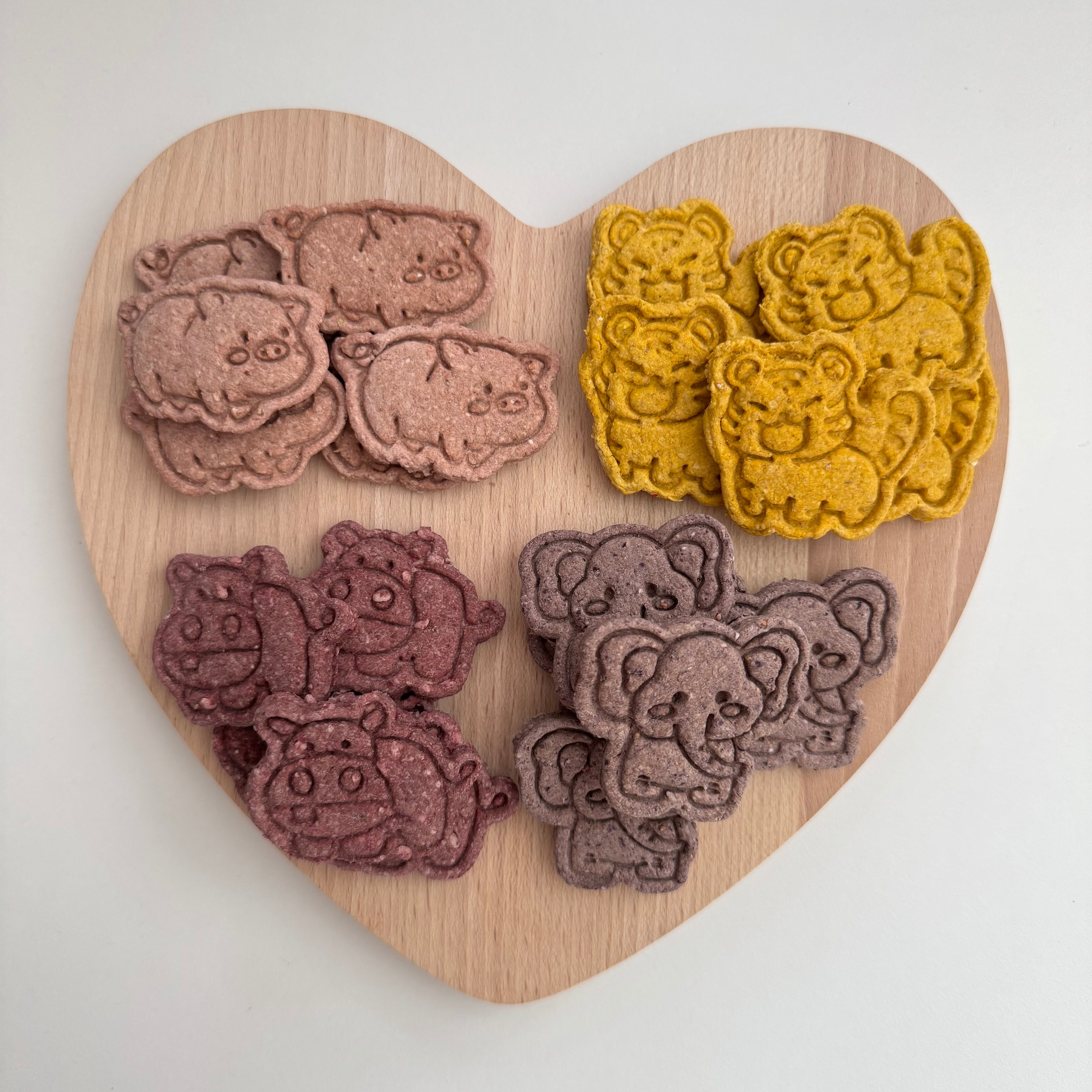 Each bundle includes four packs of 6 medium-sized oat treats, in our Carrot Tiger, Strawberry Pig, Blueberry Elephant & Blackberry Hippo shapes. Treat sizes and shapes may slightly vary due to being handmade.